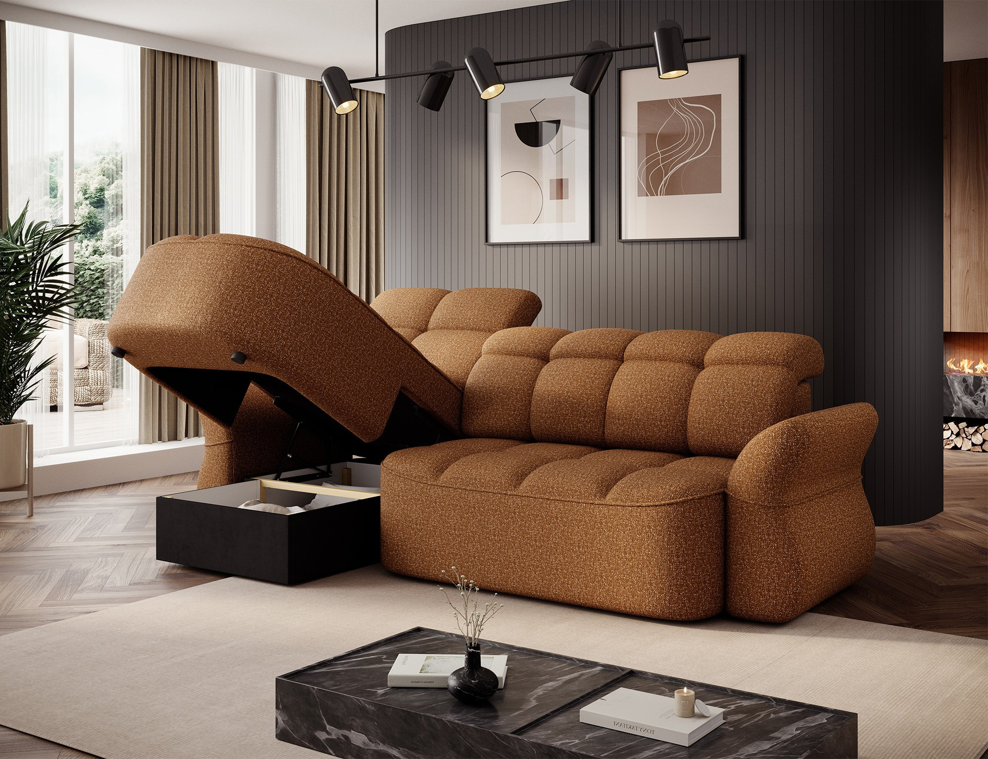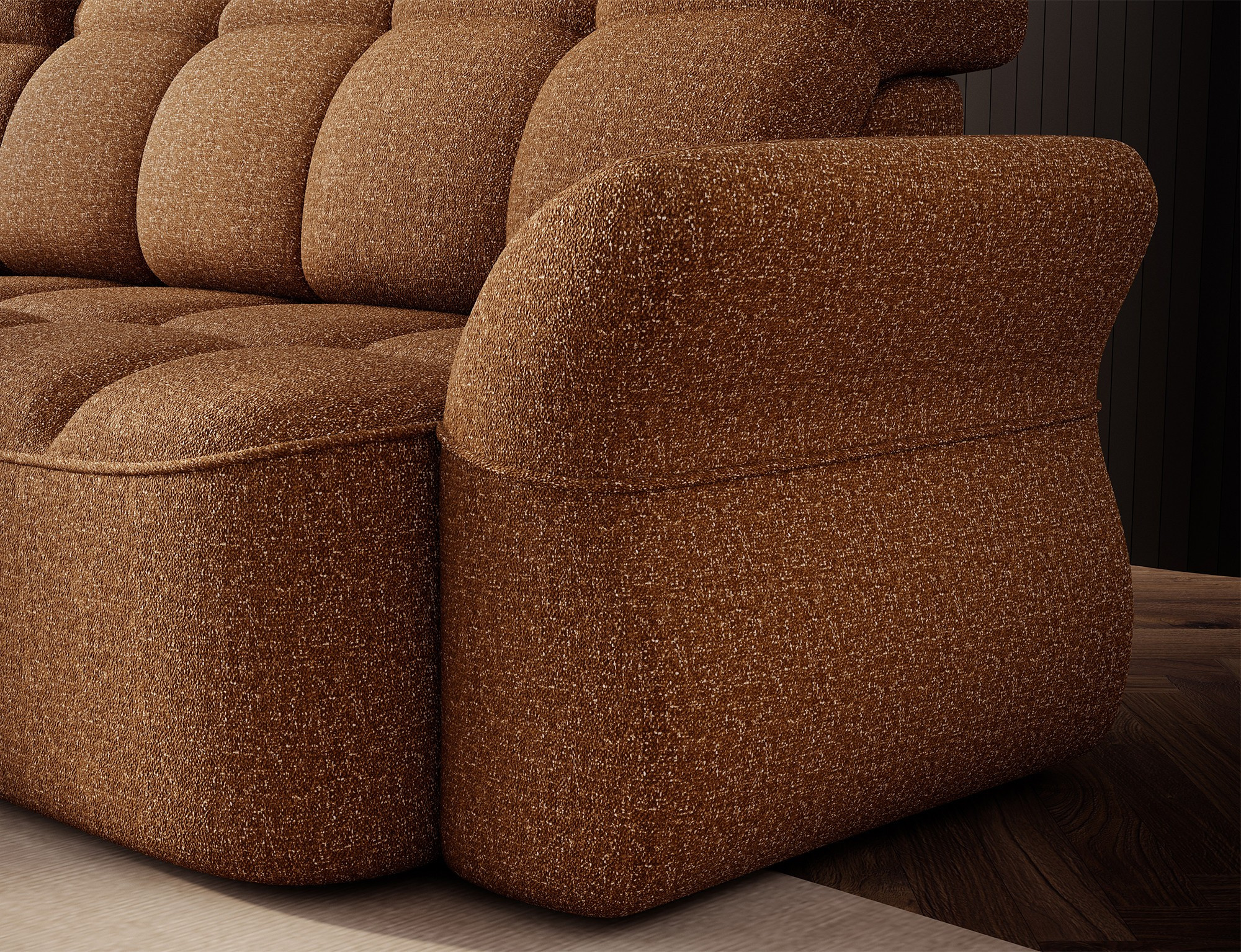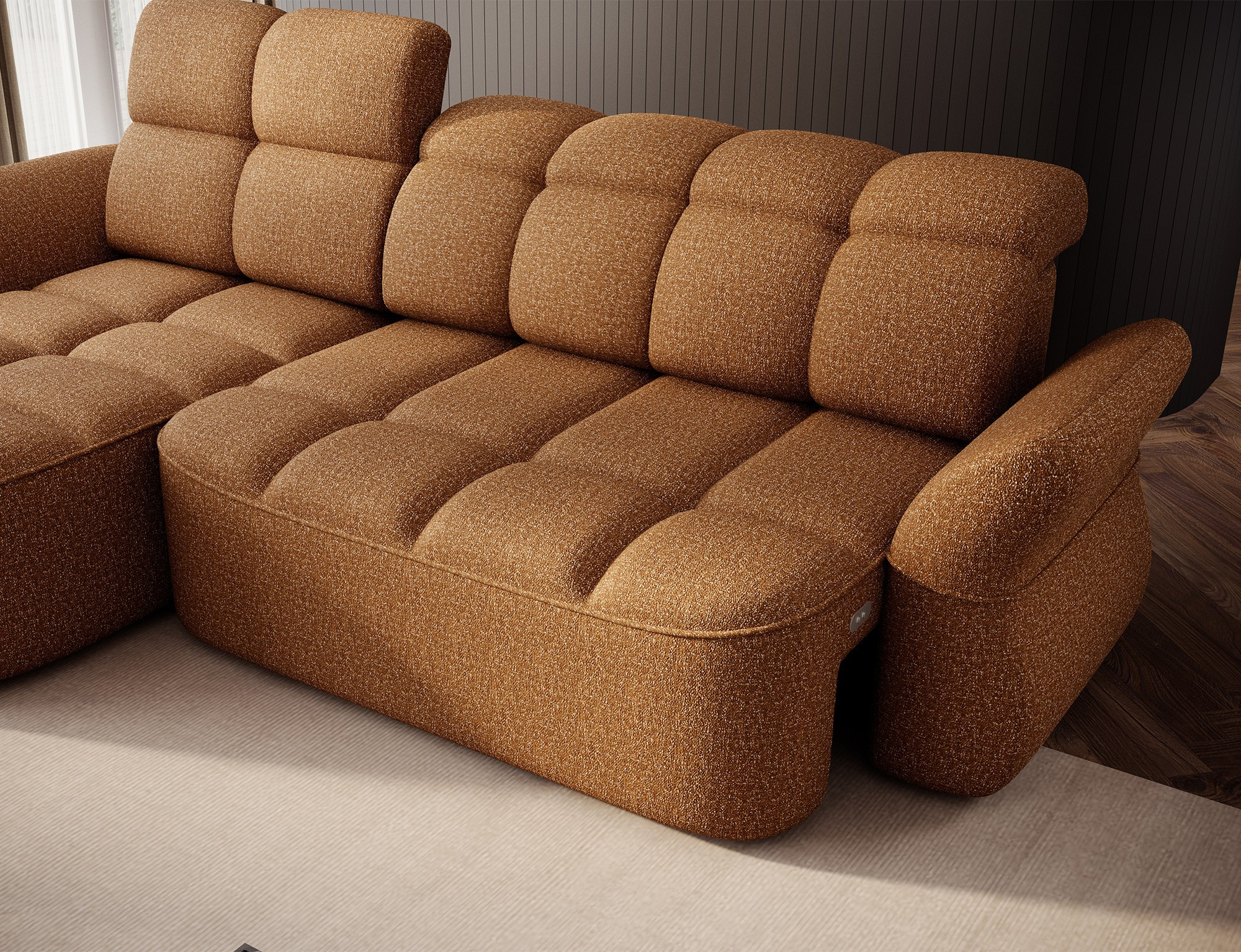 The Beneth corner sofa is the perfect blend of modern design and supreme comfort. Its spacious seat, filled with B-type wave springs and high-resilience HR3030 foam, offers the ideal balance between softness and support. The backrest, featuring an upholstery belt and T2315 polyurethane foam, adapts to your posture for ultimate relaxation. But Beneth is not just about looks – it’s packed with functionality. It comes with a sleeping function and a storage compartment, while the electric seat extension allows you to adjust the depth effortlessly. The fully upholstered back makes it a stunning centerpiece from every angle, and its sleek black plastic legs add a touch of lightness and modern elegance.