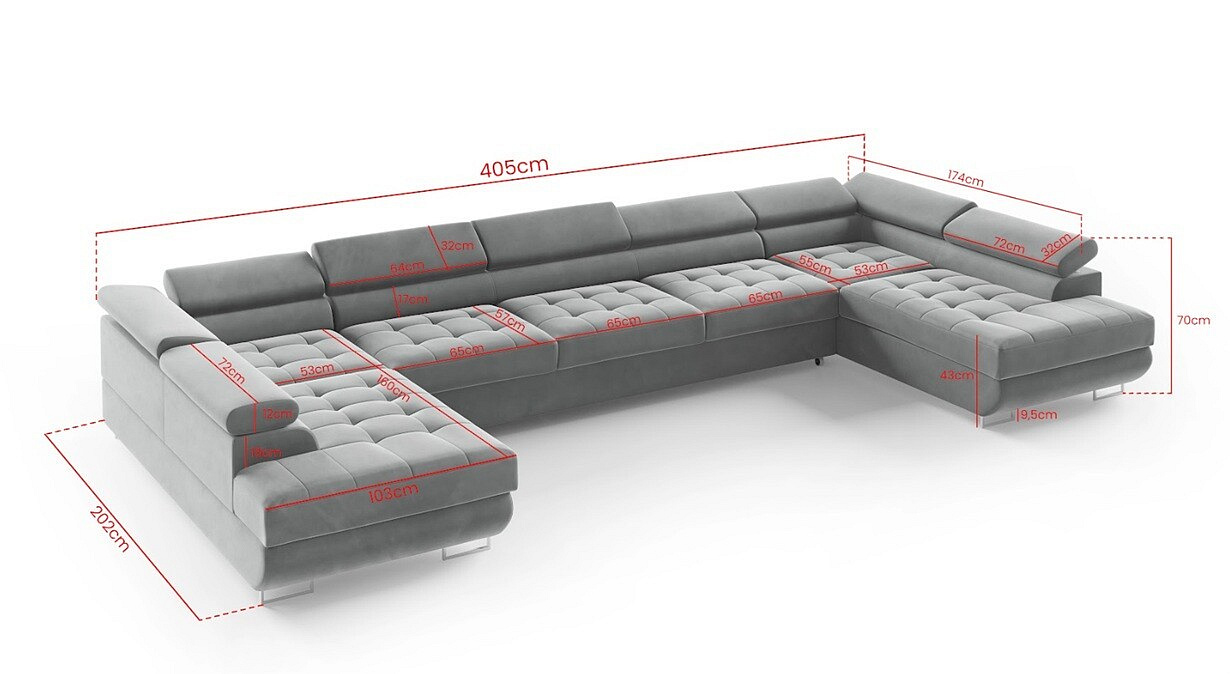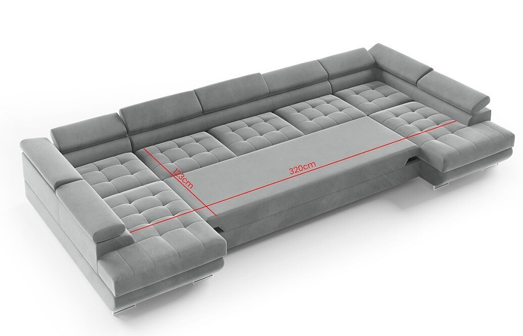 Ez az ülőgarnitúra nem csak a megjelenésről szól. Fel van szerelve egy kihúzható funkcióval, amely könnyedén átalakítja a kanapét egy tágas ággyá, amelynek fekvőfelülete 320 x 123 cm. Ez ideális vendégek számára vagy azoknak, akik kényelmes pihenésre vágynak. Ráadásul, a két tárolóhellyel elegendő hely áll rendelkezésre takarók, párnák vagy más szükséges dolgok tárolására, ami segít tisztán és rendezett módon tartani a lakóteret.