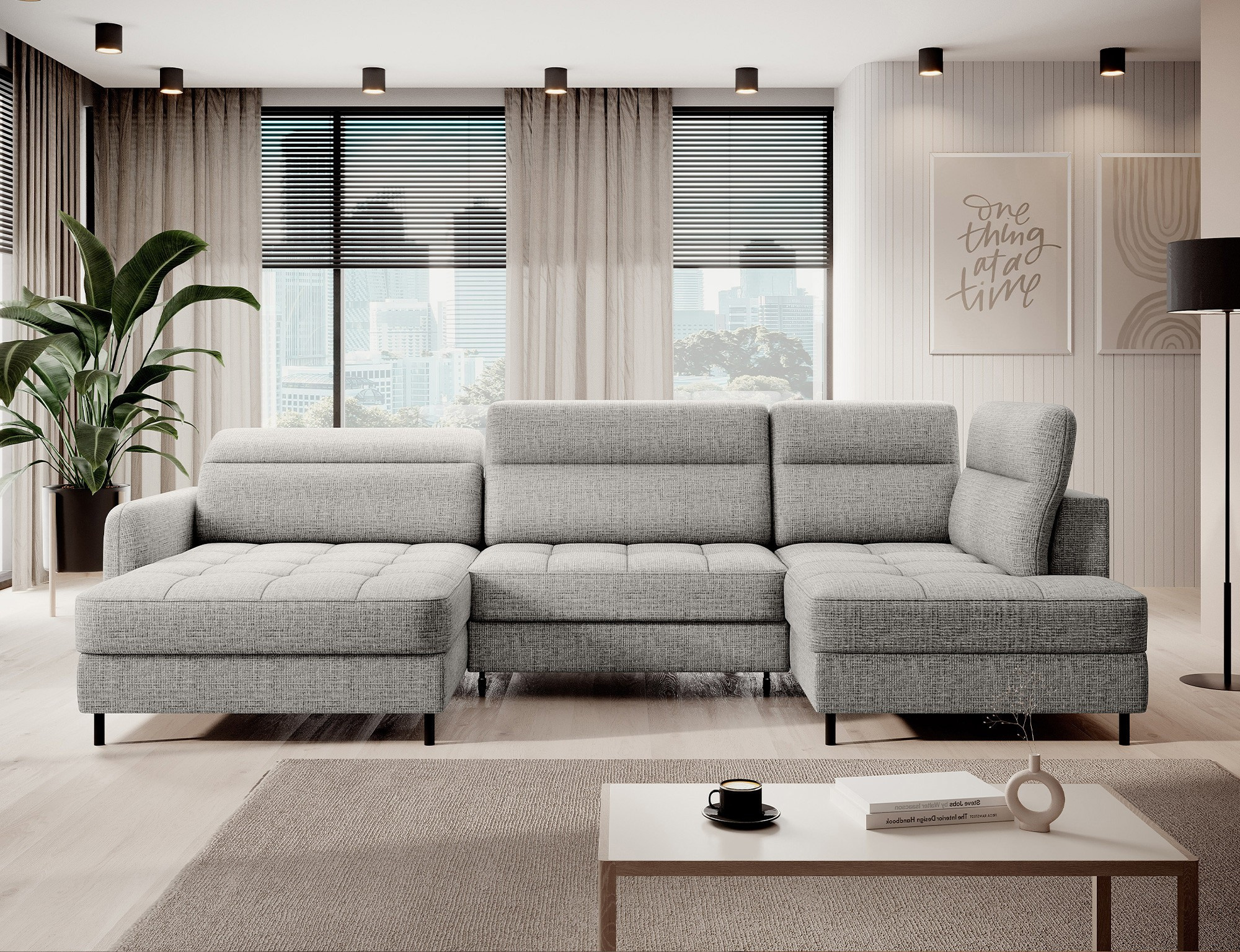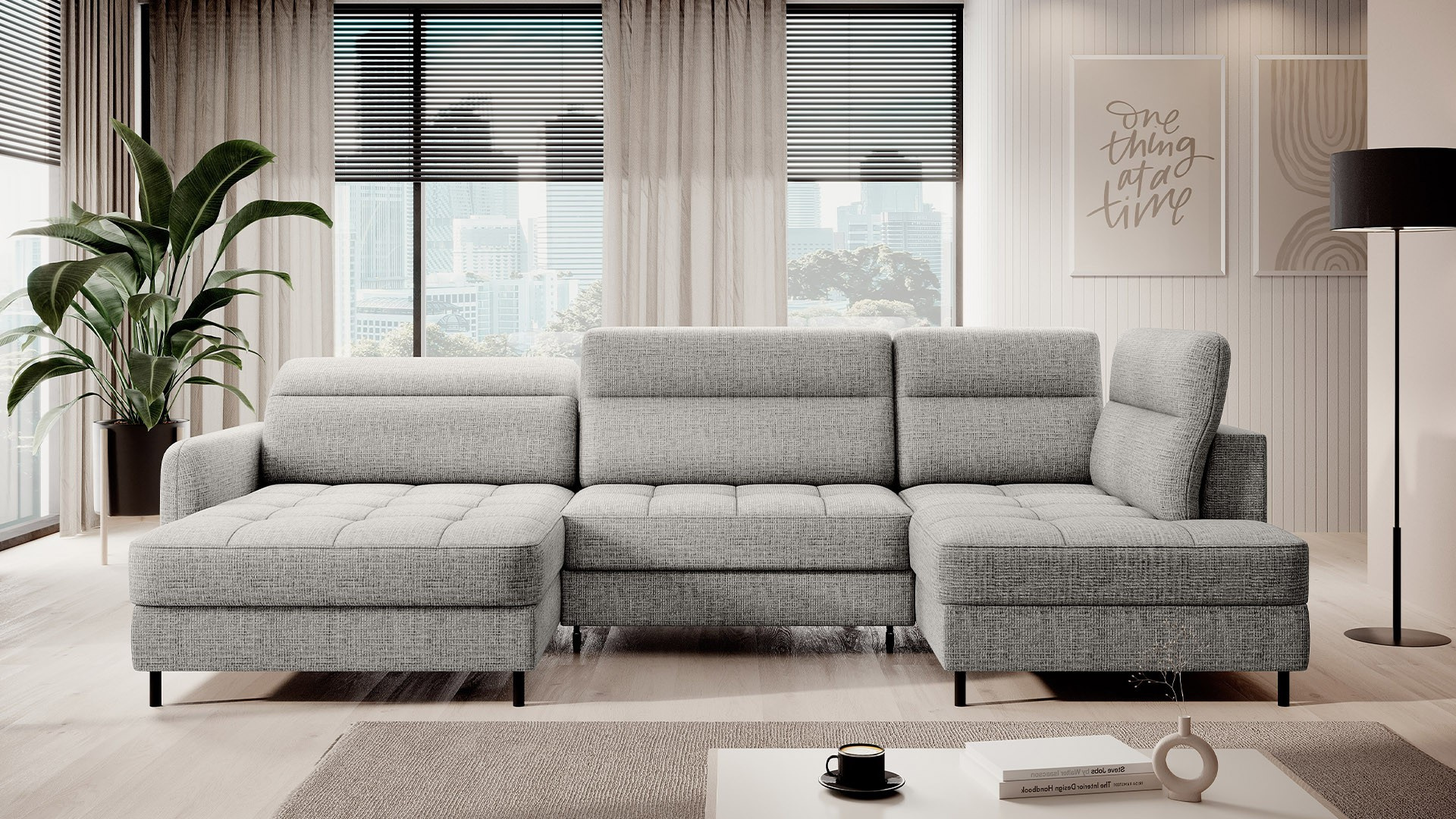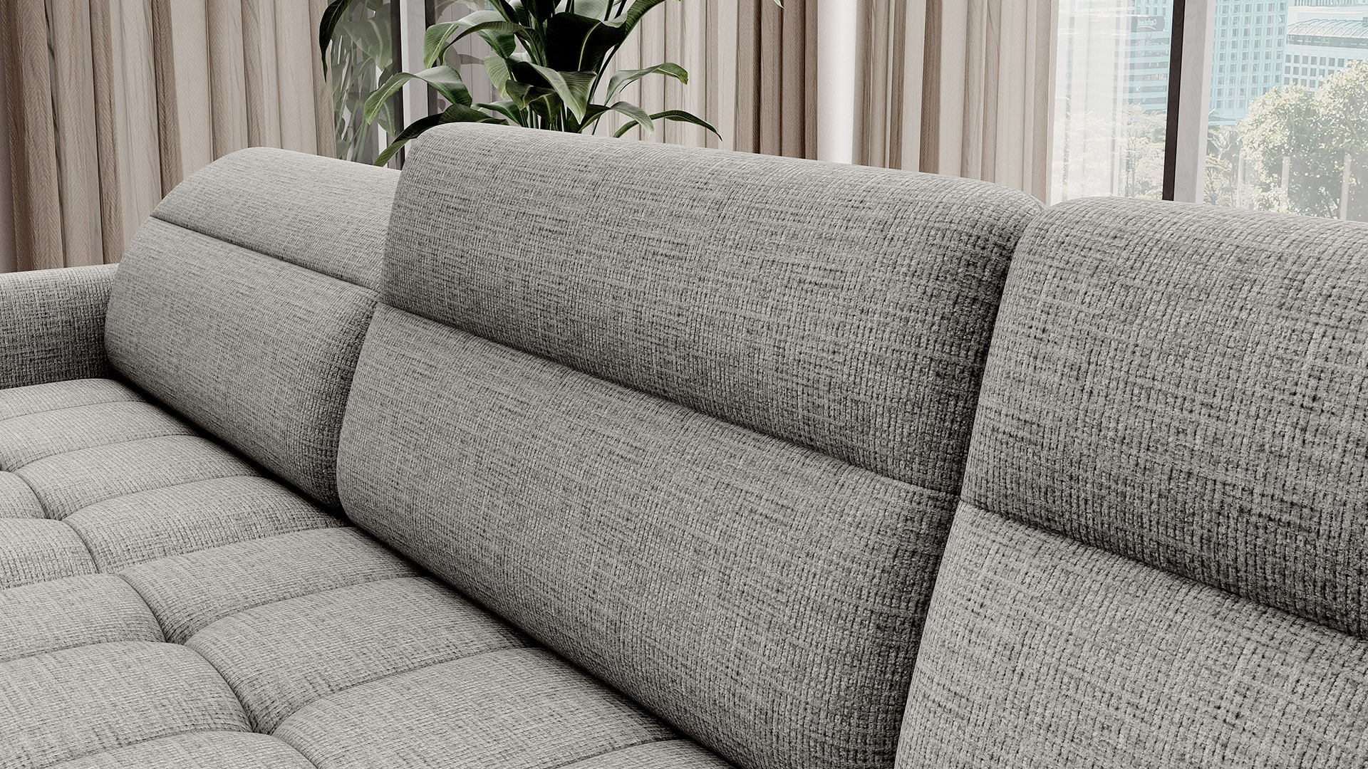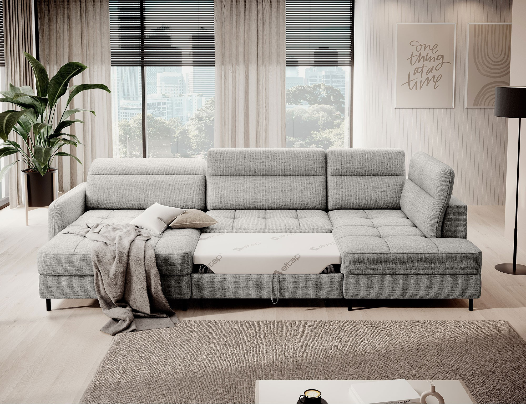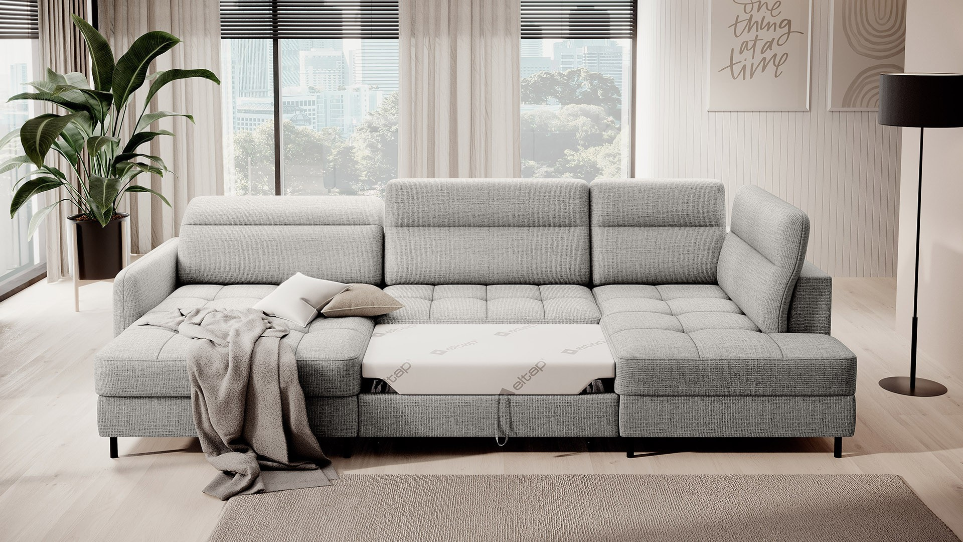 The Berrto corner sofa is an incredibly refined piece of furniture for your living room, designed to provide you with exceptional comfort and functionality. This elegant corner sofa combines modern design with the use of high-quality components. The Berrto corner sofa is equipped with wave springs of type B, which, in combination with high-elastic HR + T2130 foam, create a surface of unparalleled comfort. This piece of furniture is soft, flexible, and perfectly conforms to your body's shape, providing not only relaxation but also muscle relief. The use of upholstery straps and T2130 foam in the back of the Berrto corner sofa ensures its durability and resistance to deformations. You don't have to worry about unsightly wrinkles - this corner sofa will maintain its original appearance for many years. You can quickly and easily transform it into a comfortable bed, providing you and your guests with a restful night's sleep. Additionally, the corner sofa conceals a spacious storage compartment for bedding, providing ample space for all necessary textiles. The Berrto corner sofa offers not only comfort but also stability. With an impressive weight capacity of 390 kg, you can enjoy it for many years without worrying about its durability. The Berrto corner sofa stands out not only for its functionality but also for its aesthetic design. The black steel legs give it a modern character, and the elegant design makes it a standout element of your living room decor. The Berrto corner sofa is equipped with an easy-to-use Dolphin-type mechanism, allowing you to quickly transform it into a comfortable bed. This is the ideal solution when you need a sleeping space for guests. The Berrto corner sofa combines luxury, comfort, and functionality. Its high-quality craftsmanship and meticulous finishing make it not only the focal point of your living room but also a place for relaxation and spending time with friends and family.
