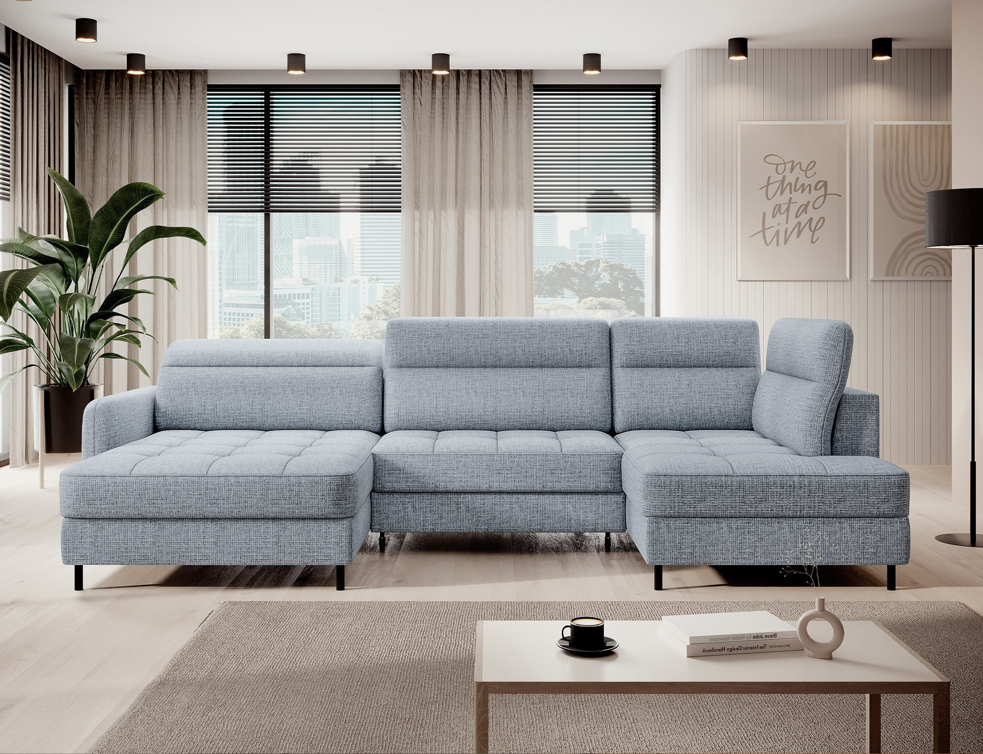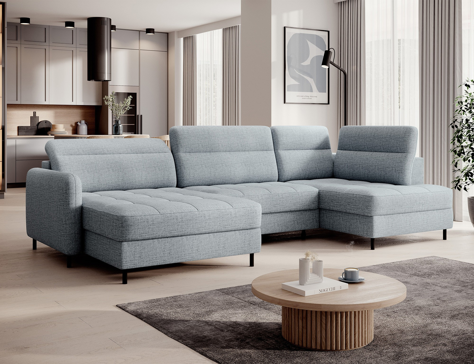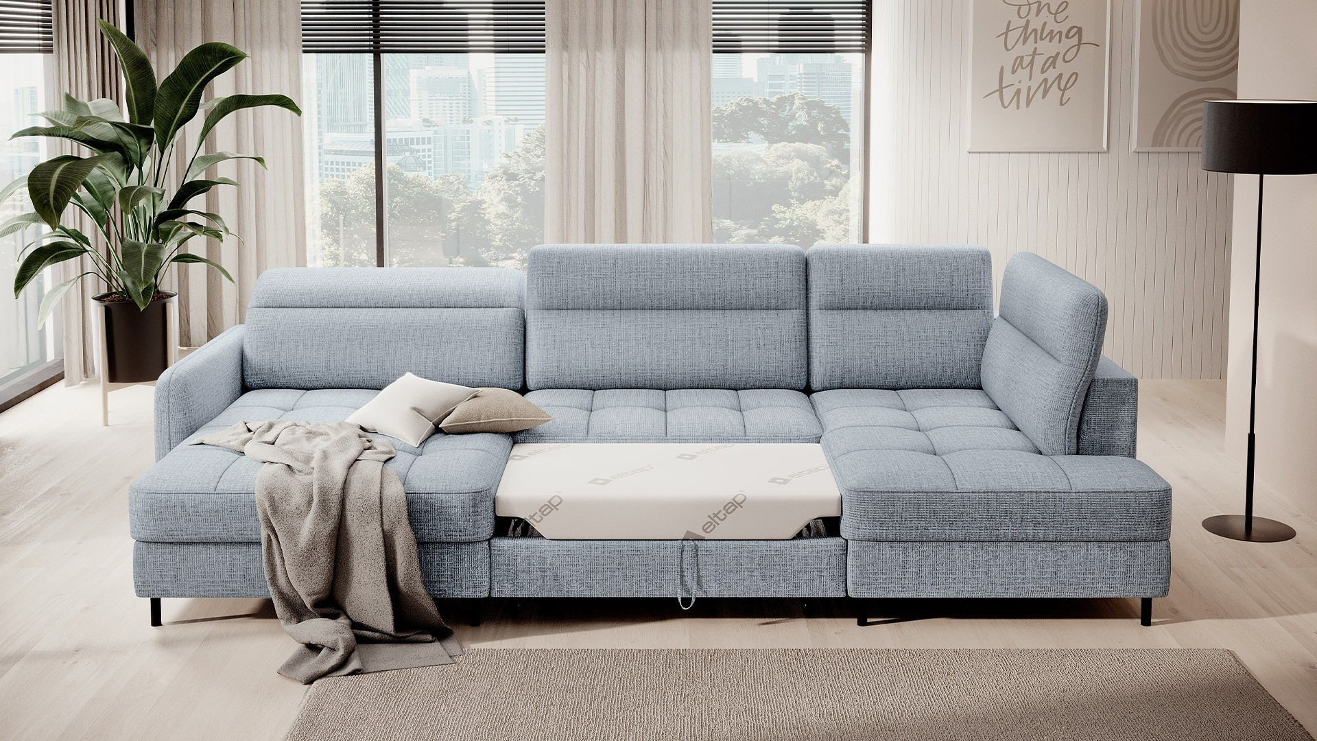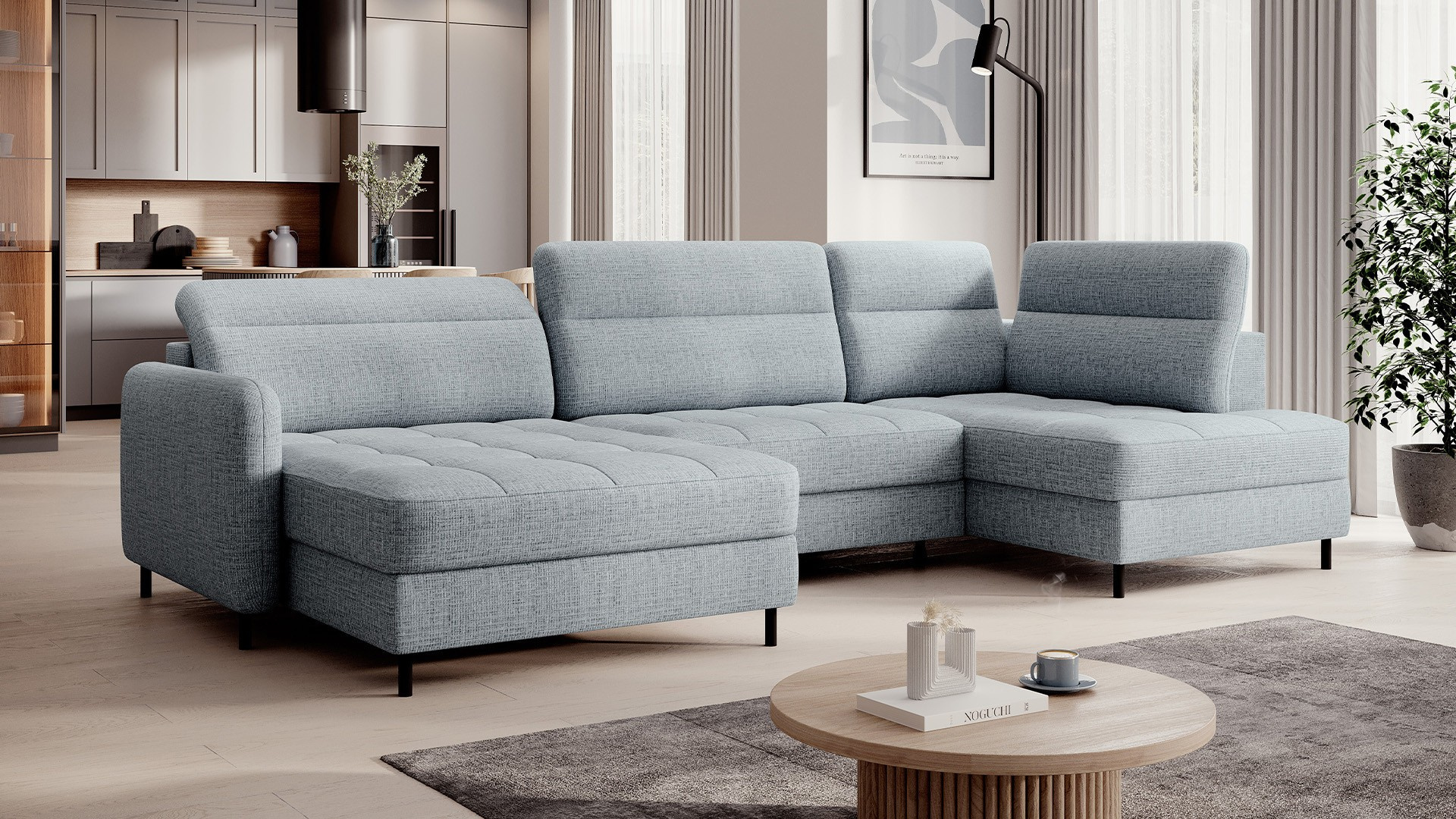 The Berrto corner sofa is an incredibly refined piece of furniture for your living room, designed to provide you with exceptional comfort and functionality. This elegant corner sofa combines modern design with the use of high-quality components. The Berrto corner sofa is equipped with wave springs of type B, which, in combination with high-elastic HR + T2130 foam, create a surface of unparalleled comfort. This piece of furniture is soft, flexible, and perfectly conforms to your body's shape, providing not only relaxation but also muscle relief. The use of upholstery straps and T2130 foam in the back of the Berrto corner sofa ensures its durability and resistance to deformations. You don't have to worry about unsightly wrinkles - this corner sofa will maintain its original appearance for many years. You can quickly and easily transform it into a comfortable bed, providing you and your guests with a restful night's sleep. Additionally, the corner sofa conceals a spacious storage compartment for bedding, providing ample space for all necessary textiles. The Berrto corner sofa offers not only comfort but also stability. With an impressive weight capacity of 390 kg, you can enjoy it for many years without worrying about its durability. The Berrto corner sofa stands out not only for its functionality but also for its aesthetic design. The black steel legs give it a modern character, and the elegant design makes it a standout element of your living room decor. The Berrto corner sofa is equipped with an easy-to-use Dolphin-type mechanism, allowing you to quickly transform it into a comfortable bed. This is the ideal solution when you need a sleeping space for guests. The Berrto corner sofa combines luxury, comfort, and functionality. Its high-quality craftsmanship and meticulous finishing make it not only the focal point of your living room but also a place for relaxation and spending time with friends and family.