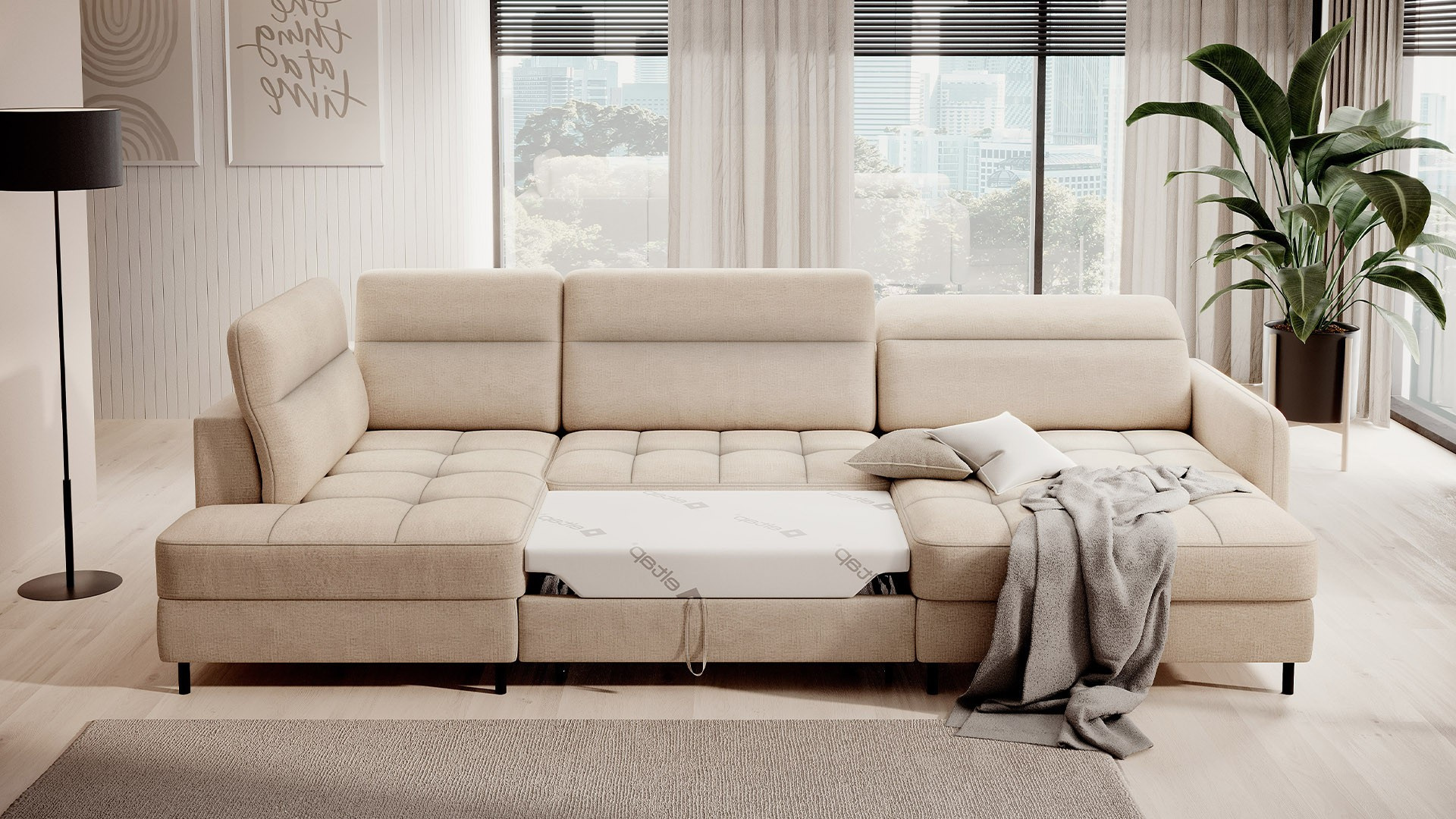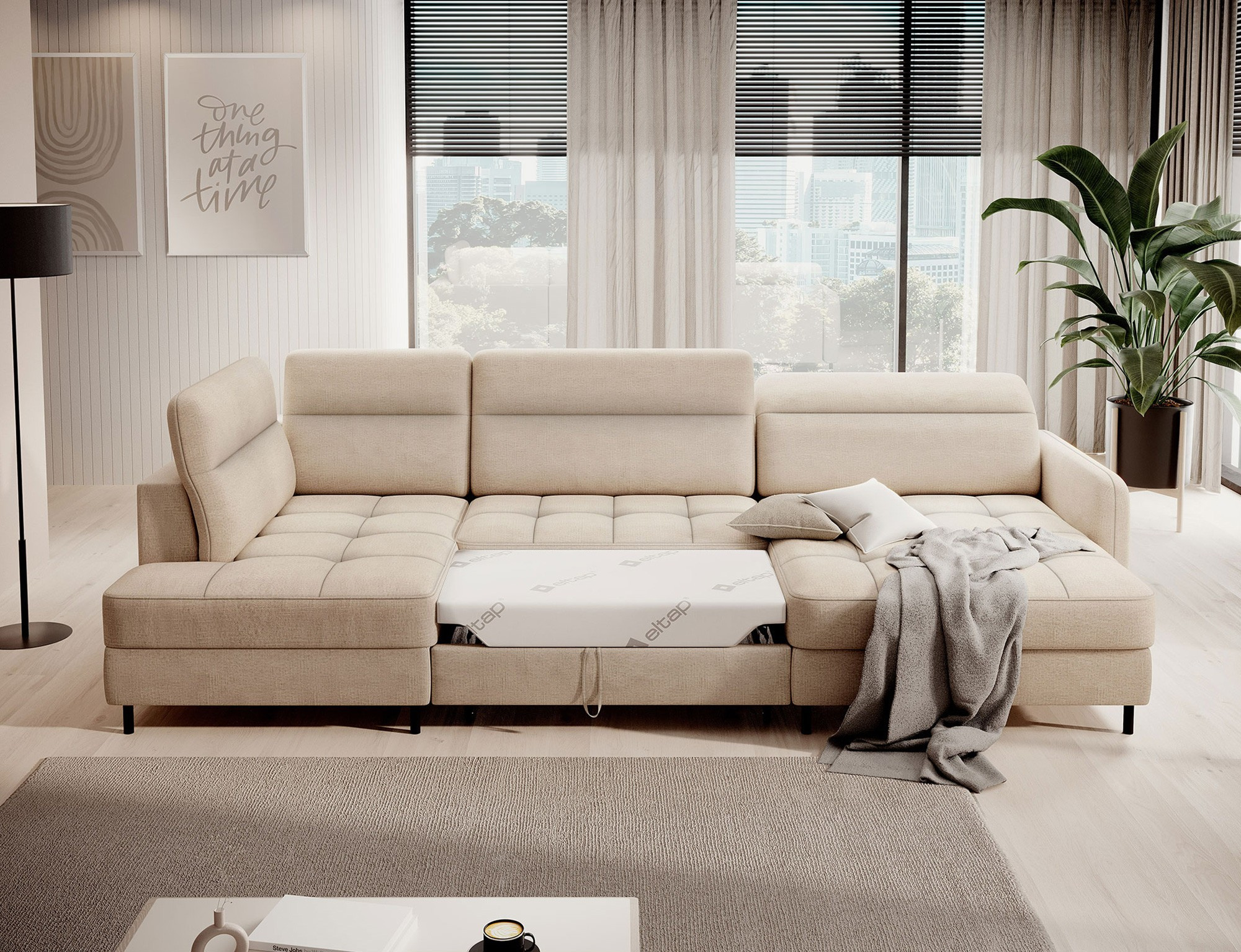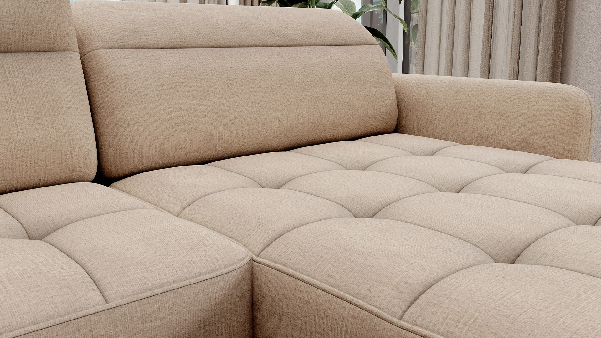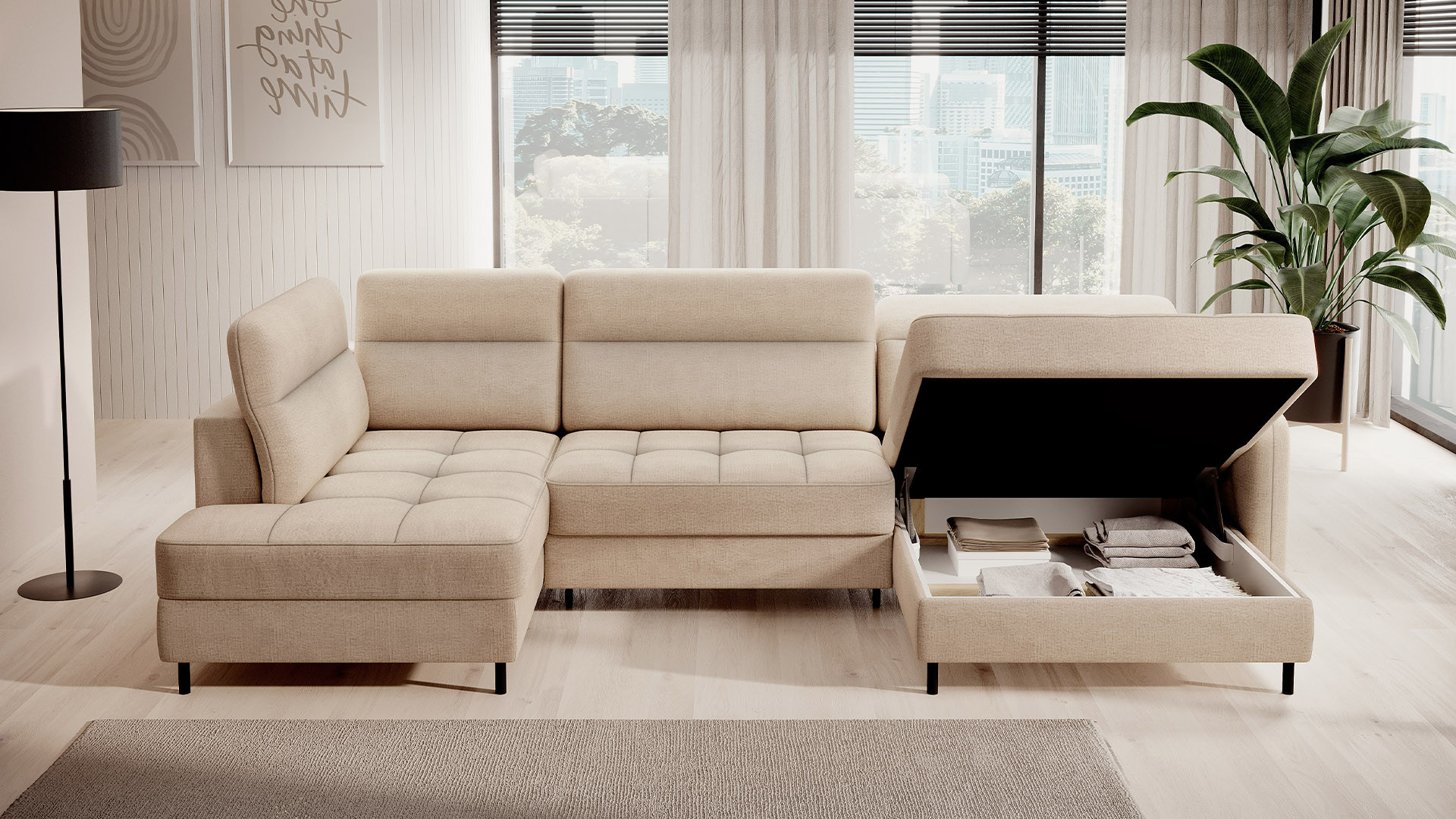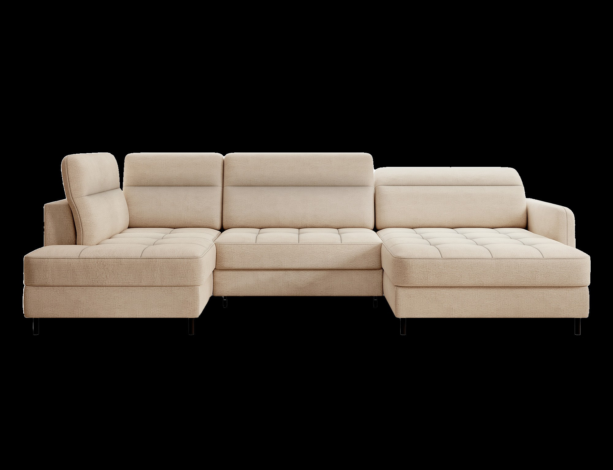 The Berrto corner sofa is an incredibly refined piece of furniture for your living room, designed to provide you with exceptional comfort and functionality. This elegant corner sofa combines modern design with the use of high-quality components. The Berrto corner sofa is equipped with wave springs of type B, which, in combination with high-elastic HR + T2130 foam, create a surface of unparalleled comfort. This piece of furniture is soft, flexible, and perfectly conforms to your body's shape, providing not only relaxation but also muscle relief. The use of upholstery straps and T2130 foam in the back of the Berrto corner sofa ensures its durability and resistance to deformations. You don't have to worry about unsightly wrinkles - this corner sofa will maintain its original appearance for many years. You can quickly and easily transform it into a comfortable bed, providing you and your guests with a restful night's sleep. Additionally, the corner sofa conceals a spacious storage compartment for bedding, providing ample space for all necessary textiles. The Berrto corner sofa offers not only comfort but also stability. With an impressive weight capacity of 390 kg, you can enjoy it for many years without worrying about its durability. The Berrto corner sofa stands out not only for its functionality but also for its aesthetic design. The black steel legs give it a modern character, and the elegant design makes it a standout element of your living room decor. The Berrto corner sofa is equipped with an easy-to-use Dolphin-type mechanism, allowing you to quickly transform it into a comfortable bed. This is the ideal solution when you need a sleeping space for guests. The Berrto corner sofa combines luxury, comfort, and functionality. Its high-quality craftsmanship and meticulous finishing make it not only the focal point of your living room but also a place for relaxation and spending time with friends and family.