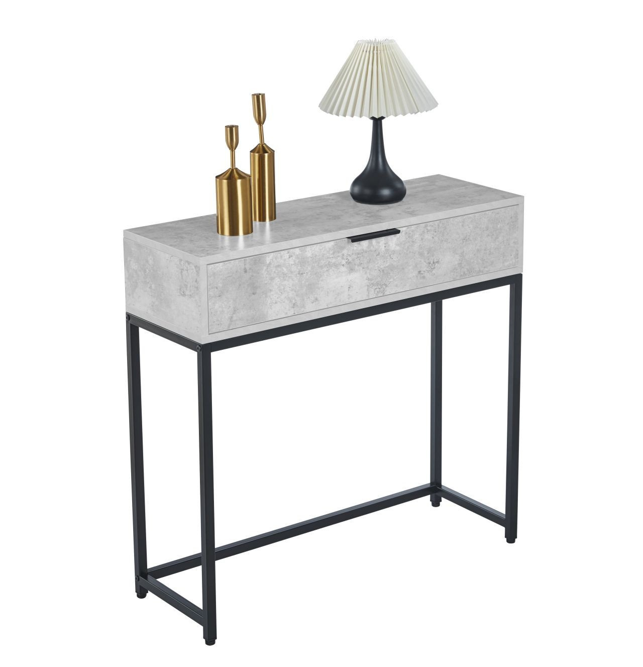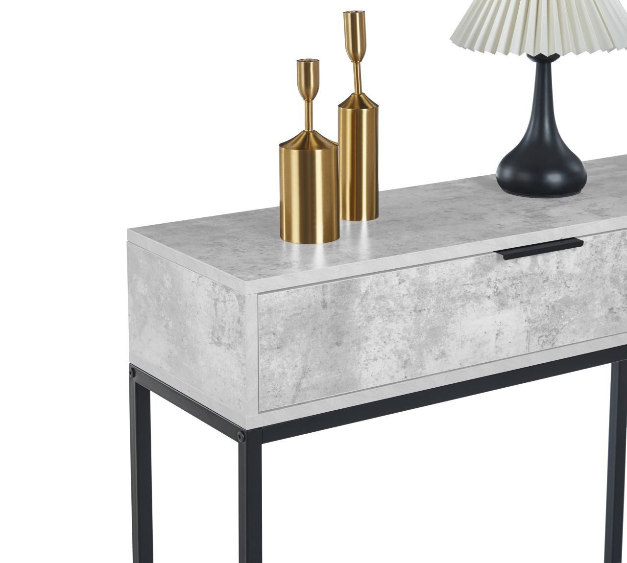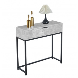 MÉRETEK: - mélység: 28 cm - szélesség: 80 cm - magasság: 77 cm ANYAG: - laminált forgácslap + porszórt festett fém SZÍN: - beton + fekete EGYÉB: - fiók