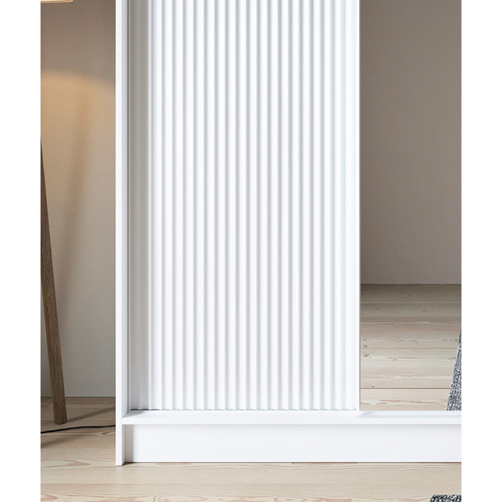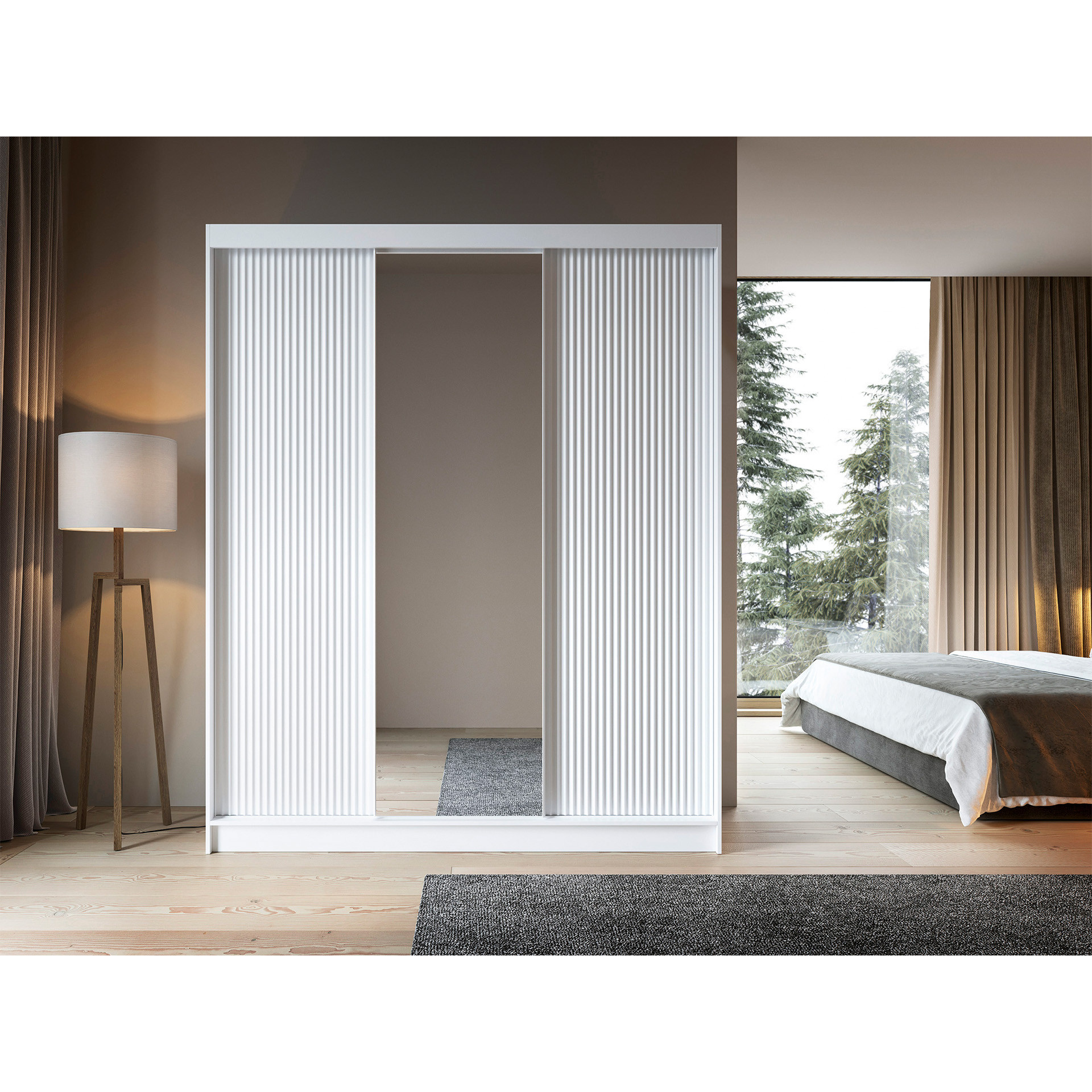This three-door Biancco sliding wardrobe is equipped with a mirror. Its dimensions are 60 cm depth, 180 cm width, and 220 cm height, making it a practical and stylish solution for organizing space in your interior. In an elegant white color, this wardrobe not only provides convenient storage but also adds harmony, aesthetics, and visually enlarges the space. Its body is made of durable 16 mm thick MDF board, and the ABS edge on the edges not only protects against damage but also emphasizes the aesthetics of the entire construction. The maximum shelf load capacity is 10 kg each, allowing storage of various items, from clothing to accessories. The set includes six sturdy shelves that help maintain order and organization. The wardrobe's legs, made of durable plastic, have a height of 0.5 cm and feature white glides. The included rods allow hanging clothes on hangers, further increasing the wardrobe's functionality. This practical solution aids in wardrobe organization and tidiness. In summary, the three-door Biancco sliding wardrobe with a mirror, with dimensions of 60 cm depth, 180 cm width, and 220 cm height, is a functional and elegant storage solution that fits perfectly into your interior. Its solid construction and practical features ensure durability and satisfaction for many years of use, and the mirror additionally visually enlarges the space and adds charm to your room.