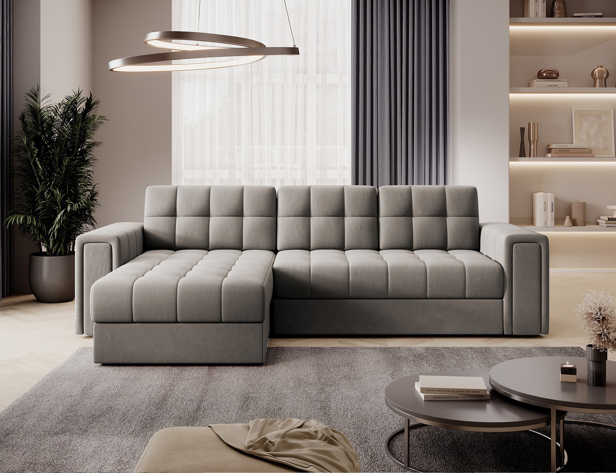 The Blenvi corner sofa is a modern and versatile piece of furniture, perfect for a living room. It features a seat with wave springs type B and high-quality T2540 polyurethane foam, ensuring excellent comfort. Equipped with a Dolphin-type sleeping function, it easily transforms into a comfortable bed. Additionally, it includes a storage compartment for bedding, providing extra functionality. The fully upholstered back allows for placement anywhere in the room. Its stylish, modern design makes it a perfect fit for various interior styles.
