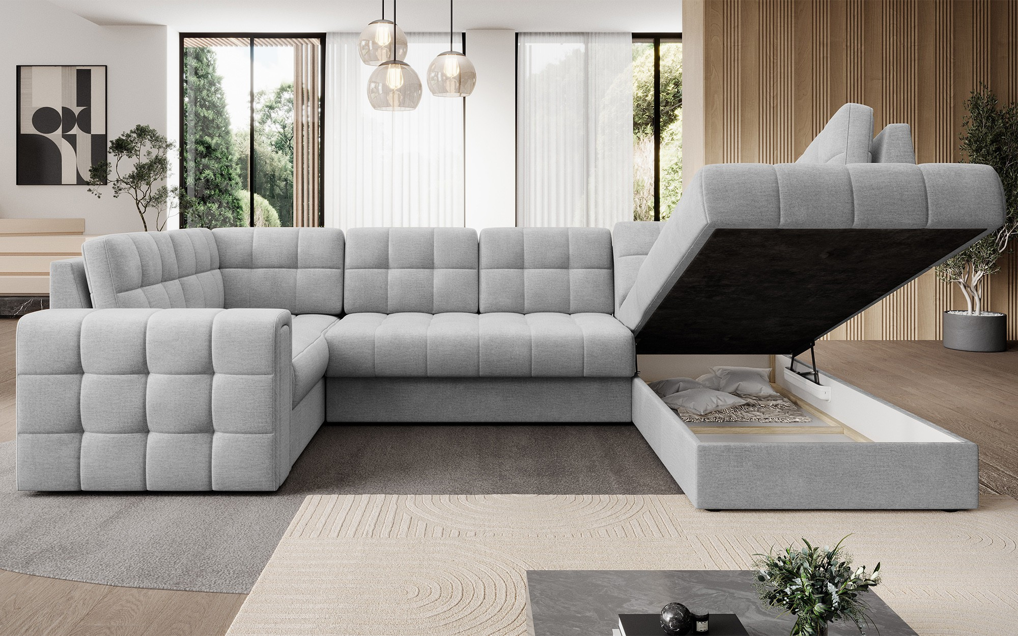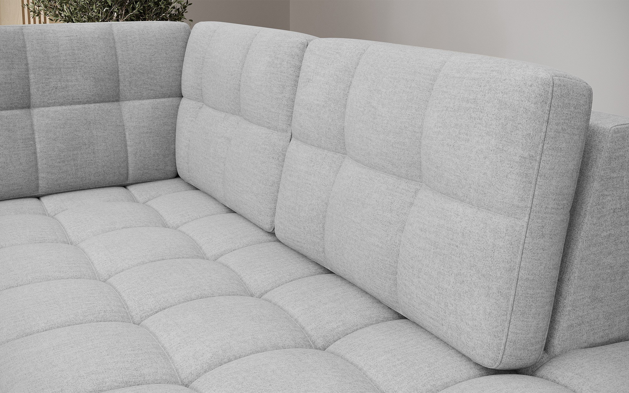Modern corner sofa bed Blewett 299x198x82 cm is the perfect choice for those looking for an elegant and comfortable corner sofa for their living room.The Blewett corner sofa stands out with a comfortable seat made of B-type wave springs and polyurethane foams T2540 and T2130, ensuring long-lasting comfort and durability.The backrest is filled with foam padding that perfectly adapts to the shape of the back, increasing relaxation comfort.The Blewett living room corner sofa features a Dolphin-type sleeping function, allowing for quick unfolding, and a practical bedding container—perfect for storage.This modern Blewett corner sofa has an upholstered back, making it look great in any part of the room.Sturdy black plastic legs emphasize the sofa’s contemporary style.High-quality craftsmanship, functionality, and fashionable design make the Blewett an excellent sofa bed that meets the expectations of even the most demanding users.