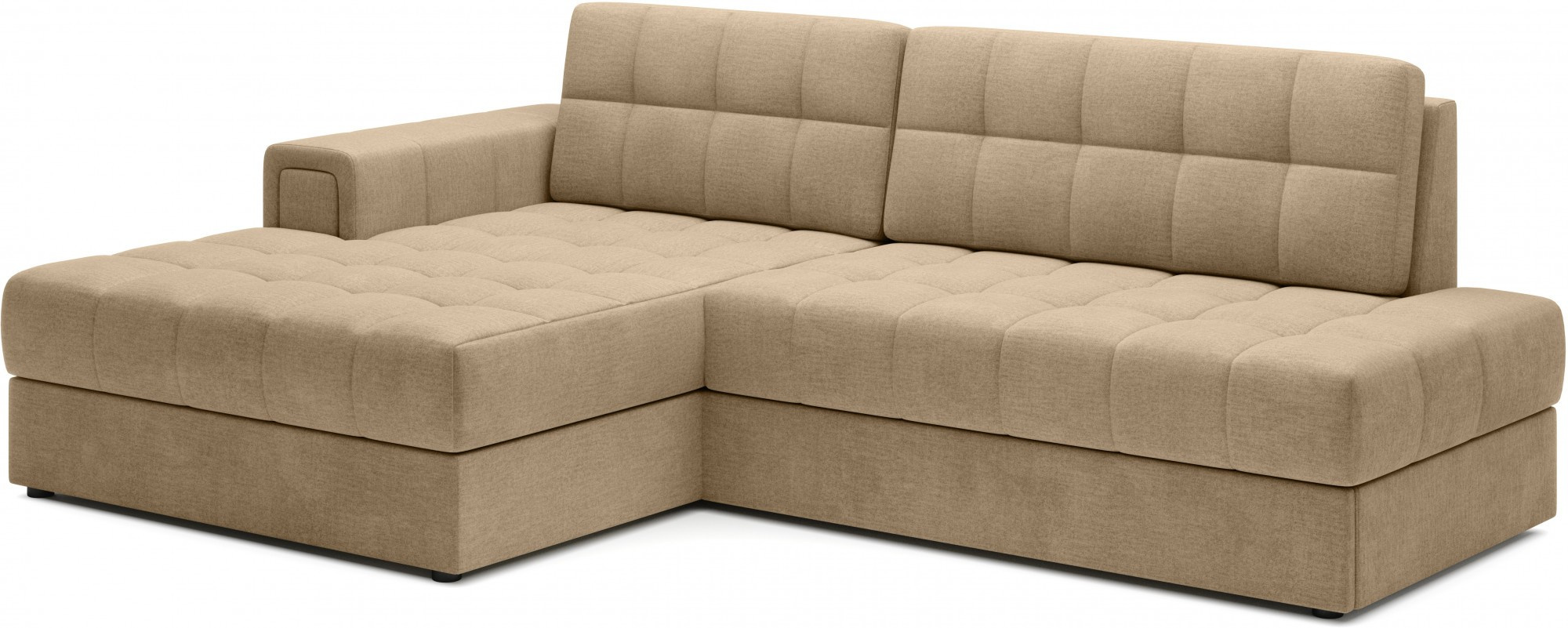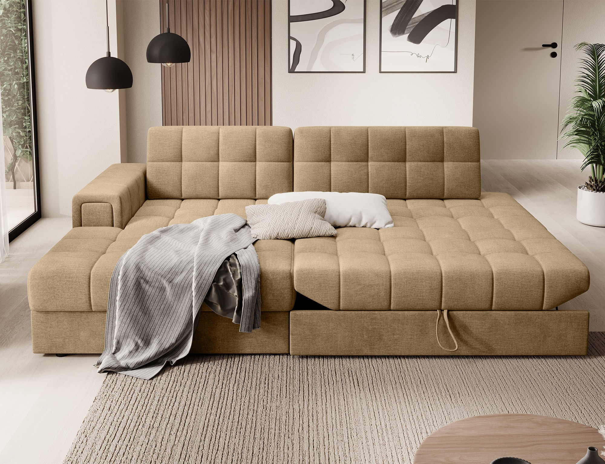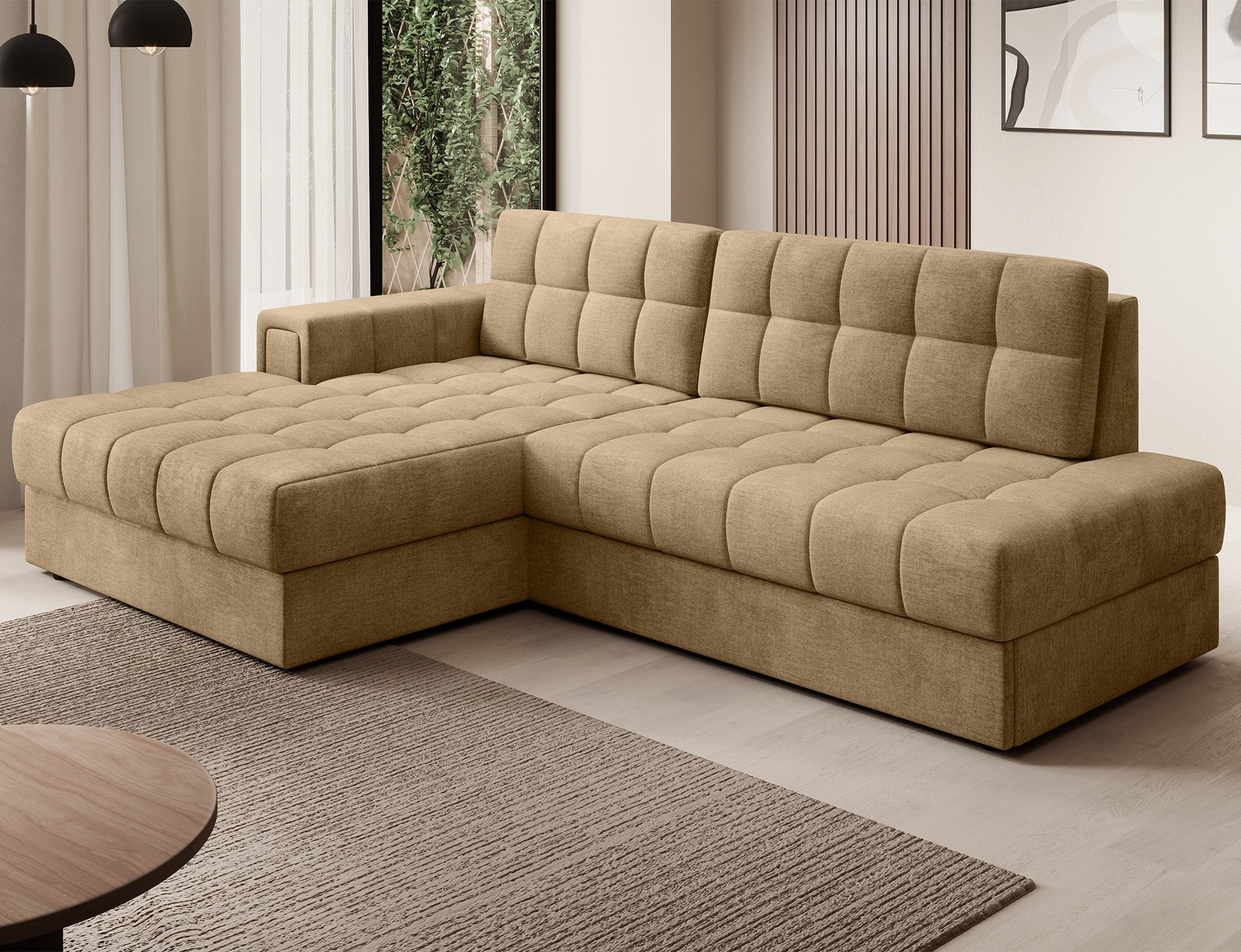 The Blezalt corner sofa is a perfect combination of modern design, functionality, and comfort. Its dimensions of 240x150x82 cm provide ample space for everyday relaxation, while the sleeping function and bedding storage compartment make it an ideal choice for any interior. The seat, made of T2540 polyurethane foam and type B wave springs, ensures comfort and resistance to deformation, while the foam-filled backrest adapts to the body, offering optimal support. Thanks to the Delfin unfolding mechanism, the sofa transforms into a comfortable bed in seconds, and the bedding compartment allows for convenient storage of extra textiles. The upholstered back gives it an elegant look from every angle, and the black plastic legs add both stability and lightness. Perfect for living rooms, lounges, and modern interiors, it offers lasting comfort and style.