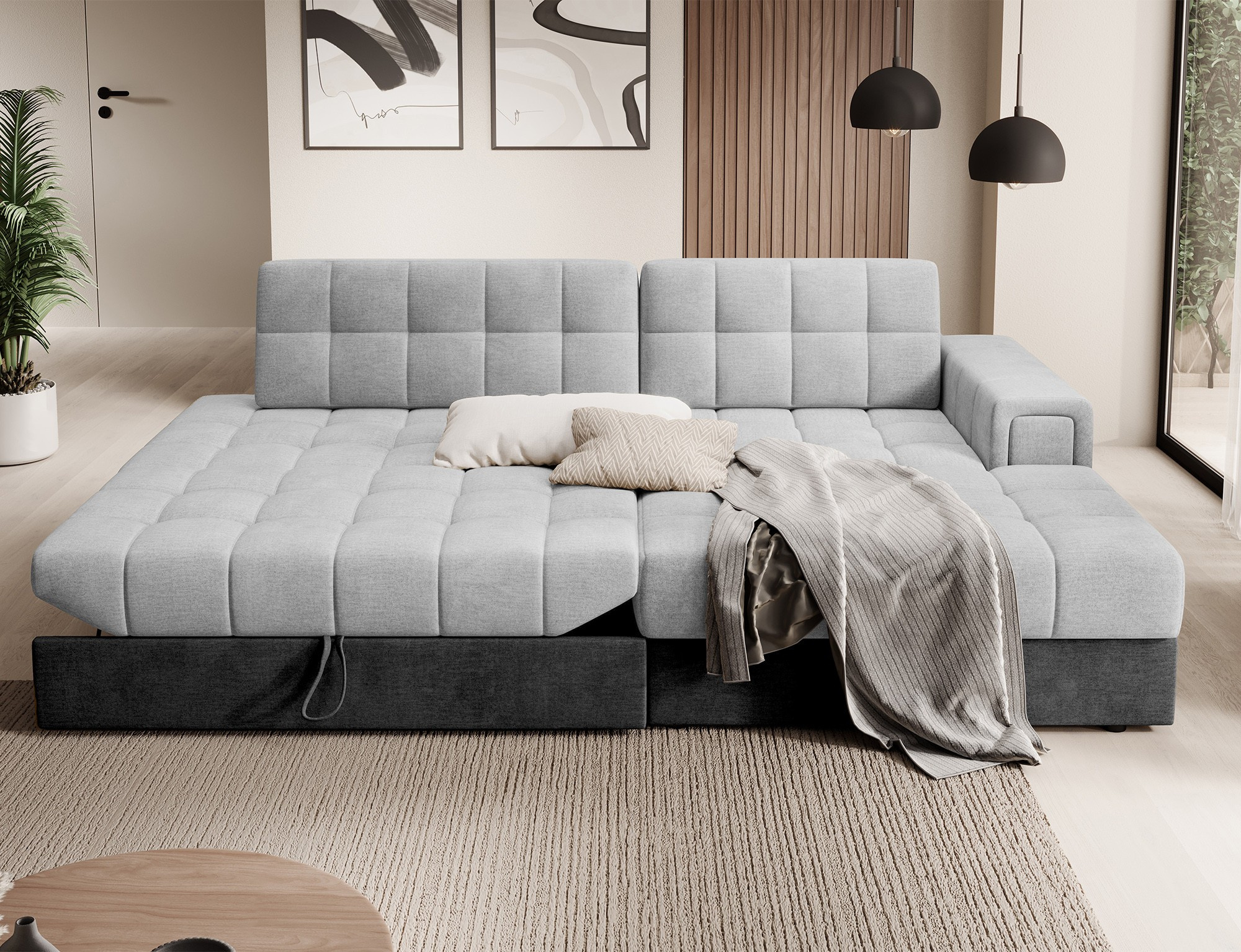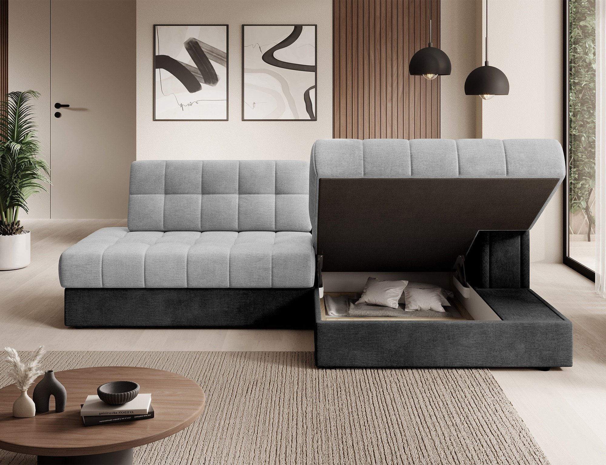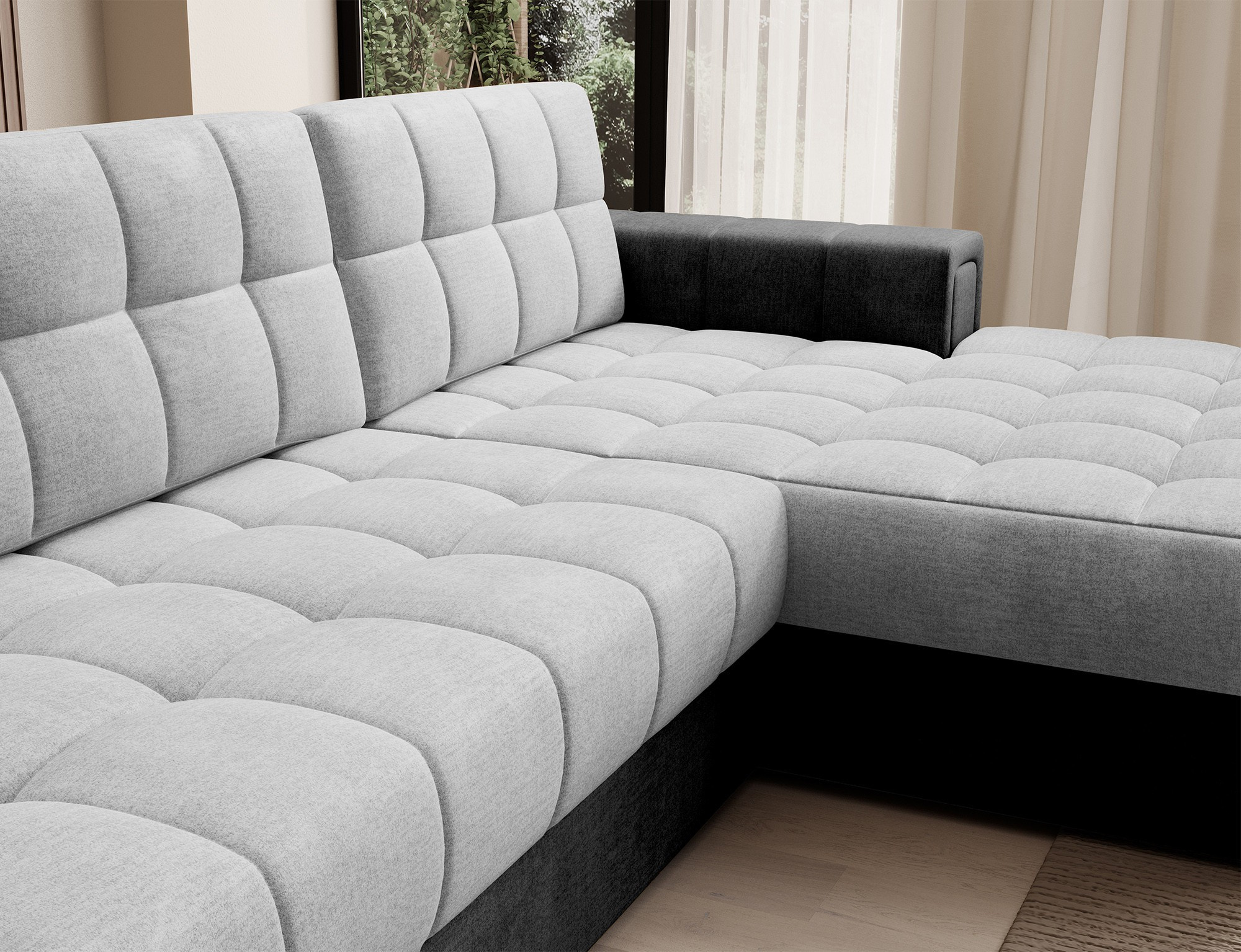The Blezalt corner sofa is a perfect combination of modern design, functionality, and comfort. Its dimensions of 240x150x82 cm provide ample space for everyday relaxation, while the sleeping function and bedding storage compartment make it an ideal choice for any interior. The seat, made of T2540 polyurethane foam and type B wave springs, ensures comfort and resistance to deformation, while the foam-filled backrest adapts to the body, offering optimal support. Thanks to the Delfin unfolding mechanism, the sofa transforms into a comfortable bed in seconds, and the bedding compartment allows for convenient storage of extra textiles. The upholstered back gives it an elegant look from every angle, and the black plastic legs add both stability and lightness. Perfect for living rooms, lounges, and modern interiors, it offers lasting comfort and style.