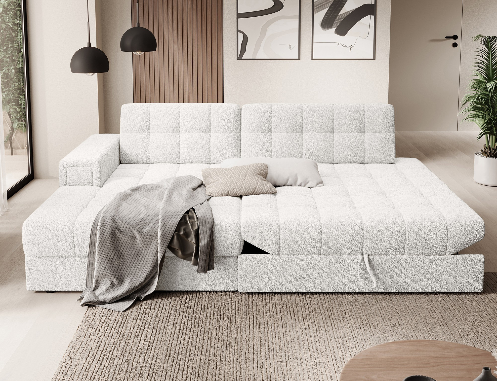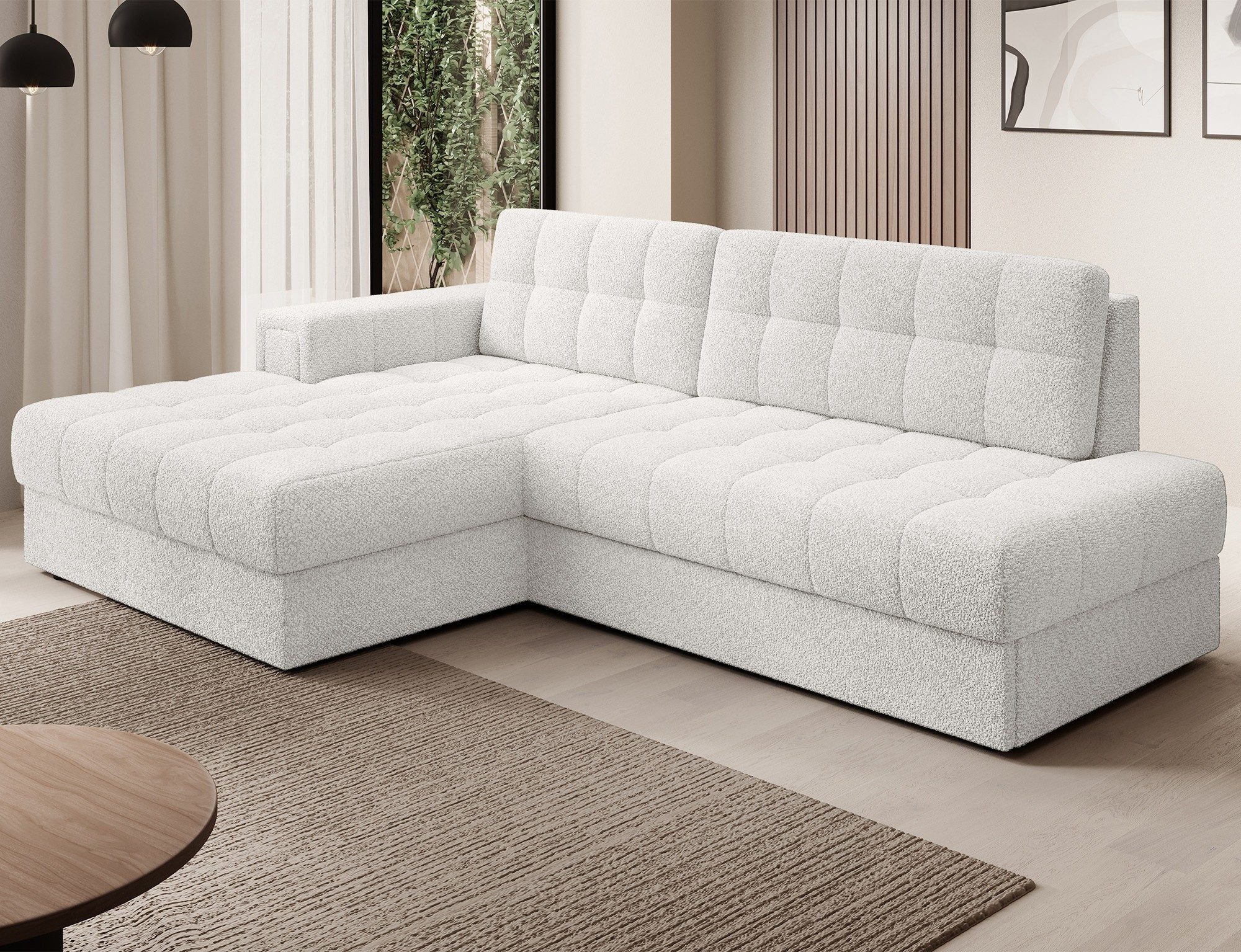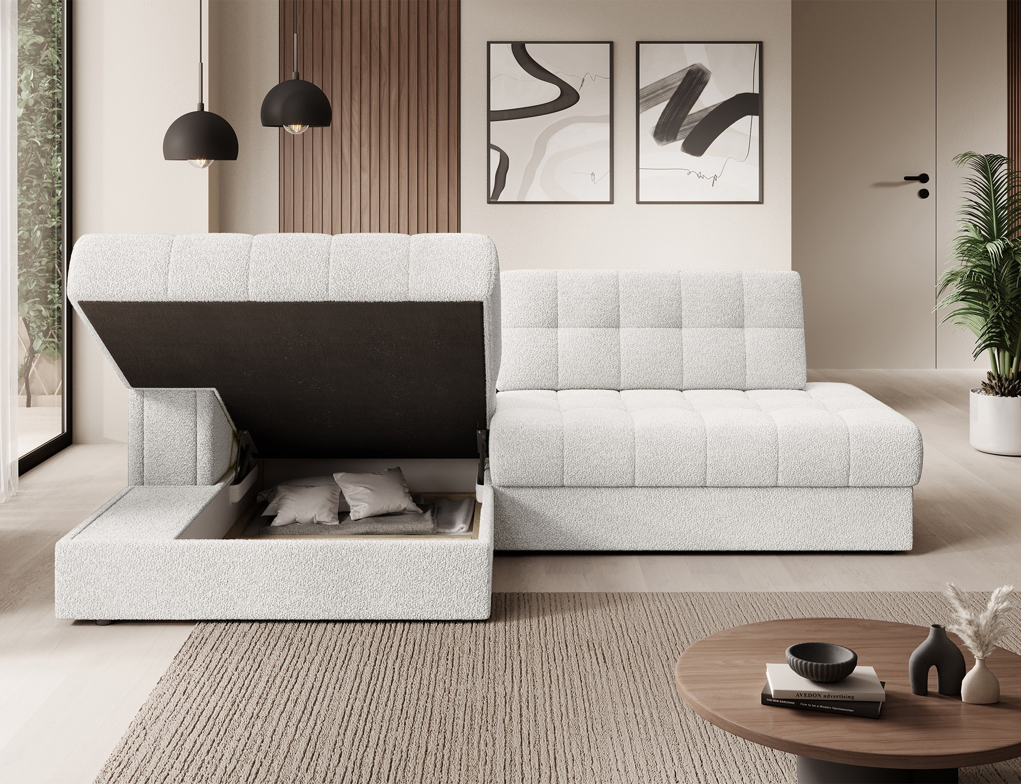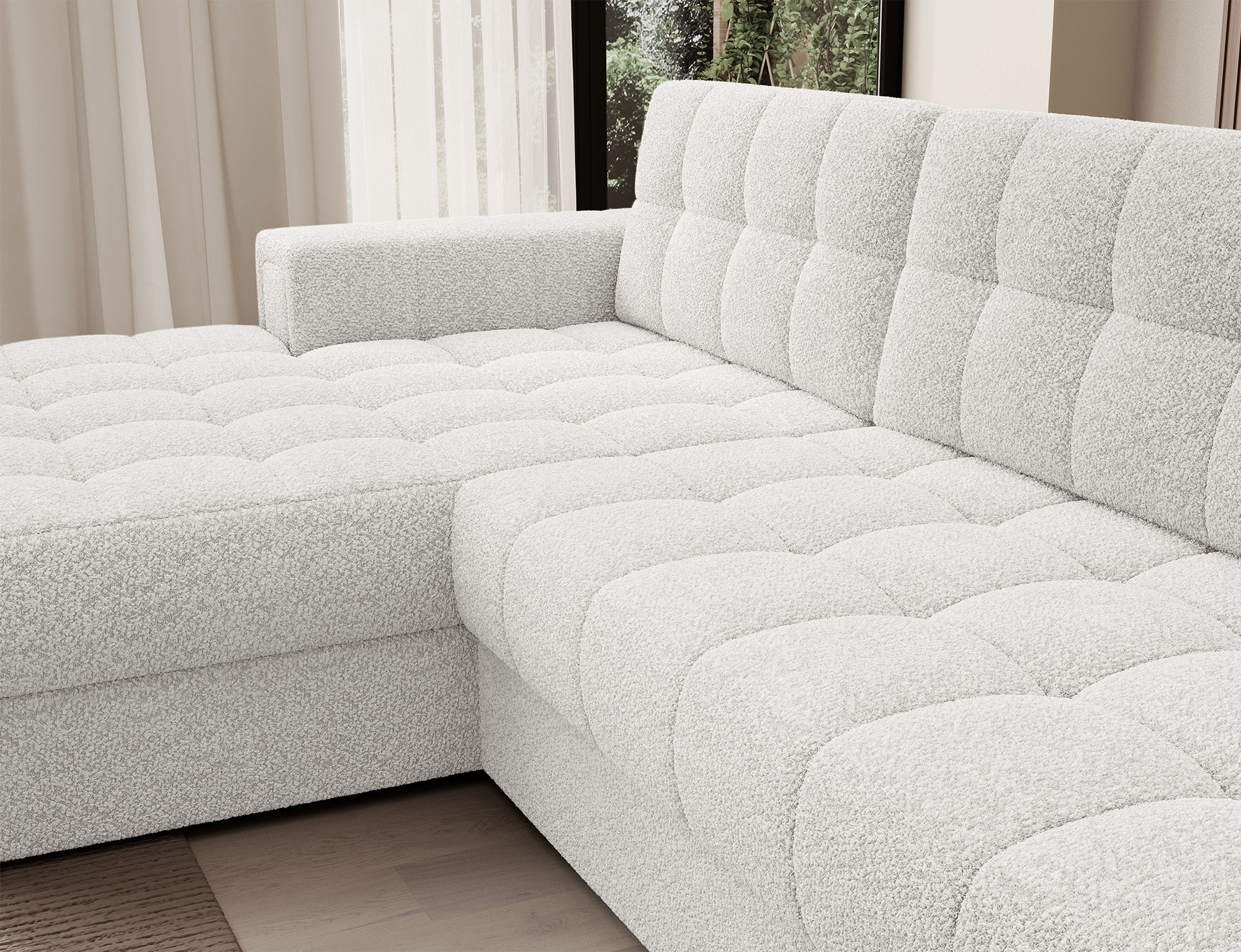 The Blezalt corner sofa is a perfect combination of modern design, functionality, and comfort. Its dimensions of 240x150x82 cm provide ample space for everyday relaxation, while the sleeping function and bedding storage compartment make it an ideal choice for any interior. The seat, made of T2540 polyurethane foam and type B wave springs, ensures comfort and resistance to deformation, while the foam-filled backrest adapts to the body, offering optimal support. Thanks to the Delfin unfolding mechanism, the sofa transforms into a comfortable bed in seconds, and the bedding compartment allows for convenient storage of extra textiles. The upholstered back gives it an elegant look from every angle, and the black plastic legs add both stability and lightness. Perfect for living rooms, lounges, and modern interiors, it offers lasting comfort and style.