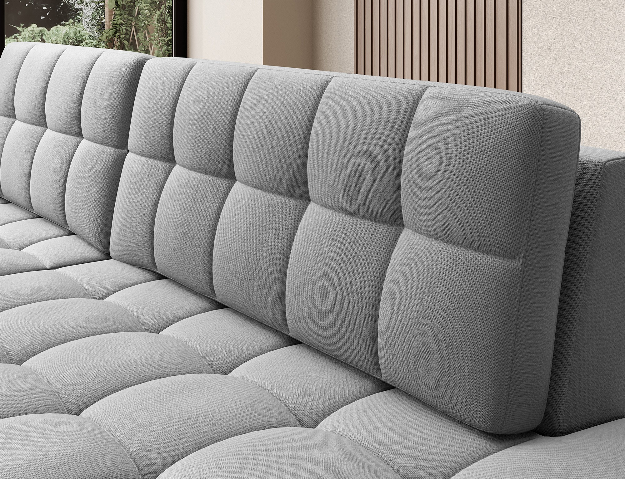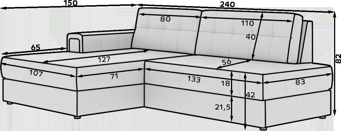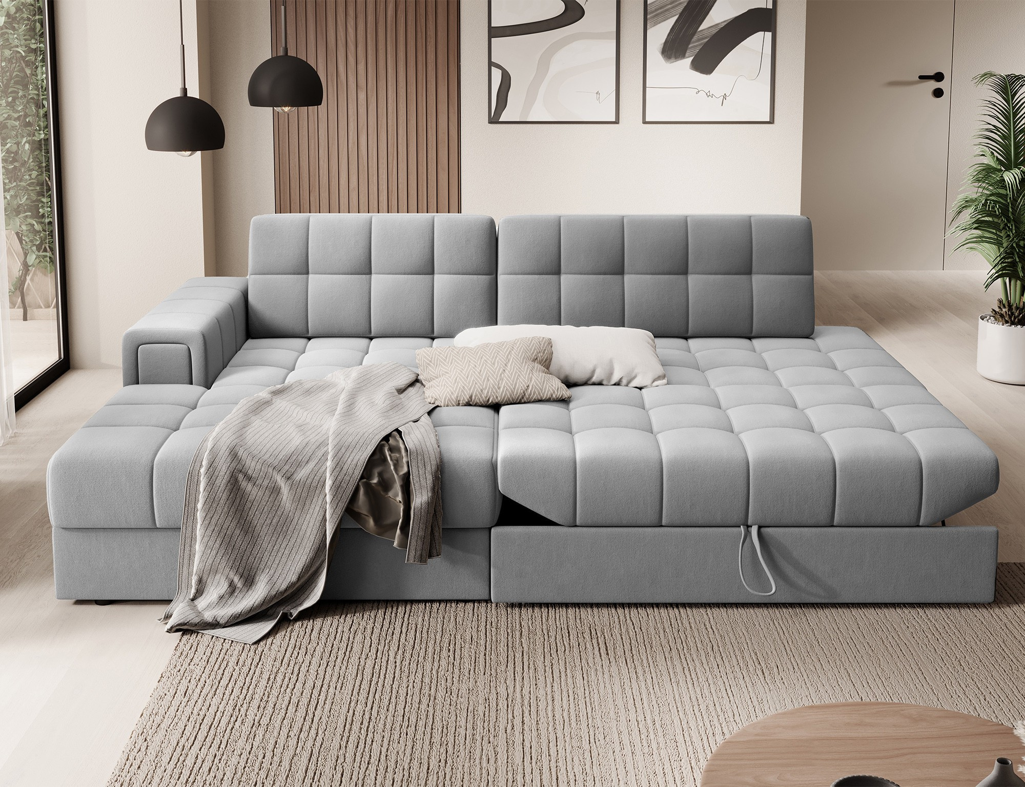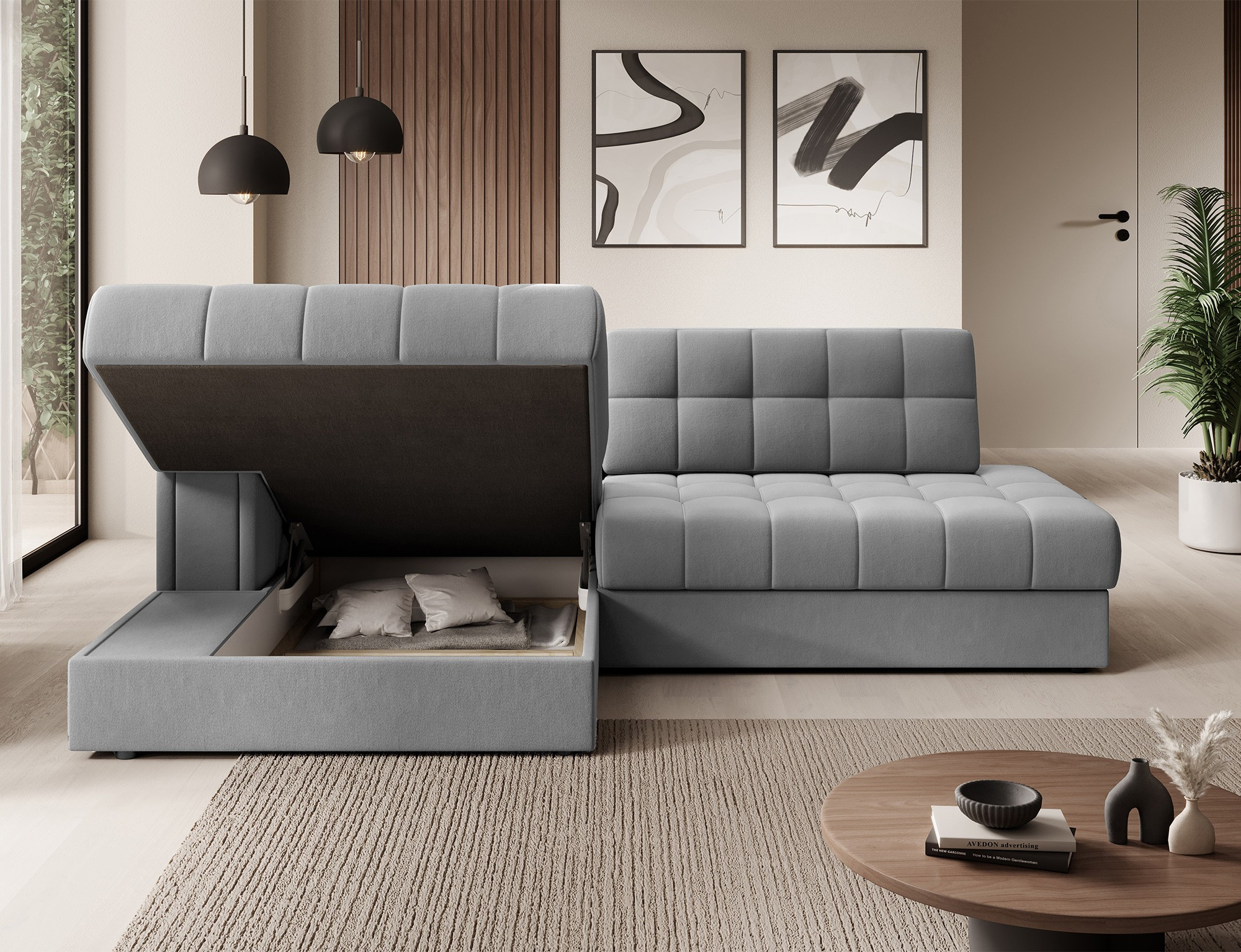 The Blezalt corner sofa is a perfect combination of modern design, functionality, and comfort. Its dimensions of 240x150x82 cm provide ample space for everyday relaxation, while the sleeping function and bedding storage compartment make it an ideal choice for any interior. The seat, made of T2540 polyurethane foam and type B wave springs, ensures comfort and resistance to deformation, while the foam-filled backrest adapts to the body, offering optimal support. Thanks to the Delfin unfolding mechanism, the sofa transforms into a comfortable bed in seconds, and the bedding compartment allows for convenient storage of extra textiles. The upholstered back gives it an elegant look from every angle, and the black plastic legs add both stability and lightness. Perfect for living rooms, lounges, and modern interiors, it offers lasting comfort and style.