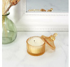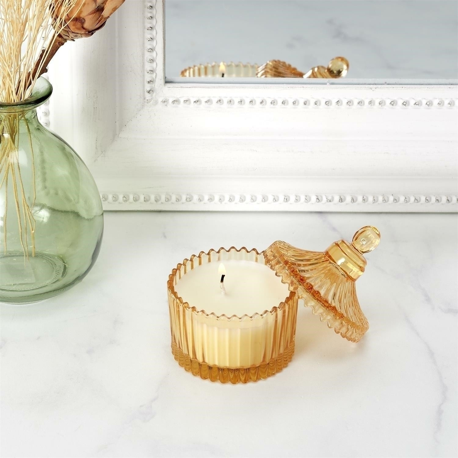 El leszel bűvölve a bohém üvegből inspirált gyertyatartóban lévő gyertyával. A fedeles edényben lévő gyertya nemcsak érdekes, szórt fényt biztosít, amikor ég. A gyertya akkor is fantasztikus dísz, ha nem ég. A borostyán illatú illatos gyertya kellemes friss illatot áraszt.- Üvegtok - Üzemidő: 10 óra - Súly: 60 g