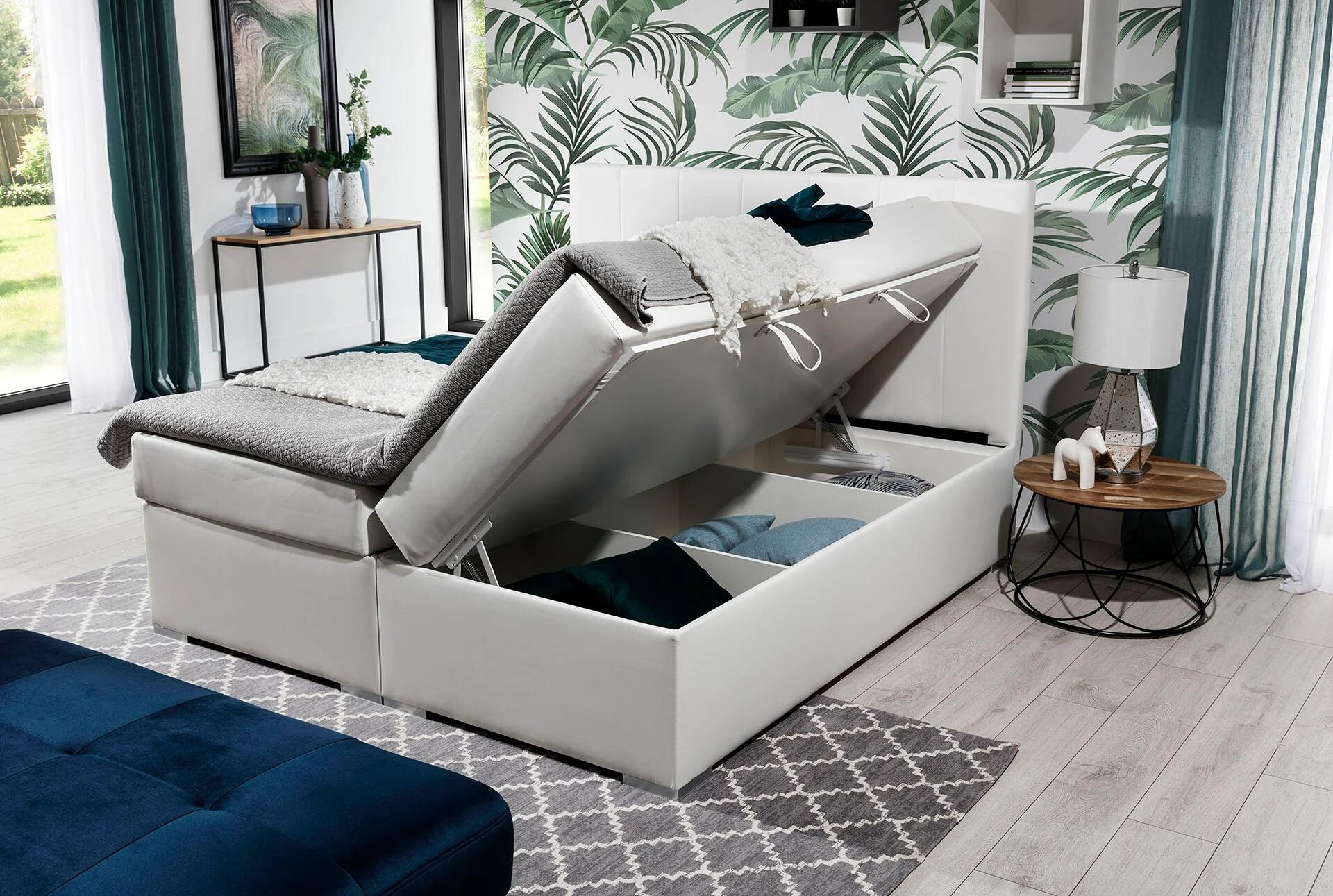 Bolero is a simple, yet elegant and very comfortable boxspring continental bed that will be the perfect finishing touch to any modern bedroom design. This model, available in a choice of three sizes: 140/160/180 x 200 cm, is equipped with a firm 20 cm high bonell mattress enriched with a 4 cm layer of additional T25 foam placed on the top and bottom of the mattress. The bed is also equipped with a topper - a 4 cm thick mattress topper made of T21 foam. In addition, thanks to a spring mechanism and handles, the upper part of the bed raises, giving the user of the furniture access to two spacious bedding bins, divided into three parts. Additional distinctive elements for the Bolero bed include elegant legs, a deep seat and a high headrest, decorated with stripes. If you are interested in a comfortable, as well as stylish bed, which retains the right flexibility and firmness, and at the same time is functional and carefully finished in terms of design - we invite you to be interested in our Boxspring. If the quality of your sleep matters to you - it will certainly be an ideal choice.