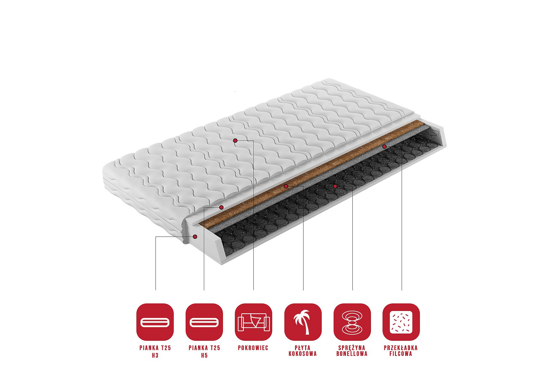 A PRESTIN bonell rugós matrac bonell típusú rugóból áll, amelynek fő előnye a felületi rugalmasság, ami miatt a matrac minden személy számára alkalmas. Ráadásul a matrac töltete kiváló minőségű T25 poliuretán habból készült, kétféle keménységgel: H5 és H3 - kemény és közepesen kemény. A pihenés kényelmének javítása érdekében a PRESTIN modell 1 cm magas kókuszdeszkával van felszerelve. Ilyen kombináció biztosítja, hogy a matrac jó tartóssággal és légáramlással rendelkezzen. Fontos tulajdonsága a hipoallergén jellege is. Antiallergén, steppelt huzat nem vonzza a port, atkákat vagy más allergéneket, így kedvelt választás az allergiára és bőrirritációra hajlamos személyek számára. Ezenkívül mosógépben is mosható 40 Celsius-fokon, ami még inkább megkönnyíti az alvás megfelelő higiéniájának fenntartását. A huzat cipzárral rendelkezik, így könnyen levehető és felhelyezhető.