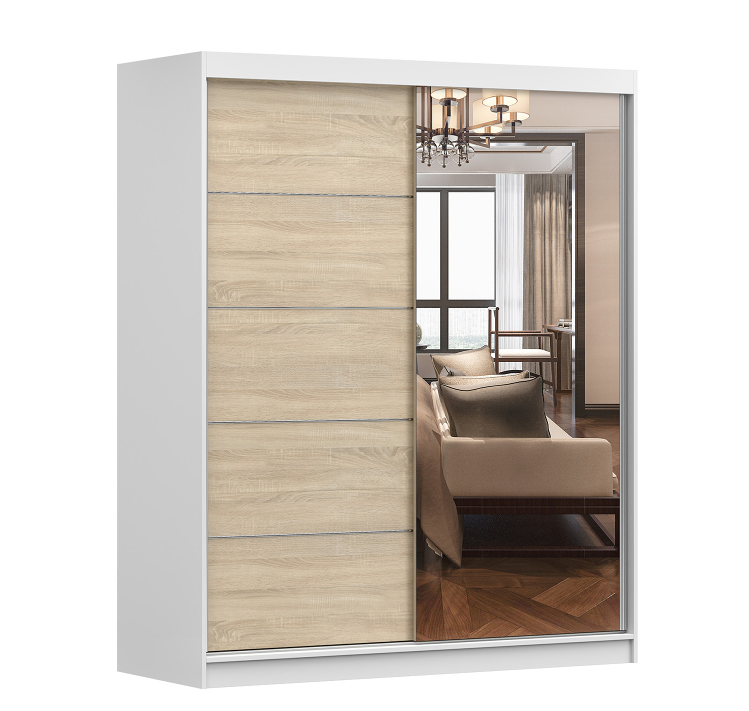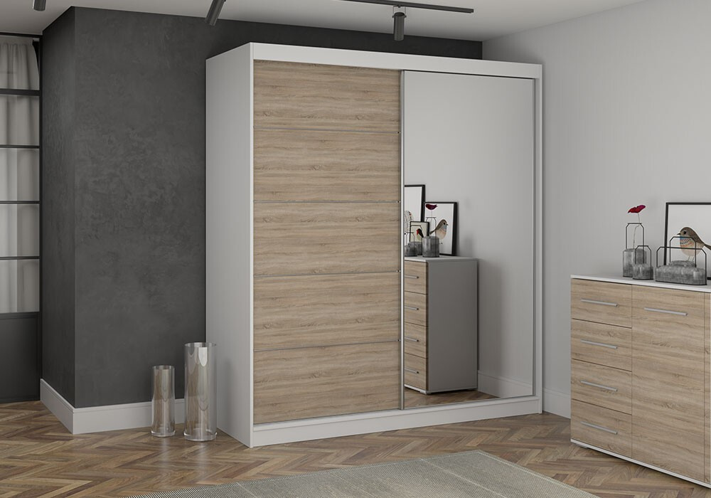 BONO 05 gardróbszekrény tükörrel, Fehér/Sonoma Tölgy