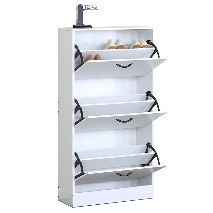 Botník s třemi přihrádkami v čistě bílém provedení je vyroben z MDF desek, které zajišťují pevnost a stabilitu. Každá přihrádka je opatřena černou úchytkou pro snadné otevírání a zavírání, což usnadňuje organizaci obuvi. Kompaktní rozměry umožňují umístění do předsíní i menších prostor, kde poskytuje praktické řešení pro uložení bot. Povrch botníku je hladký a snadno udržovatelný, což přispívá k dlouhé životnosti a čistému vzhledu. Díky jednoduchému designu se hodí do různých stylů interiéru.