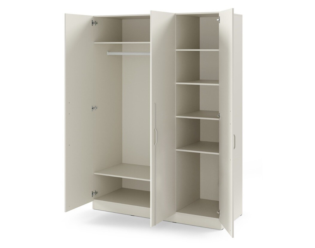 Ez a 3 ajtós szekrény elegendő tárolóhelyet kínál ruhái, kiegészítői és egyéb személyes tárgyai számára. 150 cm szélességgel, 210 cm magassággal és 60,5 cm mélységgel elegendő helyet biztosít a ruhásszekrény rendezéséhez. A klasszikus ajtónyitás lehetővé teszi, hogy könnyen hozzáférjen minden holmijához anélkül, hogy kompromisszumot kellene kötnie a térrel kapcsolatban.