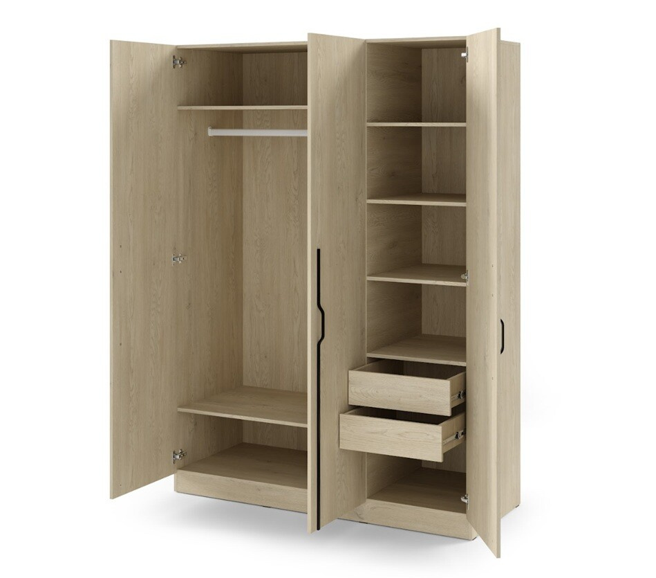 Ez a 3 ajtós szekrény elegendő helyet kínál minden igényének. 150 cm szélességgel, 210 cm magassággal és 60,5 cm mélységgel a BRAGA 2 szekrény elegendő helyet biztosít ruhák, ágyneműk és egyéb személyes tárgyak tárolására. A tükör hiánya az ajtón lehetővé teszi a belső tér teljes kihasználását tárolási célokra.