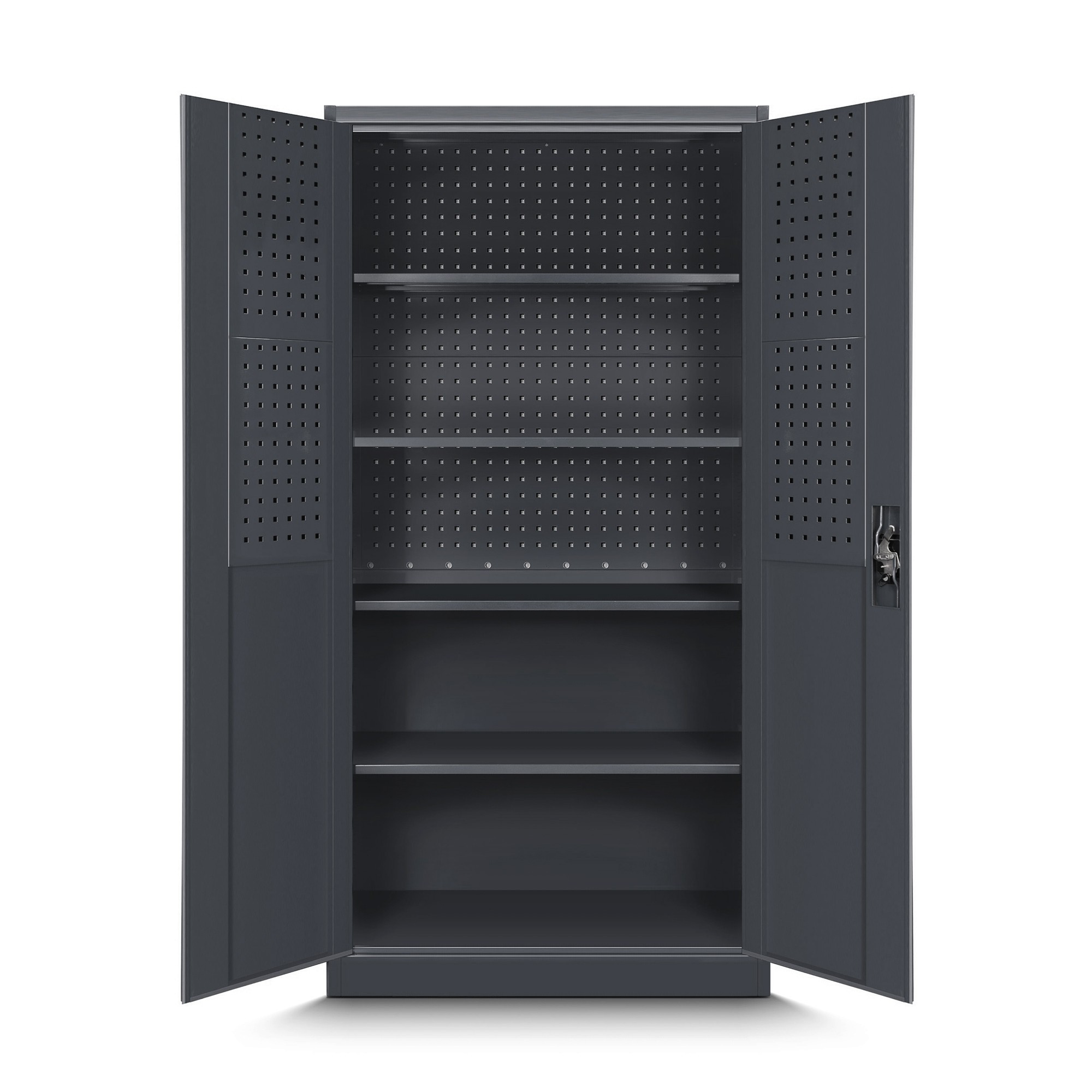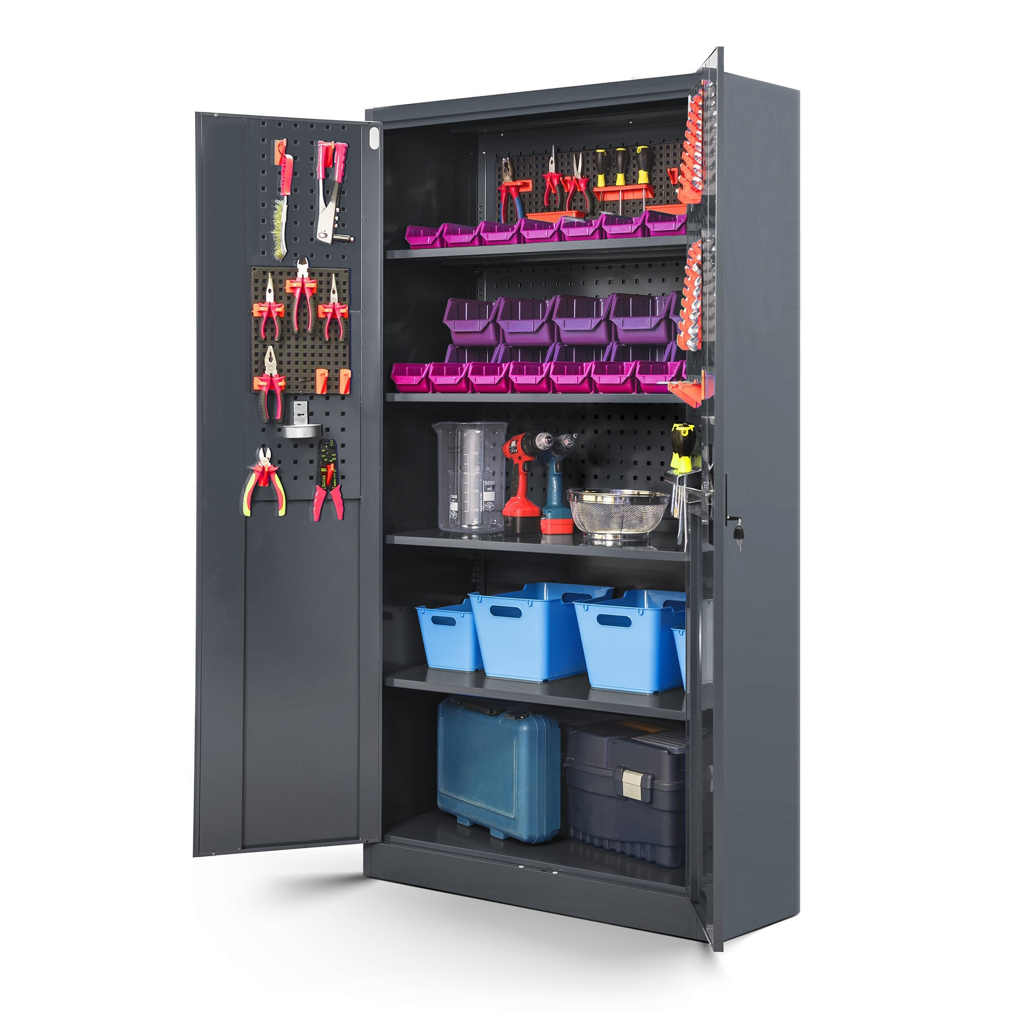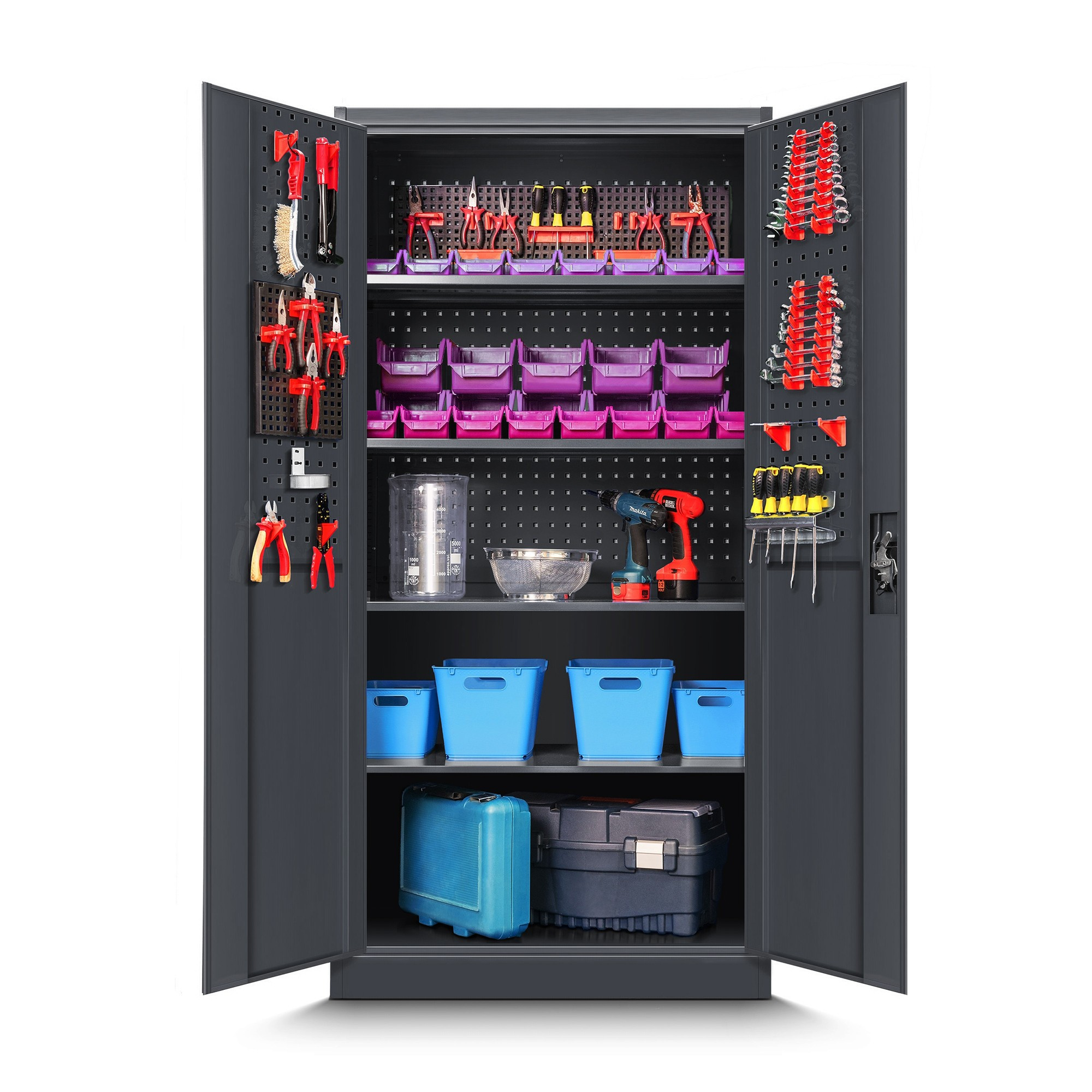 A BRUNO szekrény egyedi tulajdonsága a perforált lemezek, amelyek a hátsó falon és az ajtók belső oldalán találhatók. Ezek a táblák lehetővé teszik, hogy szerszámokat és tartozékokat akasszon fel speciális kampók és tartók segítségével (amelyek külön megvásárolhatók). Ennek köszönhetően a leggyakrabban használt eszközei mindig kéznél lesznek, és értékes időt takaríthat meg a munka során. A perforált lemezek nagyszerű módja annak, hogy maximalizáljuk a tér kihasználtságát és tökéletes áttekintést tartsunk fenn a szerszámainkról.