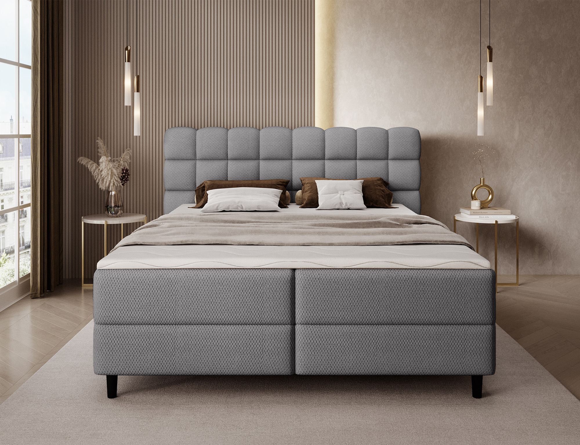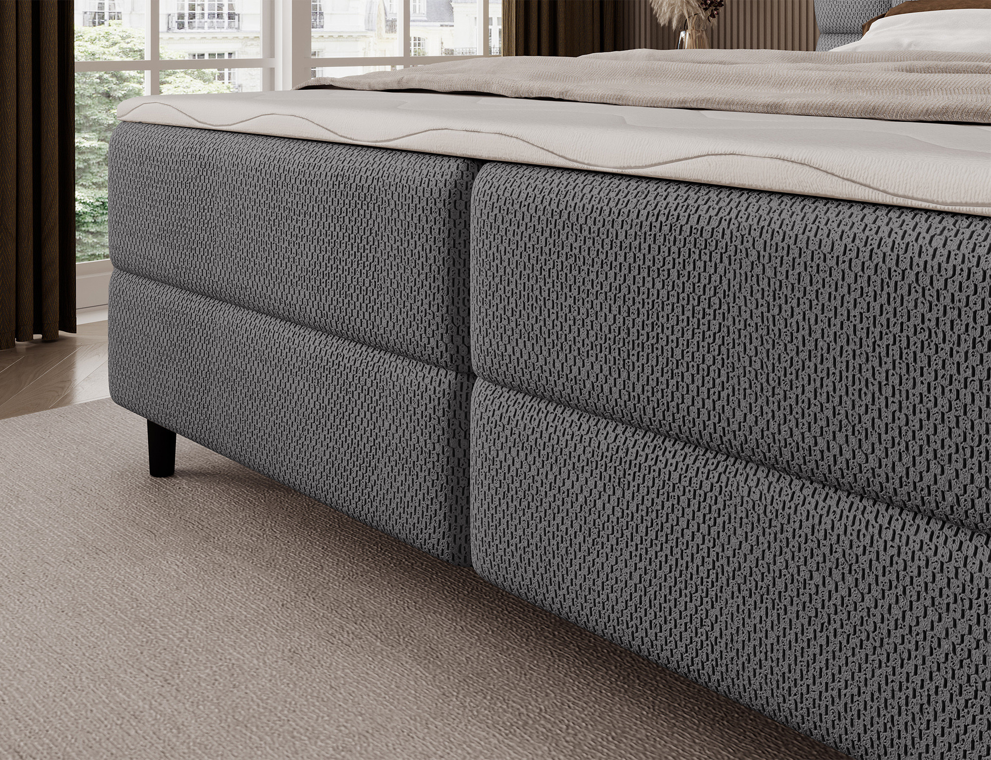 The Camma continental bed combines modern design, functionality and outstanding sleeping comfort, making it the perfect choice for an elegant and practical bedroom; available in three sizes – 140x200 cm, 160x200 cm and 180x200 cm – it adapts perfectly to both space and individual needs, while its solid construction with a total height of 102 cm and a seat height of 56 cm ensures everyday comfort; the bed has a depth of 222 cm, and the width depends on the chosen model – 162 cm, 182 cm or 202 cm – giving it a stable and impressive look that adds a luxurious touch to any interior; upholstered in a high-quality, soft-touch fabric with a stylishly quilted headboard, it combines modern elegance with comfortable support for reading or relaxing; a practical storage box provides space for bedding and helps keep the bedroom tidy, making the Camma bed not only comfortable but also highly functional; the design is complemented by 10 cm black wooden legs that add visual lightness and make cleaning underneath the bed easier; the Camma model is the ideal choice for those who value modern style, elegance, durability and comfort, ensuring healthy and restful sleep every night.
