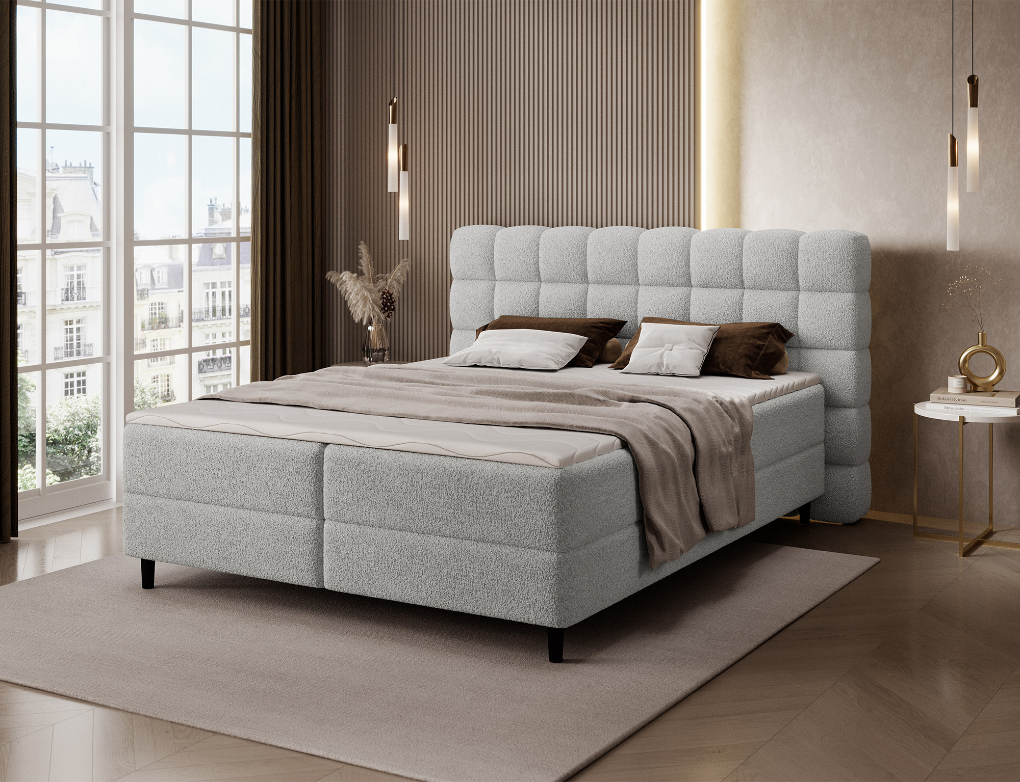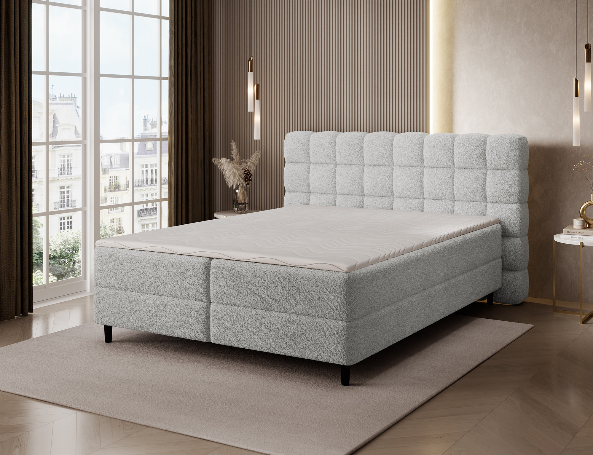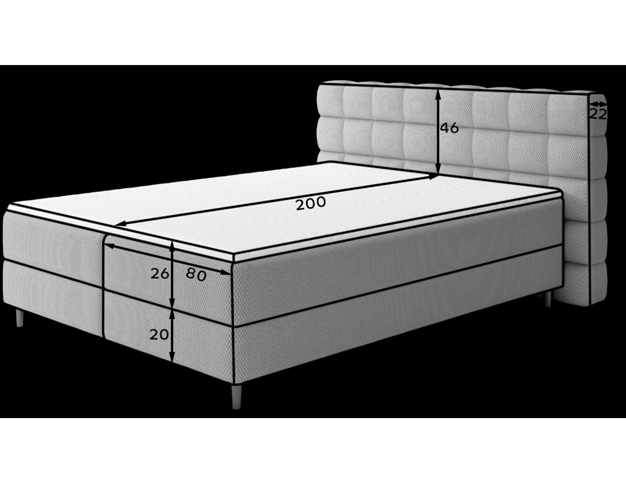 The Camma continental bed combines modern design, functionality and outstanding sleeping comfort, making it the perfect choice for an elegant and practical bedroom; available in three sizes – 140x200 cm, 160x200 cm and 180x200 cm – it adapts perfectly to both space and individual needs, while its solid construction with a total height of 102 cm and a seat height of 56 cm ensures everyday comfort; the bed has a depth of 222 cm, and the width depends on the chosen model – 162 cm, 182 cm or 202 cm – giving it a stable and impressive look that adds a luxurious touch to any interior; upholstered in a high-quality, soft-touch fabric with a stylishly quilted headboard, it combines modern elegance with comfortable support for reading or relaxing; a practical storage box provides space for bedding and helps keep the bedroom tidy, making the Camma bed not only comfortable but also highly functional; the design is complemented by 10 cm black wooden legs that add visual lightness and make cleaning underneath the bed easier; the Camma model is the ideal choice for those who value modern style, elegance, durability and comfort, ensuring healthy and restful sleep every night.