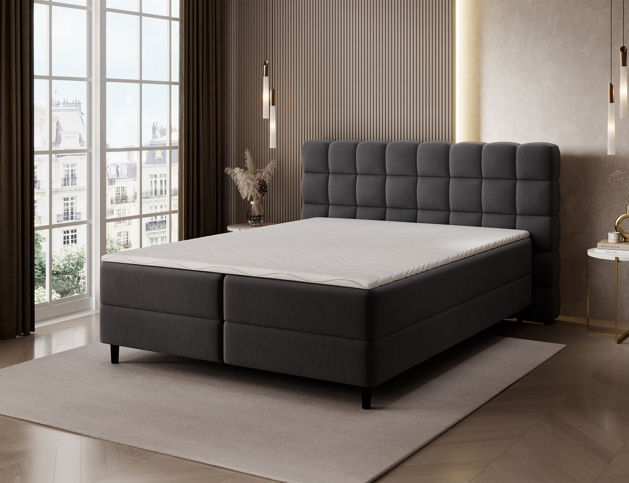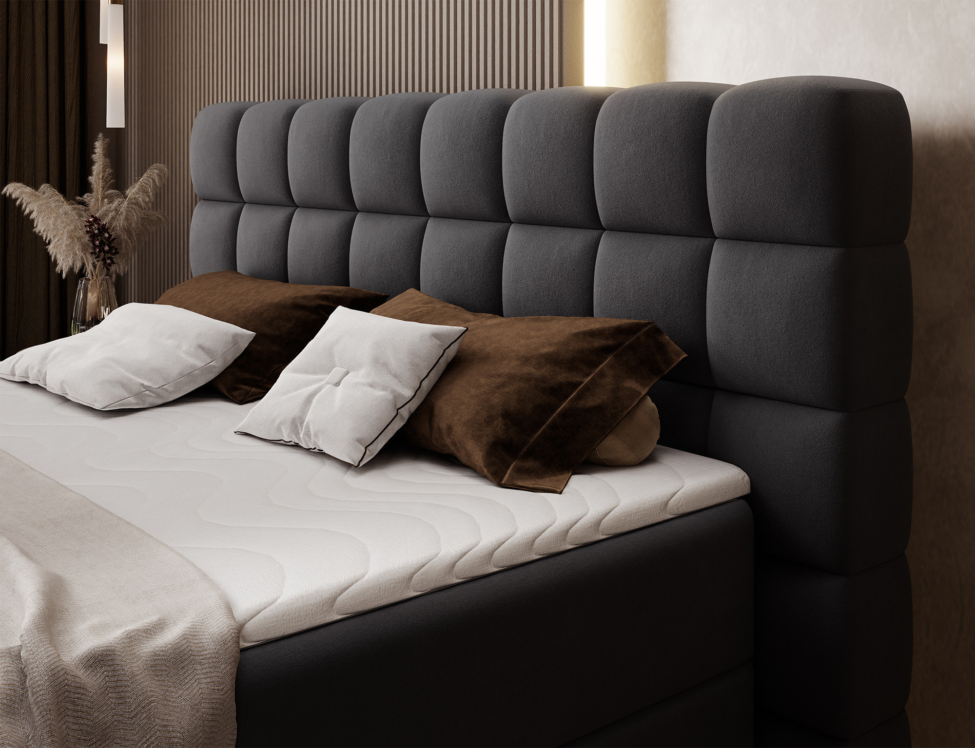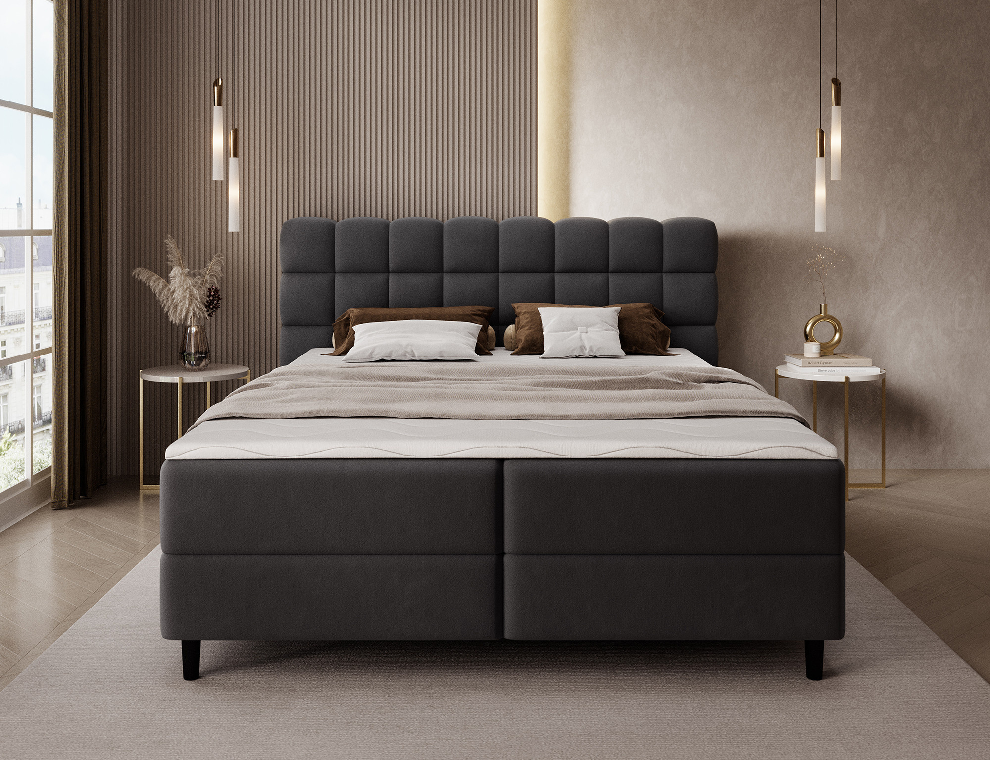 The Camma continental bed combines modern design, functionality and outstanding sleeping comfort, making it the perfect choice for an elegant and practical bedroom; available in three sizes – 140x200 cm, 160x200 cm and 180x200 cm – it adapts perfectly to both space and individual needs, while its solid construction with a total height of 102 cm and a seat height of 56 cm ensures everyday comfort; the bed has a depth of 222 cm, and the width depends on the chosen model – 162 cm, 182 cm or 202 cm – giving it a stable and impressive look that adds a luxurious touch to any interior; upholstered in a high-quality, soft-touch fabric with a stylishly quilted headboard, it combines modern elegance with comfortable support for reading or relaxing; a practical storage box provides space for bedding and helps keep the bedroom tidy, making the Camma bed not only comfortable but also highly functional; the design is complemented by 10 cm black wooden legs that add visual lightness and make cleaning underneath the bed easier; the Camma model is the ideal choice for those who value modern style, elegance, durability and comfort, ensuring healthy and restful sleep every night.