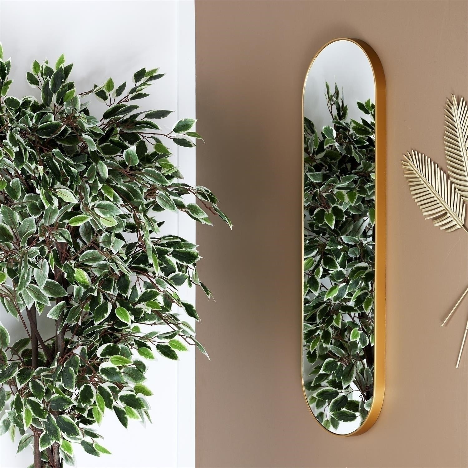 A Camomille tükör bájos kiegészítője egy elegáns fürdőszobának vagy boho stílusú hálószobának. Ovális alakú függő tükör műanyag kerettel arany színben. Karcsú formájának köszönhetően könnyedséget kölcsönöz a belső térnek. Szépen fog harmonizálni a növényekkel és a minimalista kiegészítőkkel. Kartondobozok száma: 1 Kartondobozok méretei: 30x100x3cm