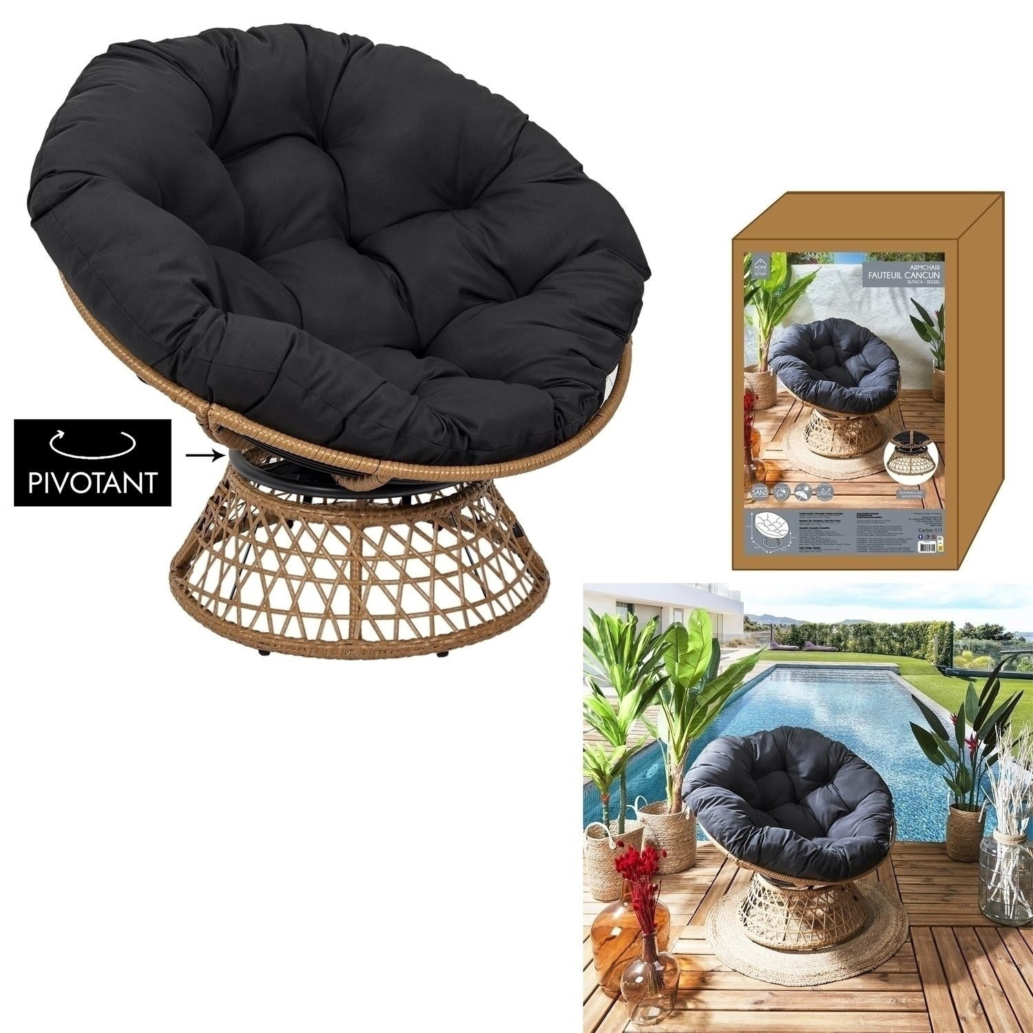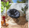 A Cancun fonott szék a természetes boho stílusra utal, amelyet a fa színű fonott elemek és a finom, könnyed formák jellemeznek. A szék pontosan ilyen. Puha, kerek ülőke párnával, amely levehető. A párnát a székkerethez szalagokkal rögzítjük, amelyeket megkötünk. A rattan fonatra utaló szék váza műanyaggal bevont fémből készült. A forgatható ülés nemcsak kényelmes pihenést tesz lehetővé, hanem például elfordulást is. a nap felé napozás közben a teraszon. A szék összeszerelést igényel. A szék alkalmas kültéri használatra (azonban a párnát védeni kell az időjárási hatásoktól) Max. terhelés 120 kg. Kartondoboz méretei: 95x65x32cm, Súly: 15,5kg
