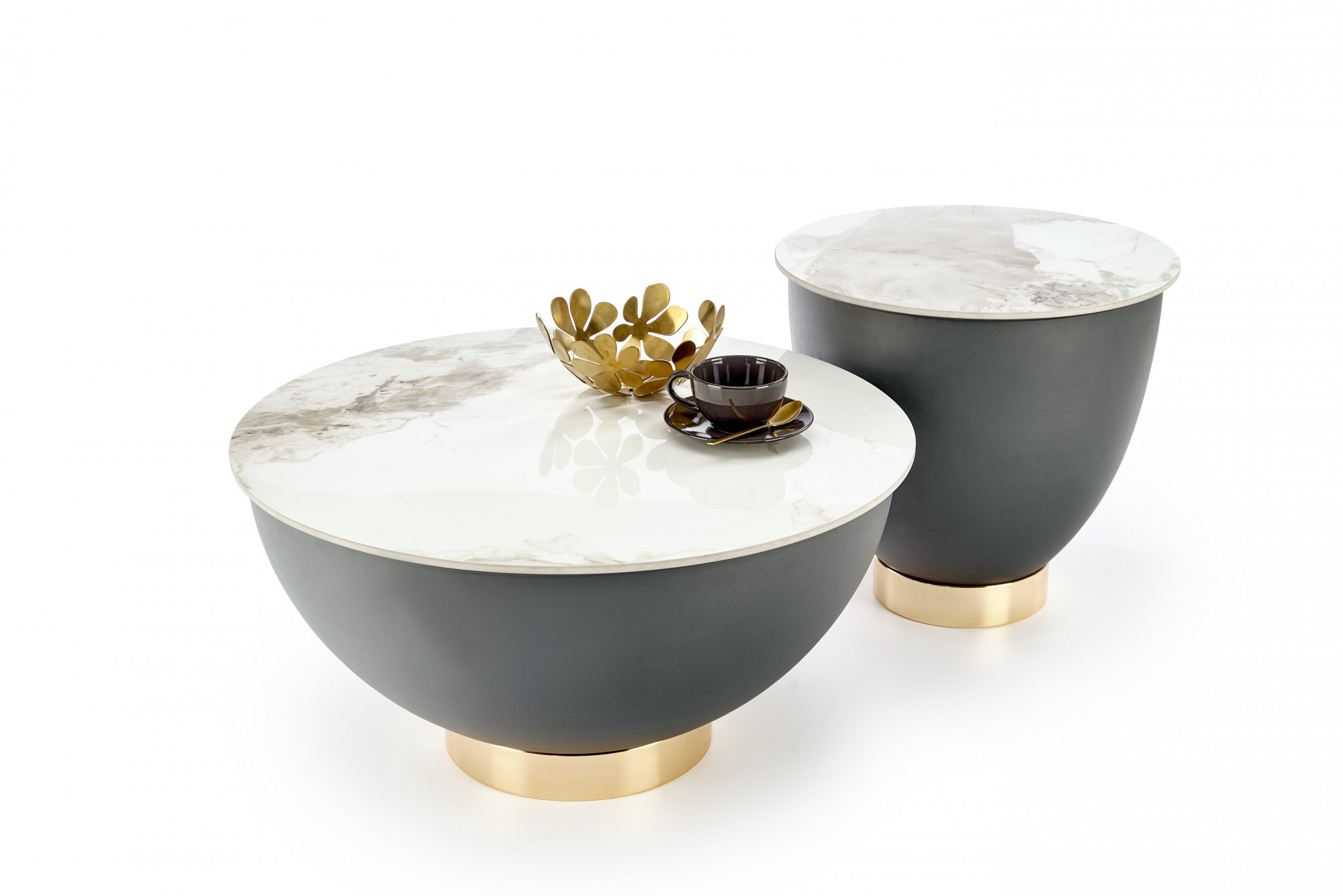A CECILIA S dohányzóasztal esztétikai és praktikus szempontok figyelembevételével lett tervezve. Felülete fehér márvány hatásával elegáns megjelenést kölcsönöz az asztalnak, amely könnyedén a nappali középpontjává válhat. A szürke és arany szín kombinációja harmonikus kontrasztot hoz létre, amely vonzza a figyelmet és egyedi jelleget kölcsönöz a térnek.