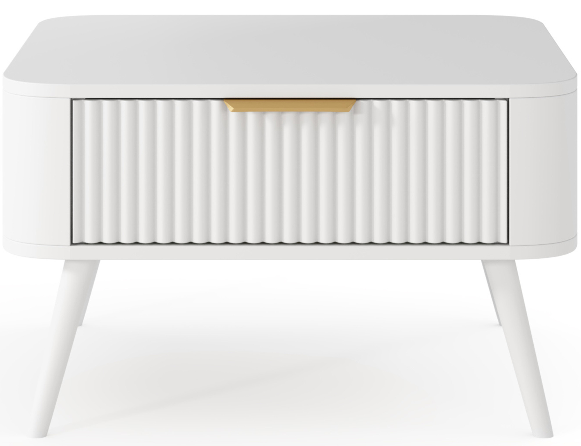 Chavelle Coffee Table (67x40x67 cm) is a modern piece that combines elegance with functionality, perfectly complementing a modern living room arrangement. The table front is made from durable MDF with an aesthetically pleasing ABS edge finish and a fluted surface that gives the piece a unique character. The laminated chipboard body ensures durability and resistance to everyday use. The table features one practical drawer on a roller slide, allowing for smooth and silent opening. The 20 cm high white wooden legs provide a sense of lightness and a modern look, while the golden metal handle adds a refined stylistic accent. The Chavelle coffee table is an excellent choice for those who appreciate sophisticated design and user comfort in stylish interiors