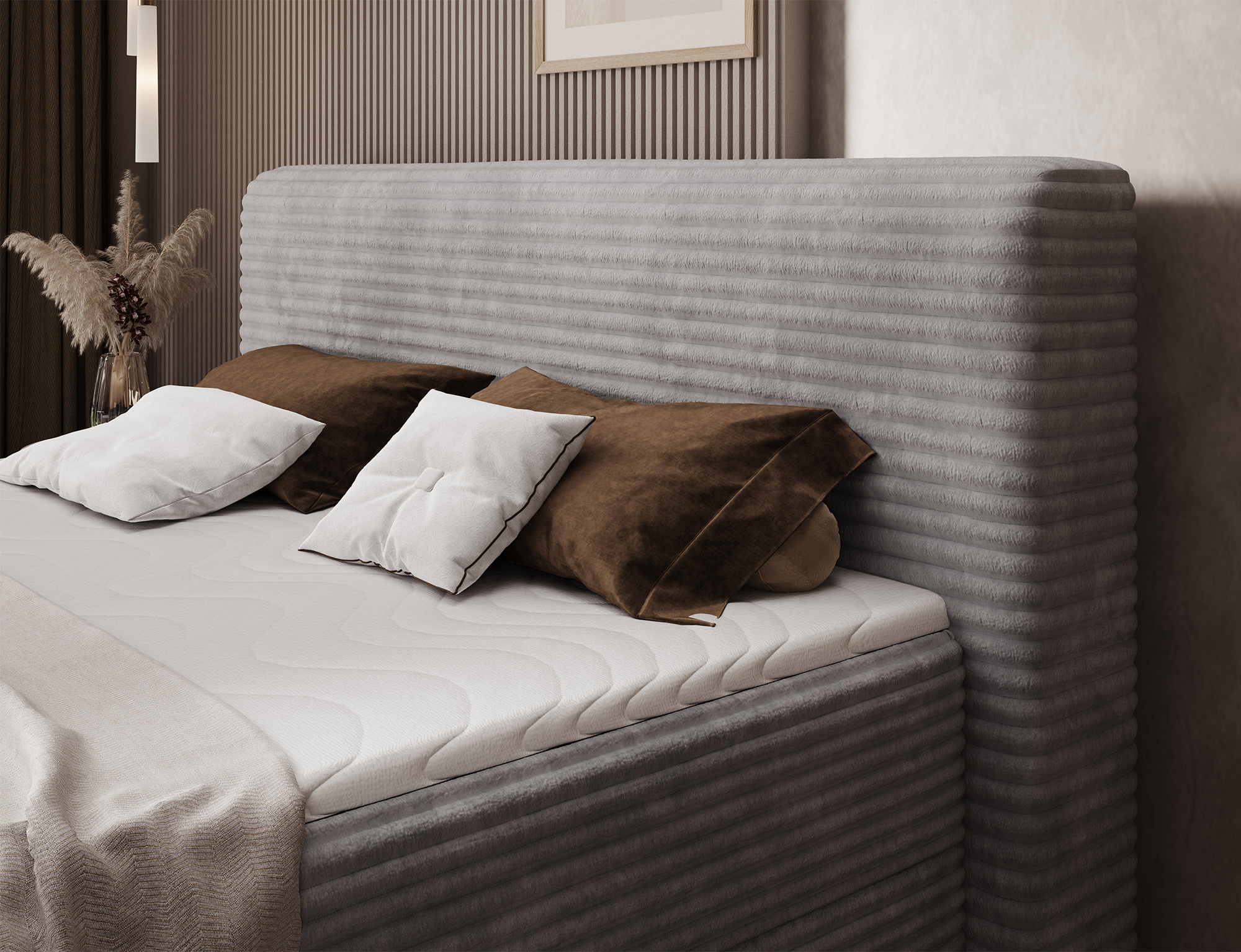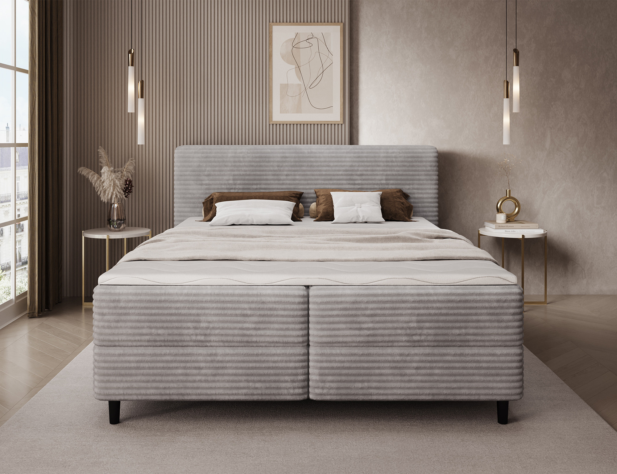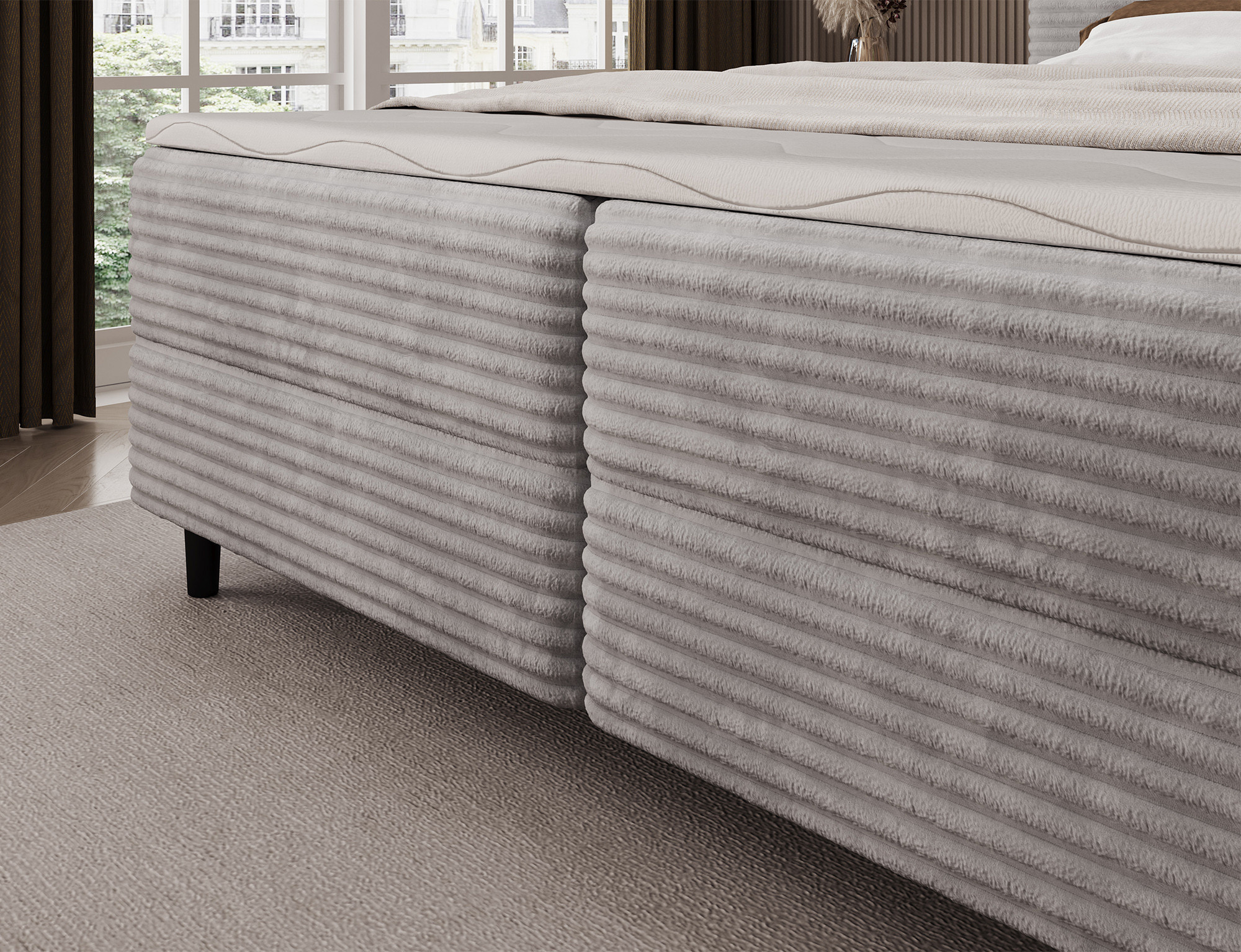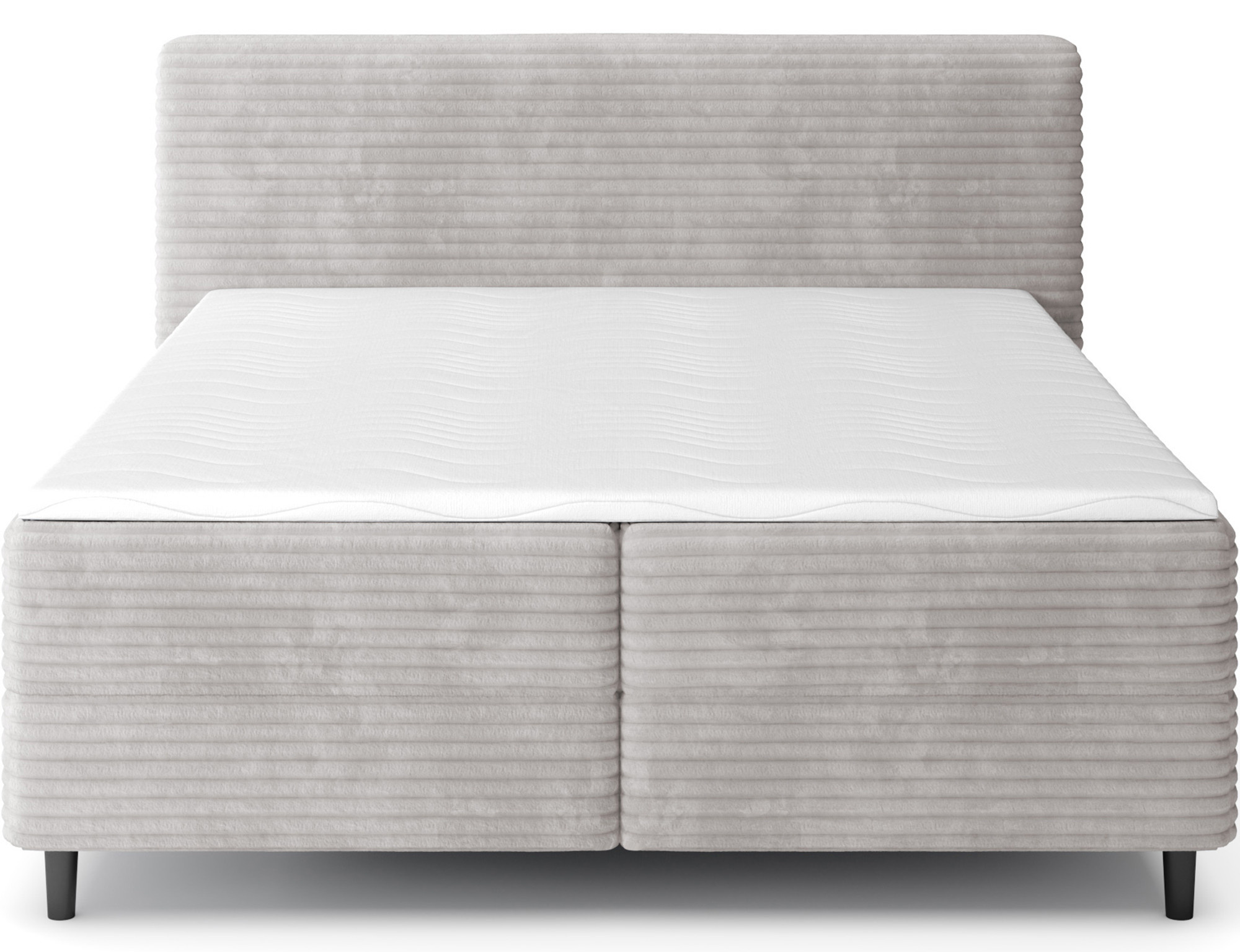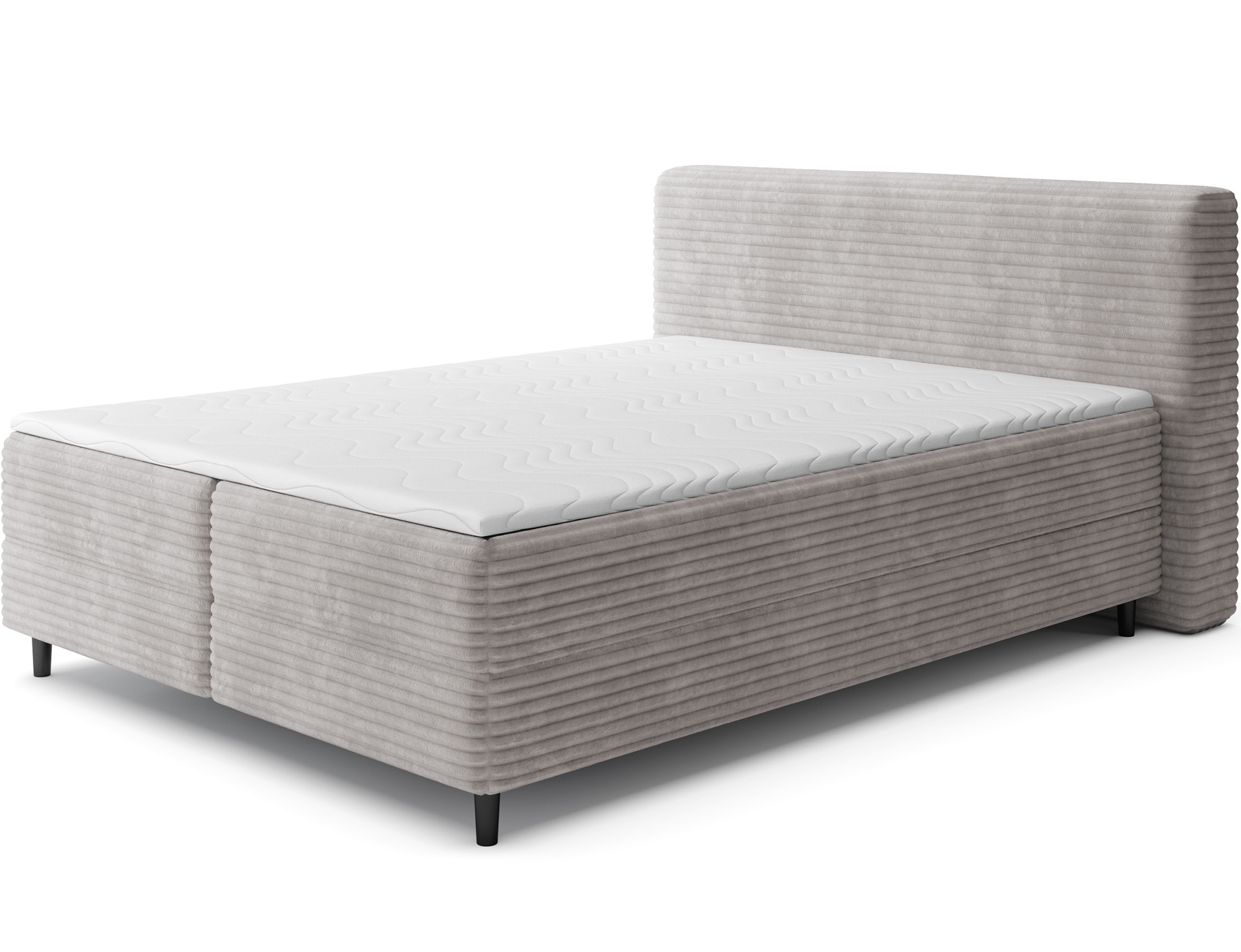 The Cortiko continental bed is an elegant and comfortable choice for lovers of modern style. Available in three size variants: 140x200 cm, 160x200 cm, and 180x200 cm, it allows you to perfectly adjust the width to your needs – 162 cm, 182 cm, or 202 cm respectively. The total height of the bed is 102 cm, and the depth is 222 cm, giving the structure a stable and well-balanced look. Inside, the combination of Bonell springs and T2540 foam ensures excellent body support and high sleeping comfort. The Cortiko model is equipped with a practical bedding storage compartment, allowing you to keep your bedroom tidy and make the most of your space. The design is completed with black wooden furniture legs that add elegance and lightness. With its modern design, the Cortiko bed perfectly complements both minimalist and more expressive interiors, serving as a stylish and functional centerpiece for any bedroom.