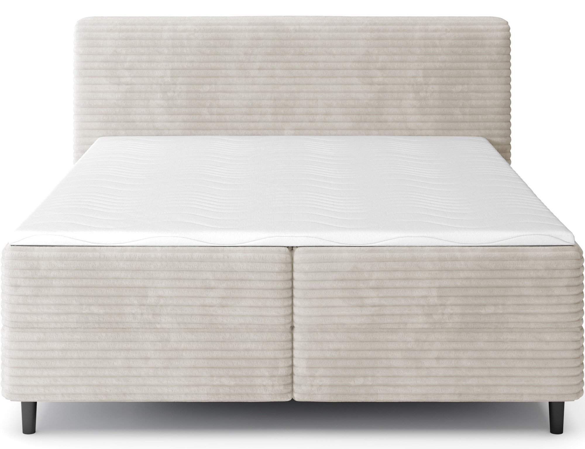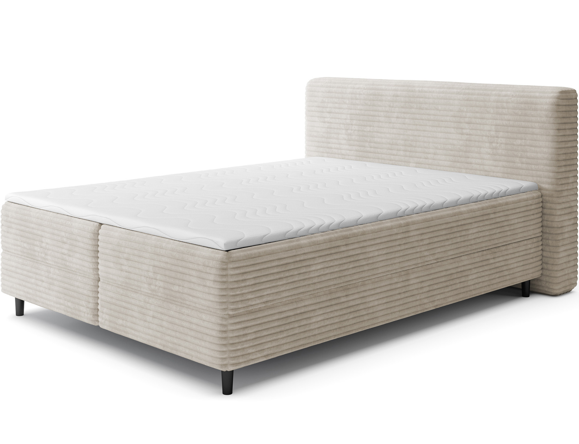 The Cortiko continental bed is an elegant and comfortable choice for lovers of modern style. Available in three size variants: 140x200 cm, 160x200 cm, and 180x200 cm, it allows you to perfectly adjust the width to your needs – 162 cm, 182 cm, or 202 cm respectively. The total height of the bed is 102 cm, and the depth is 222 cm, giving the structure a stable and well-balanced look. Inside, the combination of Bonell springs and T2540 foam ensures excellent body support and high sleeping comfort. The Cortiko model is equipped with a practical bedding storage compartment, allowing you to keep your bedroom tidy and make the most of your space. The design is completed with black wooden furniture legs that add elegance and lightness. With its modern design, the Cortiko bed perfectly complements both minimalist and more expressive interiors, serving as a stylish and functional centerpiece for any bedroom.