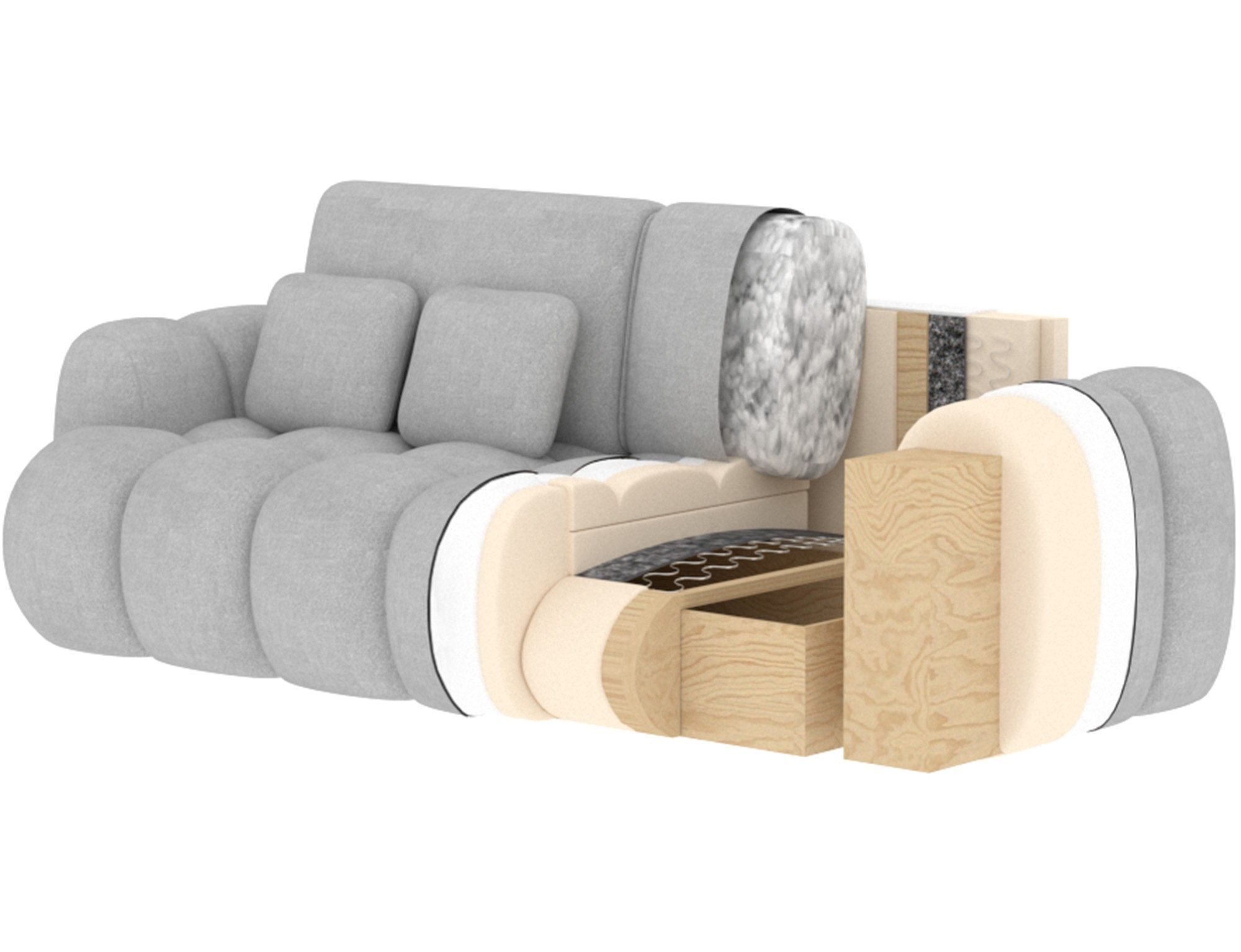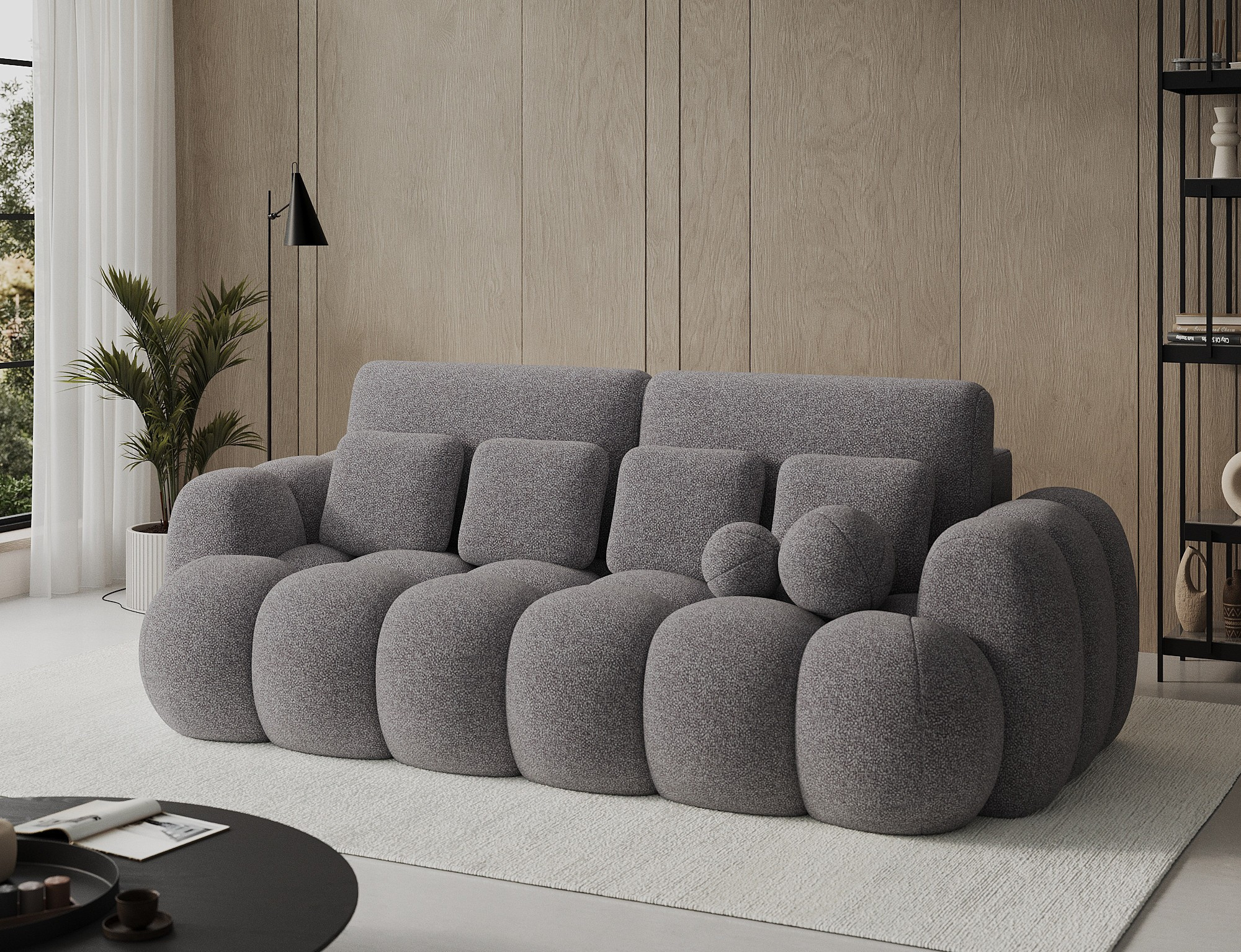 The Cotonn sofa, measuring 256 x 105 x 119 cm, is a modern sofa with a sleeping function and bedding storage, combining elegant design with exceptional comfort. The seat is filled with B-type wave springs, HR3030 high-resilience foam, and T2315 foam, ensuring excellent support and comfort for both sitting and everyday sleeping. Thanks to the intuitive Dolphin mechanism, converting the sofa into a bed is quick and easy, while the spacious bedding container offers practical storage space. The sofa is equipped with black legs made of durable plastic, and its upholstered back allows it to look great even when placed in the center of the room. Decorative cushions are included, adding coziness and emphasizing the contemporary character of the piece. Cotonn is the perfect choice for anyone looking for a stylish and functional sofa for the living room, offering aesthetics, practicality, and maximum comfort.