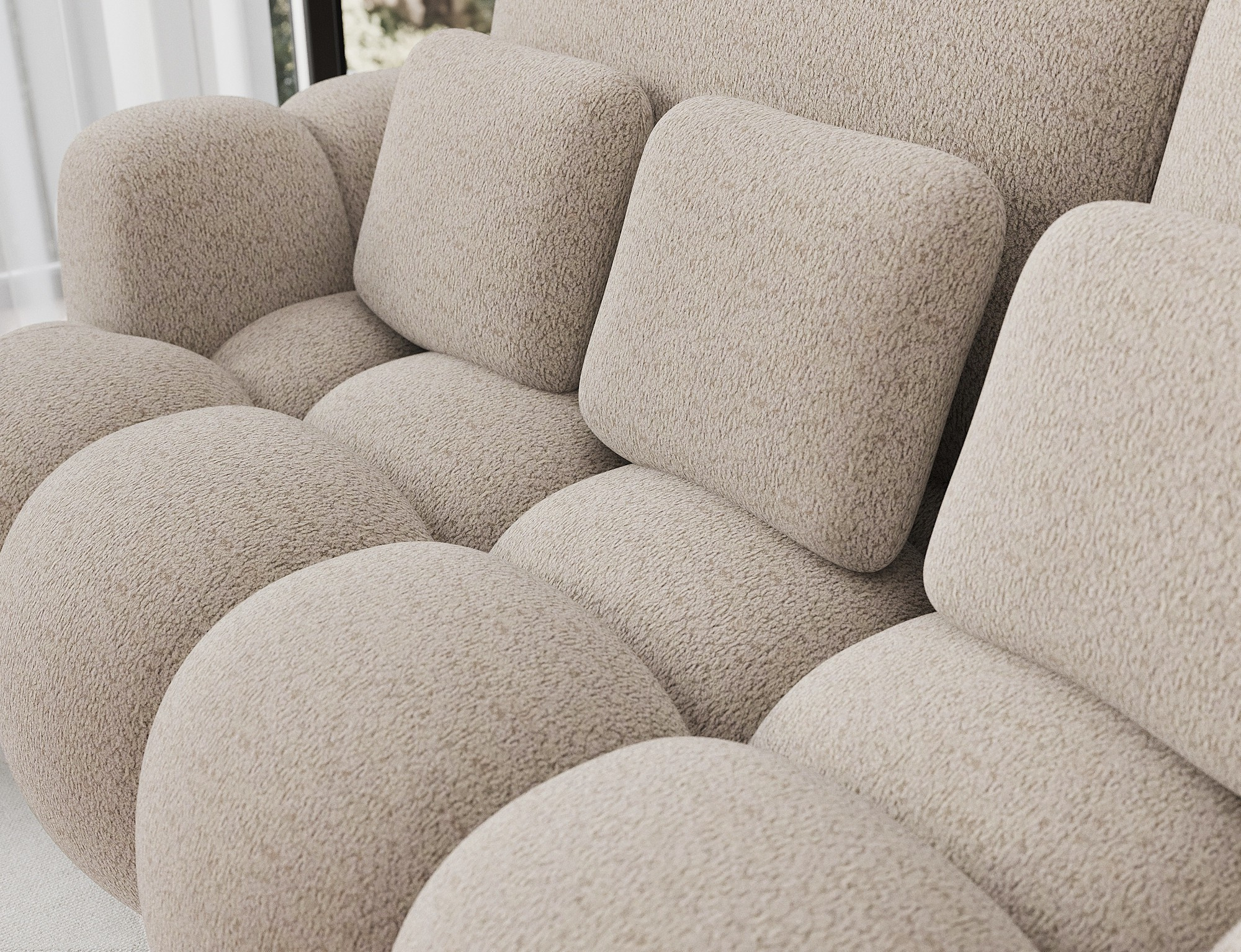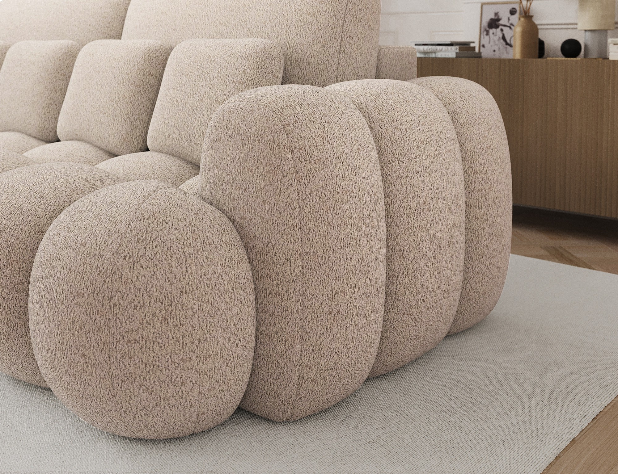 The Cotonn sofa, measuring 256 x 105 x 119 cm, is a modern sofa with a sleeping function and bedding storage, combining elegant design with exceptional comfort. The seat is filled with B-type wave springs, HR3030 high-resilience foam, and T2315 foam, ensuring excellent support and comfort for both sitting and everyday sleeping. Thanks to the intuitive Dolphin mechanism, converting the sofa into a bed is quick and easy, while the spacious bedding container offers practical storage space. The sofa is equipped with black legs made of durable plastic, and its upholstered back allows it to look great even when placed in the center of the room. Decorative cushions are included, adding coziness and emphasizing the contemporary character of the piece. Cotonn is the perfect choice for anyone looking for a stylish and functional sofa for the living room, offering aesthetics, practicality, and maximum comfort.