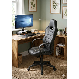 Az elegáns fekete-szürke kivitel időtlen hatást kelt, és könnyen illeszkedik különböző belső terekhez - a minimalista stílusúaktól a klasszikusan berendezett helyiségekig.A szék kiváló minőségű öko bőrrel van kárpitozva, amely nemcsak kellemes tapintású, hanem tartós és könnyen karbantartható is. Ergonomikusan formázott háttámla kifejezett oldalsó támasztékkal biztosítja a hát támogatását és segíti a helyes testtartást. A háttámla tetején lévő praktikus nyílás sportosabb megjelenést kölcsönöz a széknek.