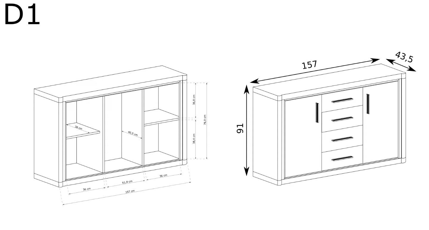 A terjedelmes komód négy funkcionális nagy fiókkal és két polcos szekrénnyel rendelkezik.