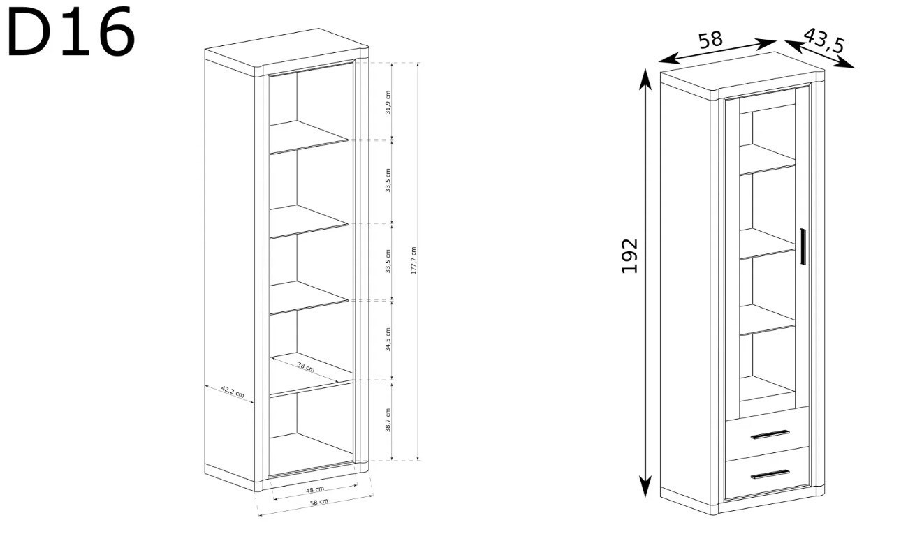 Három üvegpolc a vitrin belsejében egyedivé teszi, csodálatosan néz ki, és mindenképpen magára vonja a figyelmet. A polcokon kívül a bútor két fiókkal rendelkezik, amelyek nagyon funkcionálisak, ideálisak apróságok, kiegészítők tárolására. Fém fogantyúk, amelyek illeszkednek a fekete dekorációkhoz lamellák formájában, sok jó benyomást keltenek mindenki számára. Kapható két színben.