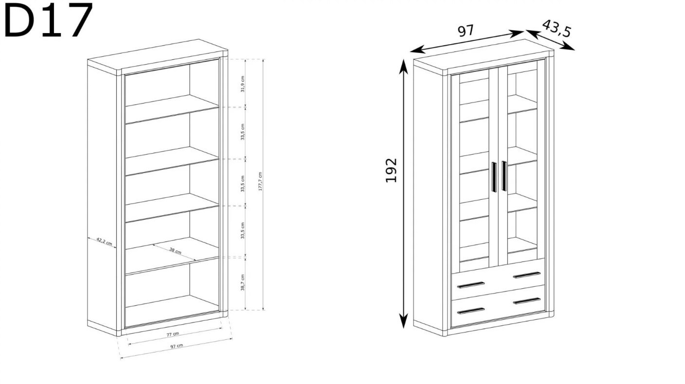 A 48 mm vastag laminált panelek nagyszerű választás a vitrin biztonságának biztosítására. Belül három gyönyörű üvegpolcot talál, amelyeken tökéletesen kiállíthatja tárgyait. Két aljzat is ugyanúgy működik. A vitrinek gyönyörű és eredeti szélei fekete lamellák és fém fogantyúk formájában vannak, amelyek csodálatosan néznek ki és felkeltik a figyelmet. Kapható két színben.