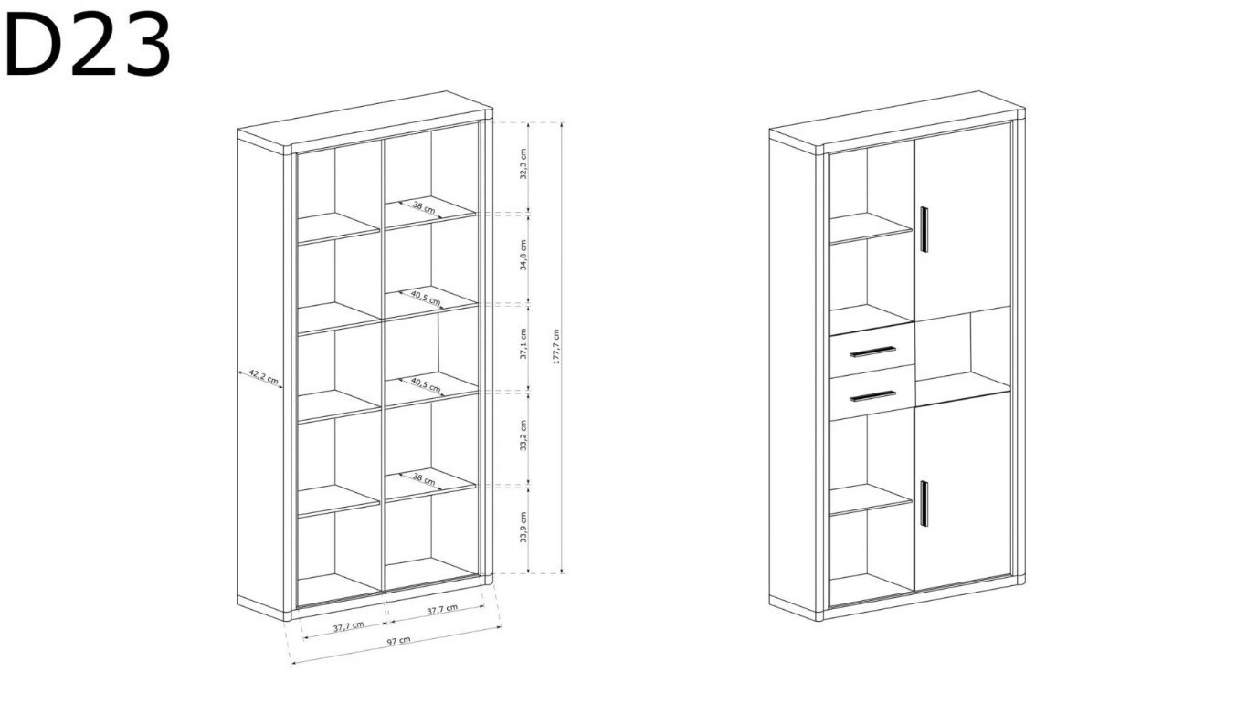 Öt polca van (plus egy-egy minden szekrényben), két fiókja és két szekrénye. Ennek a bútordarabnak köszönhetően rengeteg lehetősége van a dolgai elrendezésére. A fém fogantyúk tökéletes egységet alkotnak a fekete lamellákkal, amelyek dekorációként jelennek meg. A bútornak egyedi kialakítása van, amely biztosan felkelti mindenki figyelmét, aki meglátja. Az ezzel a könyvtárral való elrendezések biztosan egyediek lesznek. Kapható két színváltozatban.