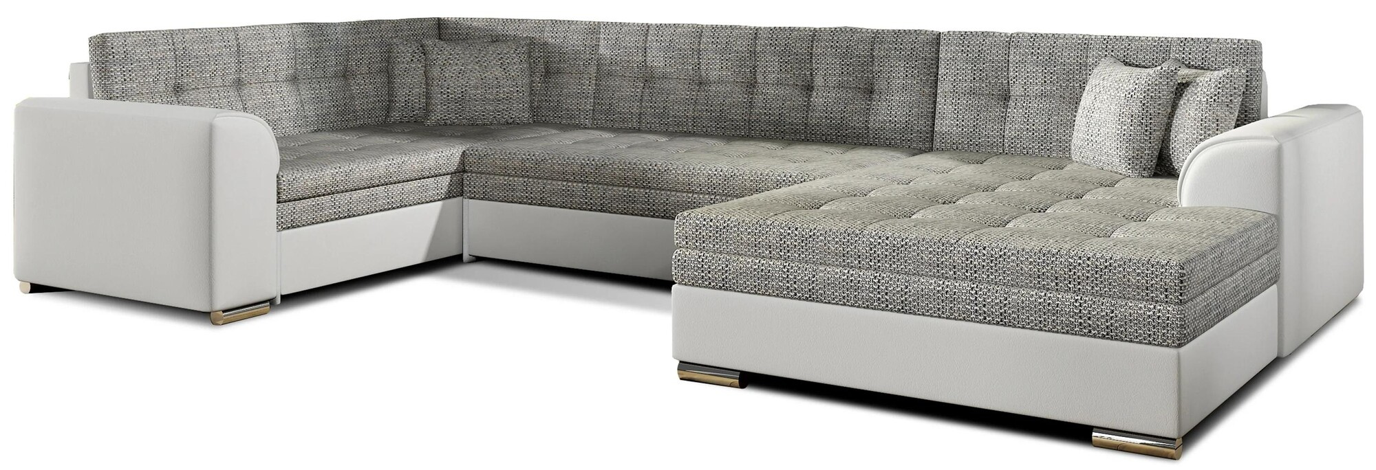 Damario is a spacious, exceptionally stylish and tasteful corner unit of a large size with dimensions of 338 x 189 x 78 cm. This U-shaped piece of furniture has a comfortable, soft seat made of a durable wave spring, as well as elastic T30 foam, which is resistant to damage, deformation and all types ofscratches. Additionally, our corner sofa bed has a sleeping function. The designated area, obtained thanks to an automated and intuitive dolphin-type mechanism, is 275 x 126 cm. The characteristic features of the Damario corner sofa bed include: a comfortable 40 cm seat, streamlined armrests, contoured backrests, decorative cushions included. In addition, we can also indicate elegant legs,as well as the multitude of available colour variants in which our corner unit is available. Damario is a dream come true for furnishing a spacious living room. Here you will find everything you need to achieve maximum comfort both at night and during the day.