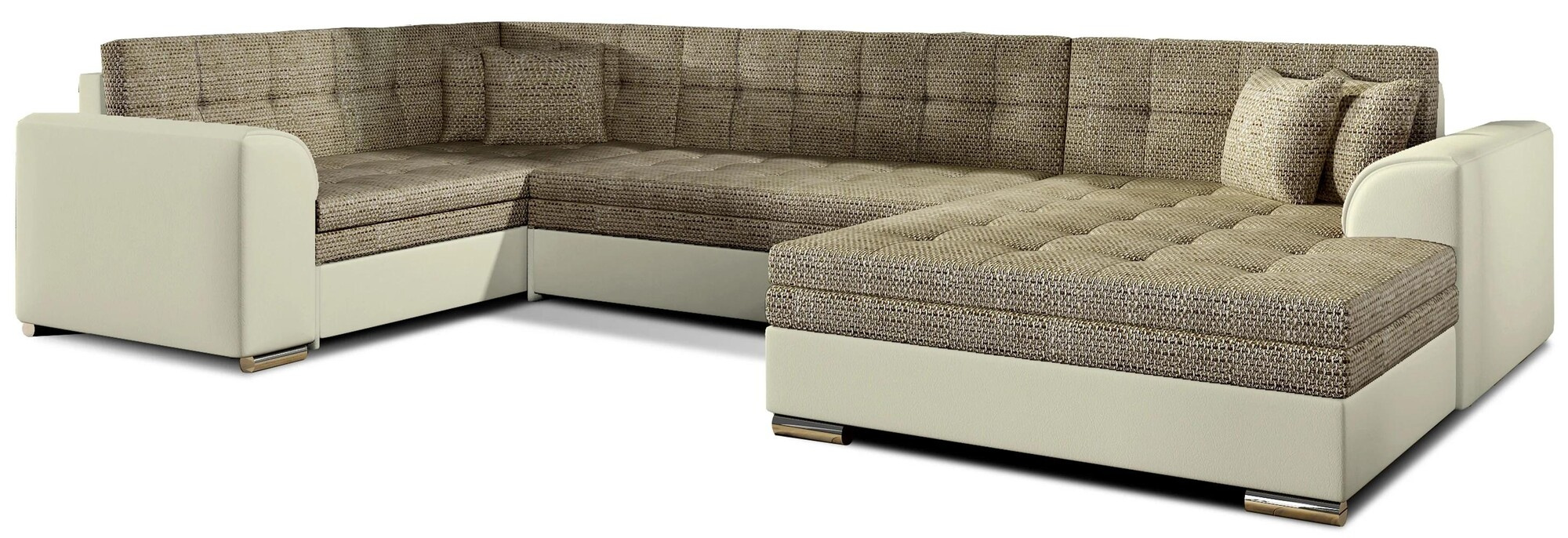 Damario is a spacious, exceptionally stylish and tasteful corner unit of a large size with dimensions of 338 x 189 x 78 cm. This U-shaped piece of furniture has a comfortable, soft seat made of a durable wave spring, as well as elastic T30 foam, which is resistant to damage, deformation and all types ofscratches. Additionally, our corner sofa bed has a sleeping function. The designated area, obtained thanks to an automated and intuitive dolphin-type mechanism, is 275 x 126 cm. The characteristic features of the Damario corner sofa bed include: a comfortable 40 cm seat, streamlined armrests, contoured backrests, decorative cushions included. In addition, we can also indicate elegant legs,as well as the multitude of available colour variants in which our corner unit is available. Damario is a dream come true for furnishing a spacious living room. Here you will find everything you need to achieve maximum comfort both at night and during the day.