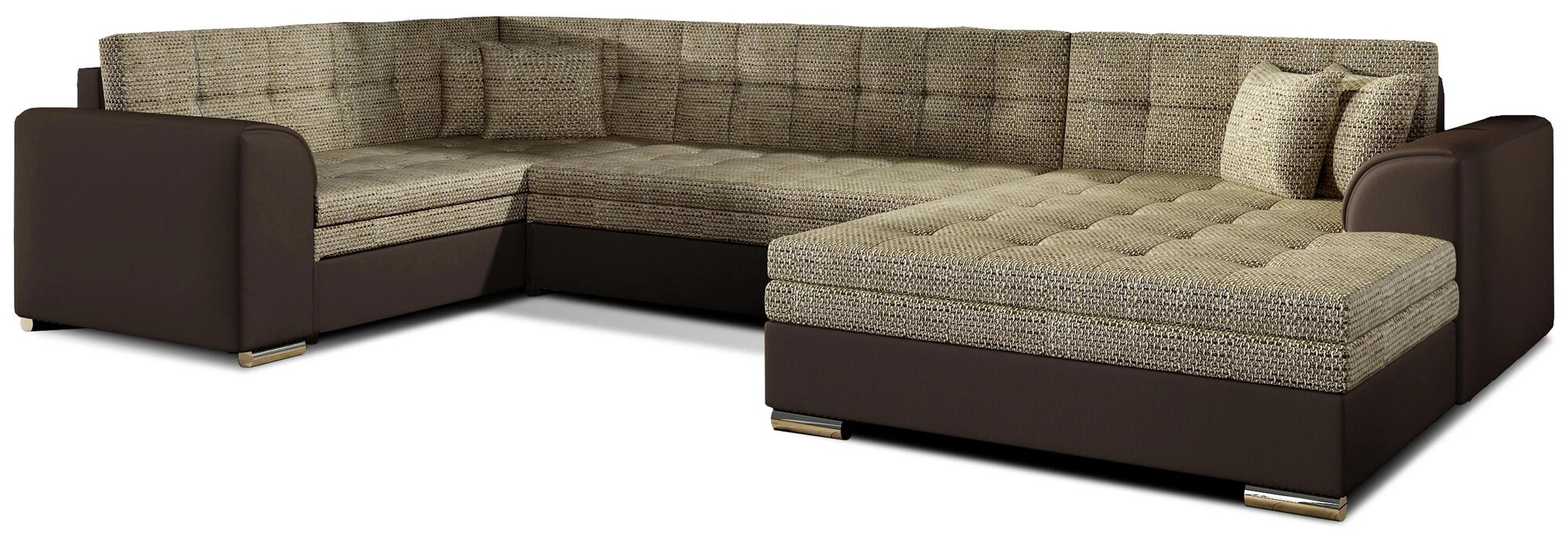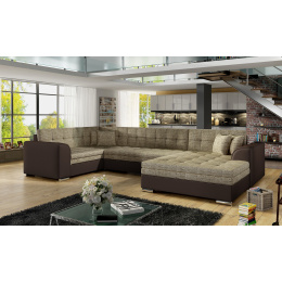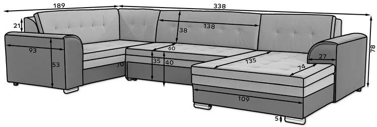Damario is a spacious, exceptionally stylish and tasteful corner unit of a large size with dimensions of 338 x 189 x 78 cm. This U-shaped piece of furniture has a comfortable, soft seat made of a durable wave spring, as well as elastic T30 foam, which is resistant to damage, deformation and all types ofscratches. Additionally, our corner sofa bed has a sleeping function. The designated area, obtained thanks to an automated and intuitive dolphin-type mechanism, is 275 x 126 cm. The characteristic features of the Damario corner sofa bed include: a comfortable 40 cm seat, streamlined armrests, contoured backrests, decorative cushions included. In addition, we can also indicate elegant legs,as well as the multitude of available colour variants in which our corner unit is available. Damario is a dream come true for furnishing a spacious living room. Here you will find everything you need to achieve maximum comfort both at night and during the day.