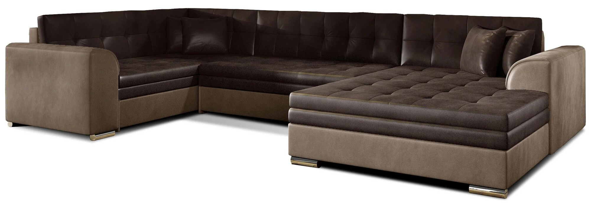 Damario is a spacious, exceptionally stylish and tasteful corner unit of a large size with dimensions of 338 x 189 x 78 cm. This U-shaped piece of furniture has a comfortable, soft seat made of a durable wave spring, as well as elastic T30 foam, which is resistant to damage, deformation and all types ofscratches. Additionally, our corner sofa bed has a sleeping function. The designated area, obtained thanks to an automated and intuitive dolphin-type mechanism, is 275 x 126 cm. The characteristic features of the Damario corner sofa bed include: a comfortable 40 cm seat, streamlined armrests, contoured backrests, decorative cushions included. In addition, we can also indicate elegant legs,as well as the multitude of available colour variants in which our corner unit is available. Damario is a dream come true for furnishing a spacious living room. Here you will find everything you need to achieve maximum comfort both at night and during the day.