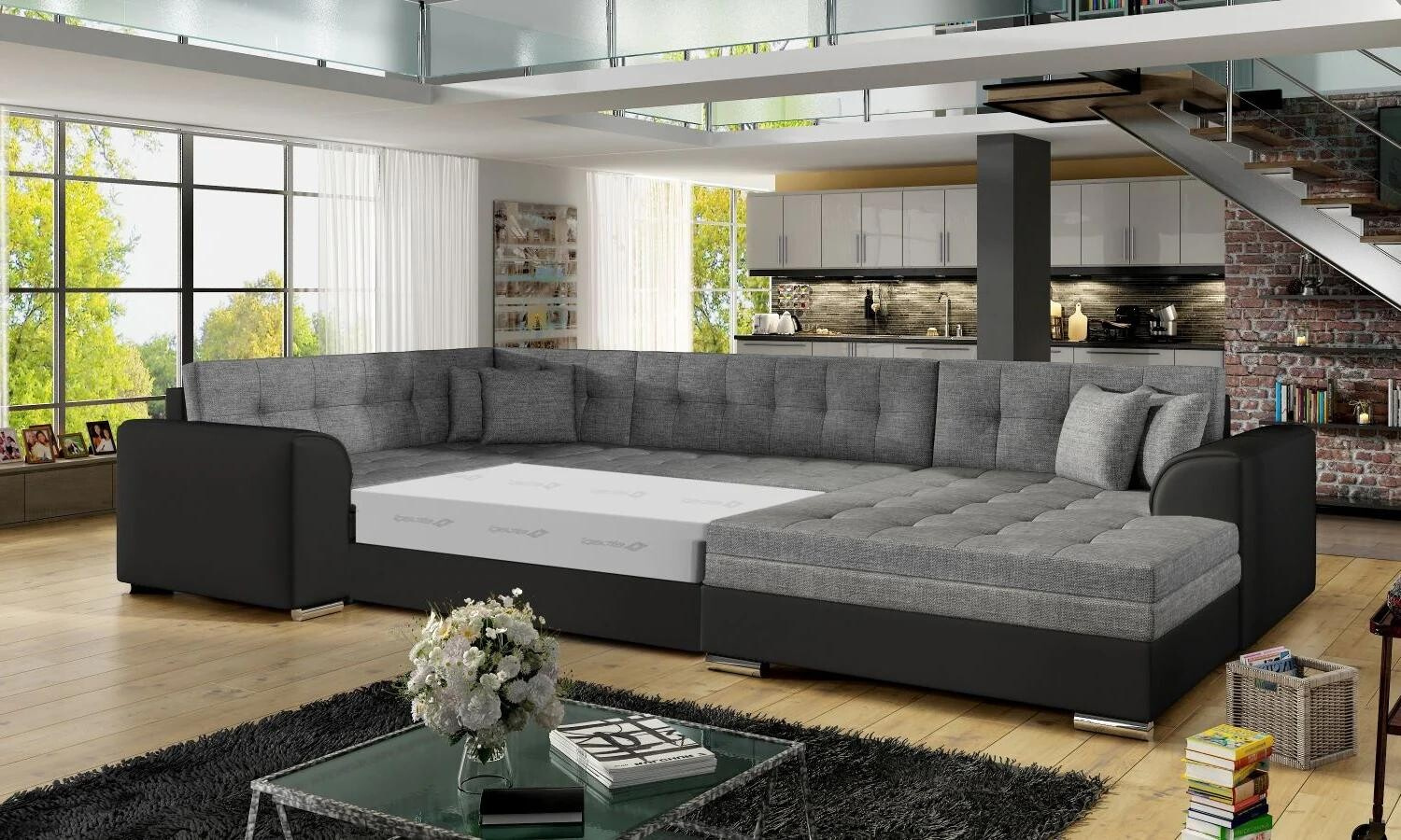 Damario is a spacious, exceptionally stylish and tasteful corner unit of a large size with dimensions of 338 x 189 x 78 cm. This U-shaped piece of furniture has a comfortable, soft seat made of a durable wave spring, as well as elastic T30 foam, which is resistant to damage, deformation and all types ofscratches. Additionally, our corner sofa bed has a sleeping function. The designated area, obtained thanks to an automated and intuitive dolphin-type mechanism, is 275 x 126 cm. The characteristic features of the Damario corner sofa bed include: a comfortable 40 cm seat, streamlined armrests, contoured backrests, decorative cushions included. In addition, we can also indicate elegant legs,as well as the multitude of available colour variants in which our corner unit is available. Damario is a dream come true for furnishing a spacious living room. Here you will find everything you need to achieve maximum comfort both at night and during the day.