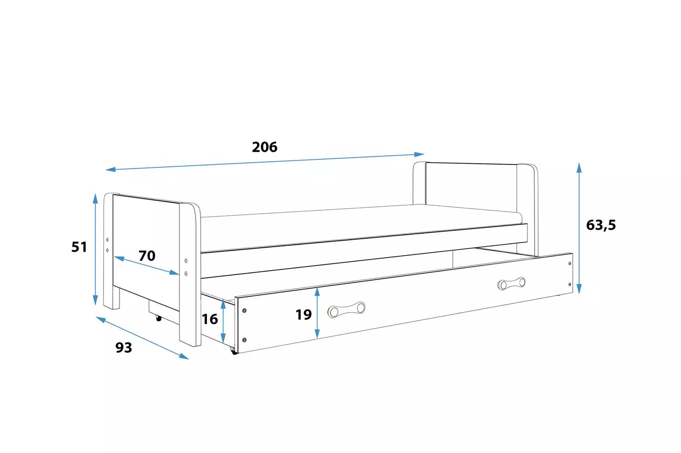 - Materac - rozmiar 200x80x9, ze zdejmowanym pokrowcem, włóknem klimatyzującym i pianką poliuretanową. Pokrowiec - pikowana tkanina hipoalergiczna, wykonana z poliestru, z zamkiem błyskawicznym.