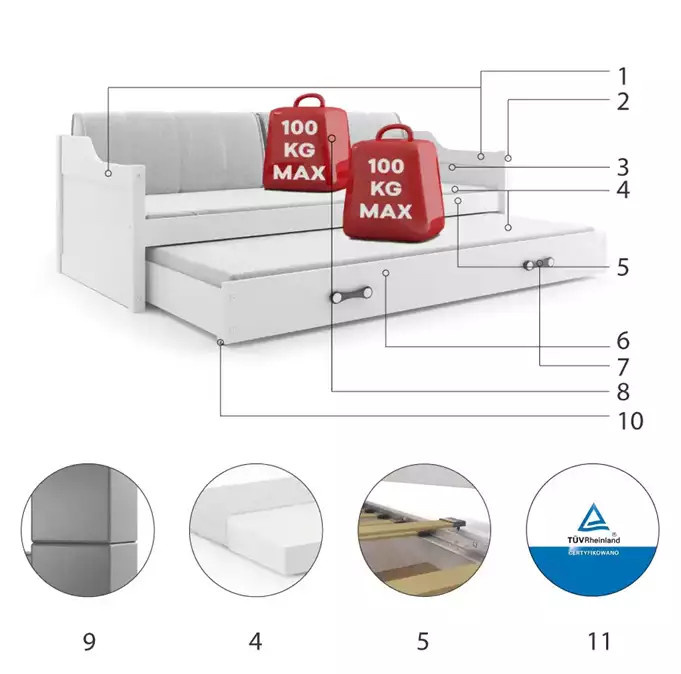 - Certyfikowane łóżko - jakość i bezpieczeństwo zgodnie z normami TUV.
