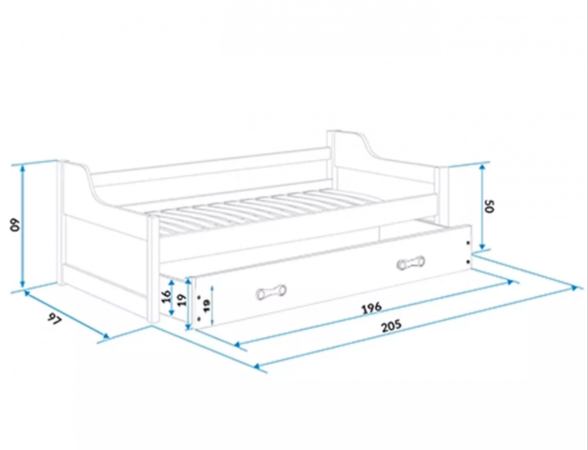 - Szuflada - wykonana z płyty wiórowej, posiada funkcję dodatkowego spania.