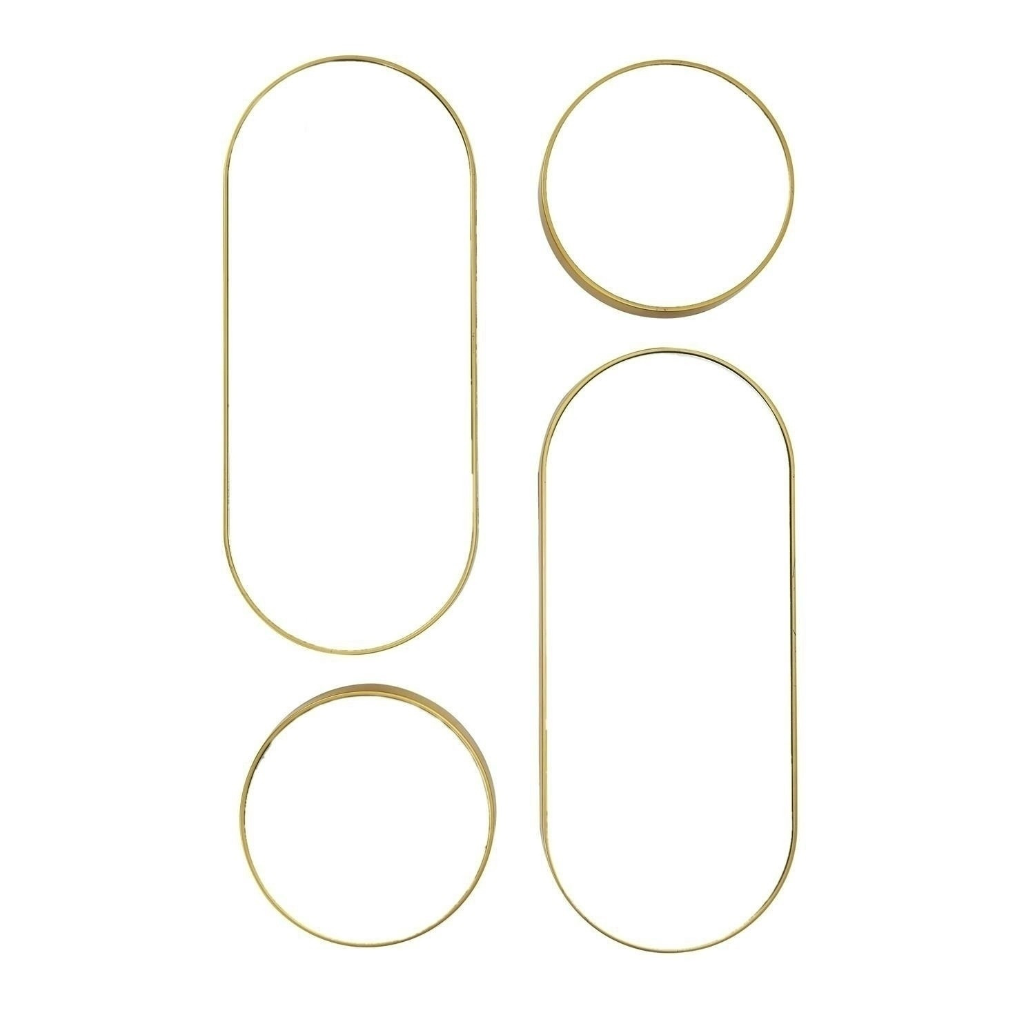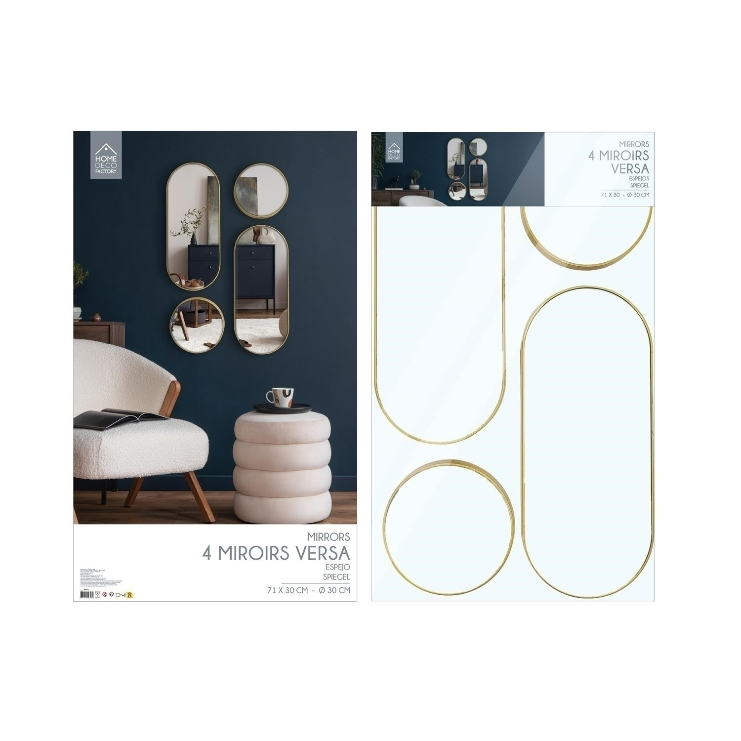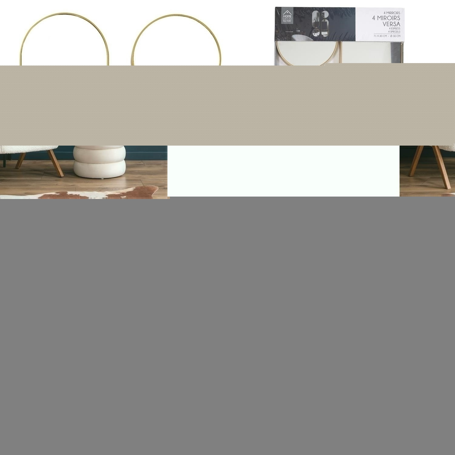 Négy art deco stílusú tükörkészlet tökéletesen illeszkedik a glamour stílusú belső térbe is. Négy arany színű keretbe foglalt tükör alkot egy érdekes kompozíciót, amelyet felakaszthatunk az előszoba vagy a nappali üres falára. Tükrök méretei: két nagy tükör 71x30 cm és két kis kerek tükör 30 cm átmérőjű. A tükrök keretei arany színű műanyagból készültek. A tükör tükre üveg. A csomag méretei: 103x62x4cm