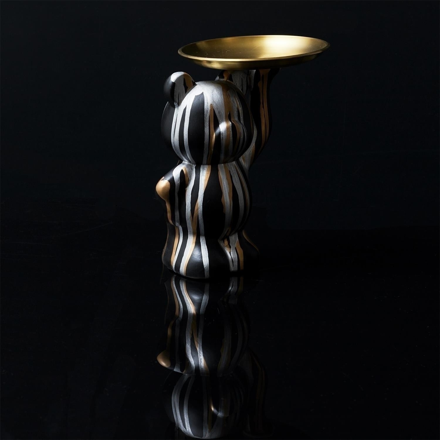 Stílusos medve alakú figura, praktikus tálcával felszerelve. Tökéletes dekoratív kiegészítőként a belső térbe, ideális apró kiegészítők, ékszerek kiállítására vagy elegáns alátétként apróságok számára. Modern kialakítása és funkcionalitása miatt kiváló választás minden helyiségbe. A termék hossza: 23 cm A termék magassága: 19 cm A termék mélysége: 15 cm Anyag: Polirezin, rozsdamentes acél