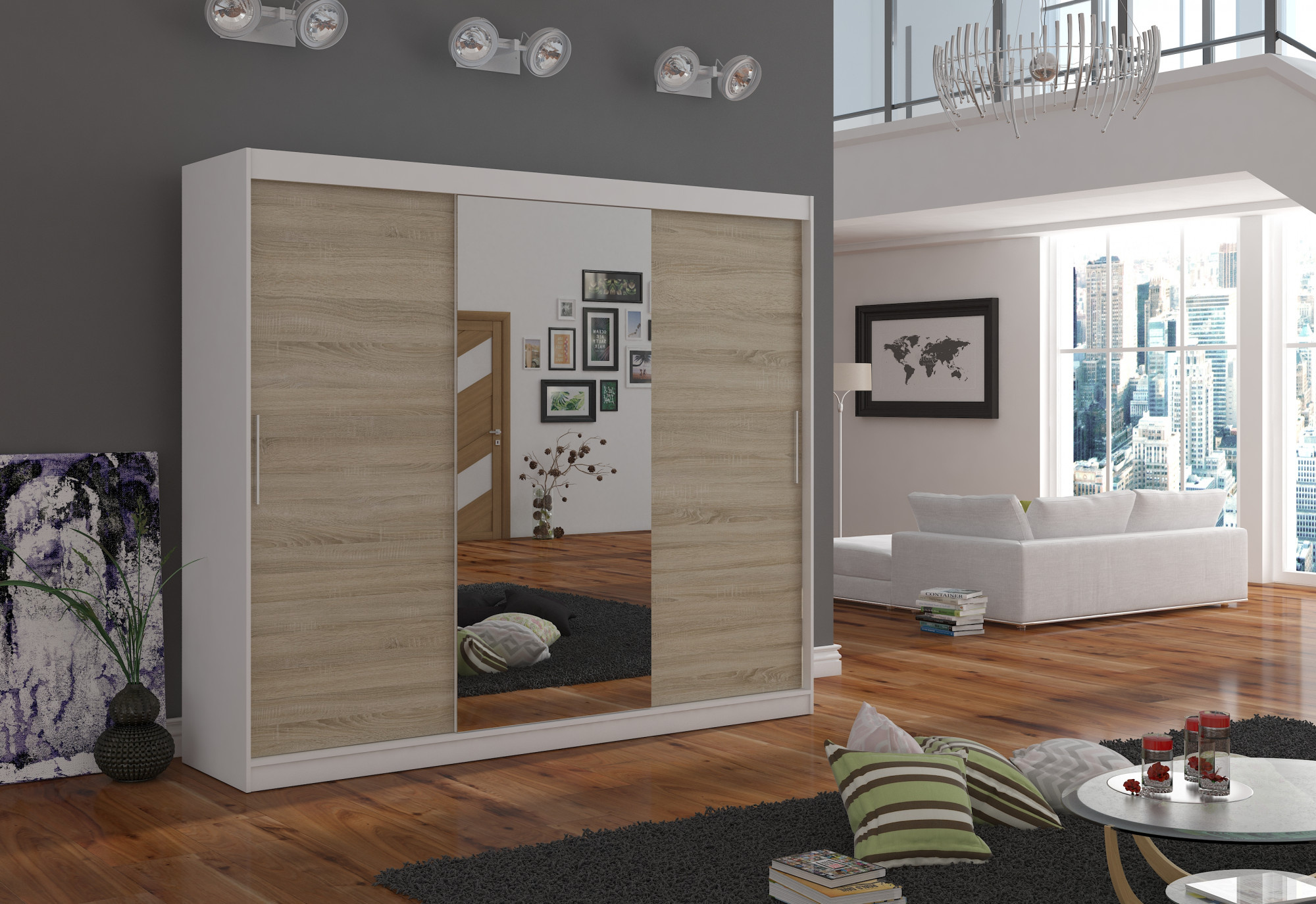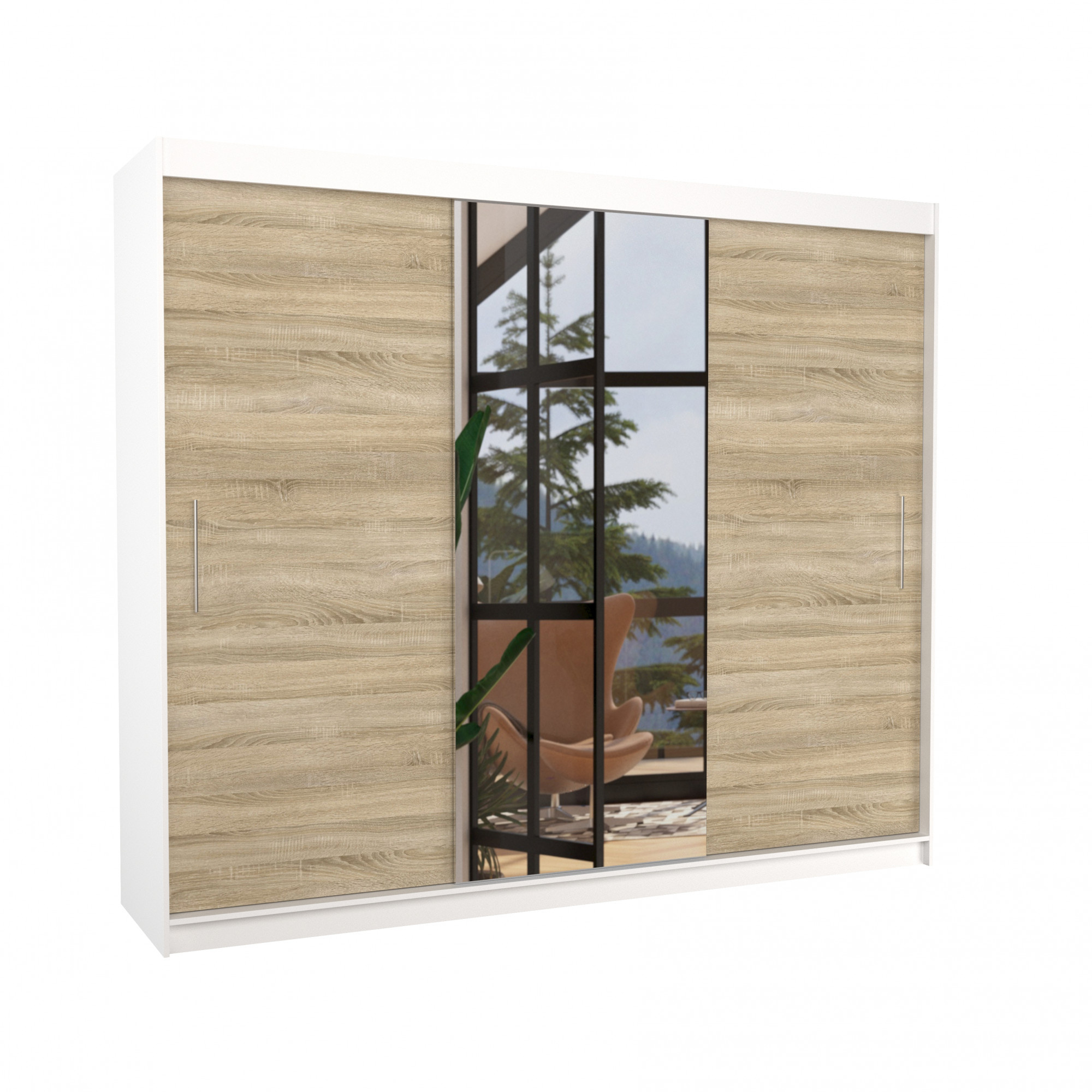 DENIS 250 tolóajtós és tükrös ruhásszekrény Fehér+Sonoma