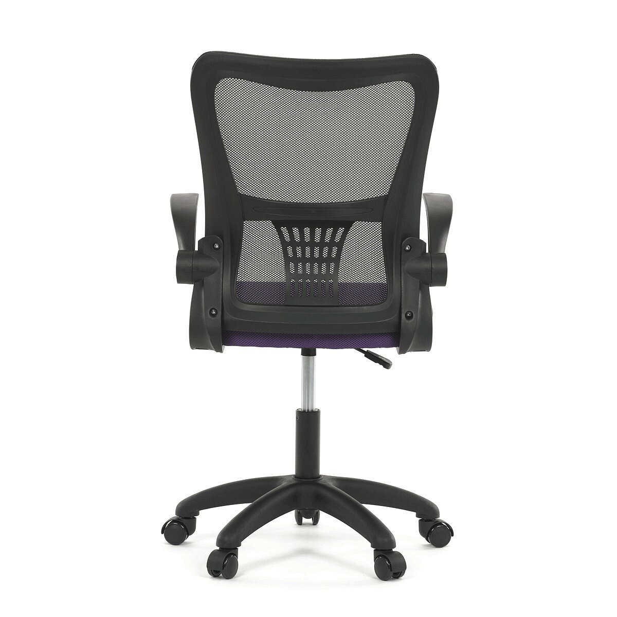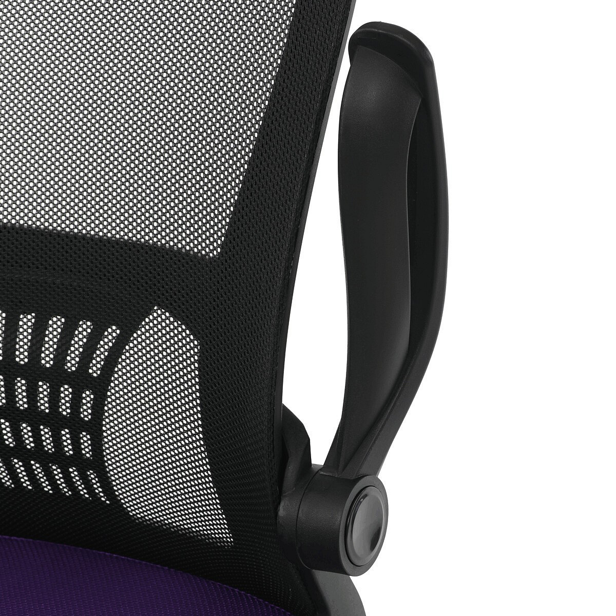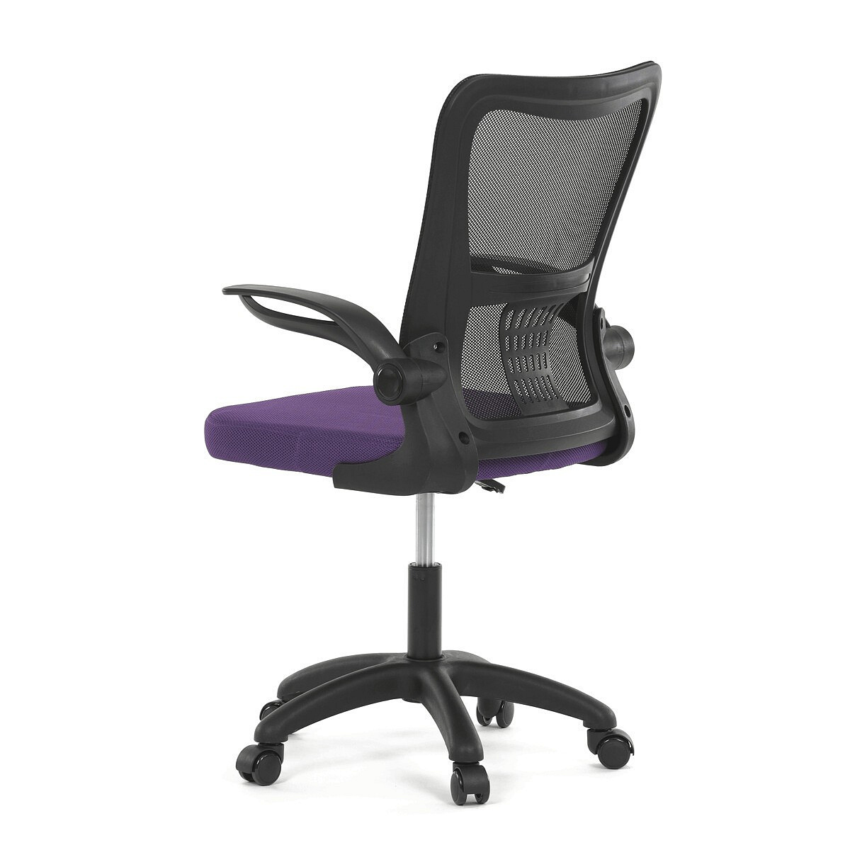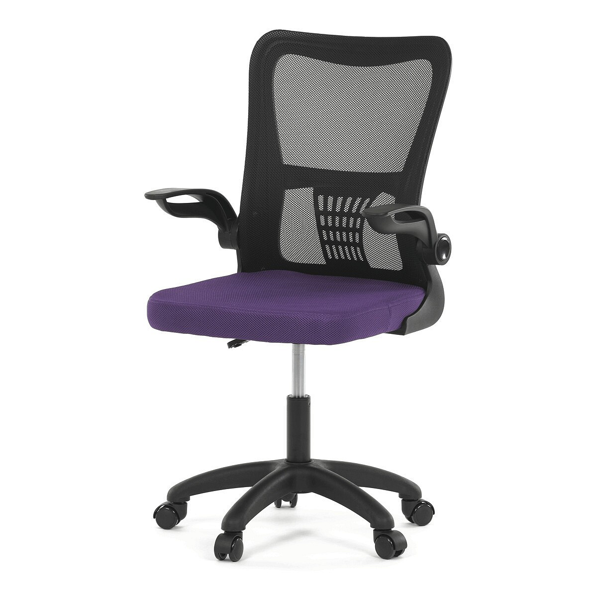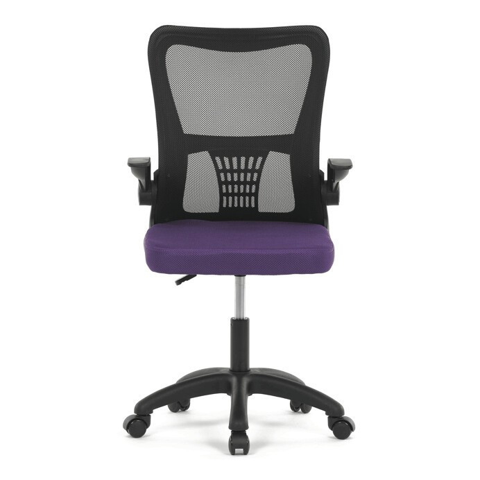 Kancelářská židle s označením KA-K2006 PUR nabízí komfortní sezení díky širokému sedáku potaženému fialovou látkou a prodyšnému opěráku z černé síťoviny, který zajišťuje optimální cirkulaci vzduchu během práce. Odklápěcí plastové područky umožňují snadné přizpůsobení prostoru a usnadňují zasunutí židle pod stůl. Židle je vybavena houpacím mechanismem s možností nastavení výšky sedáku, což přispívá k ergonomii a individuálnímu nastavení podle potřeb uživatele. Bederní opěrka integrovaná v opěráku podporuje správné držení těla a snižuje únavu zad. Stabilní plastový kříž s kolečky určenými pro tvrdé povrchy zajišťuje mobilitu a bezpečné používání na různých typech podlah.