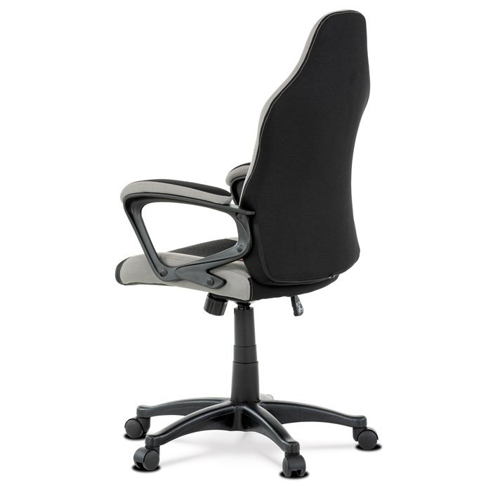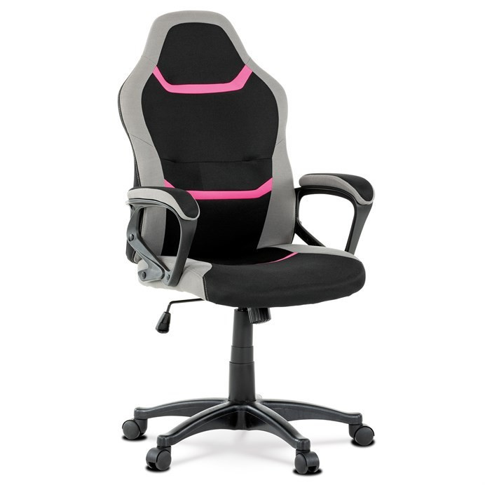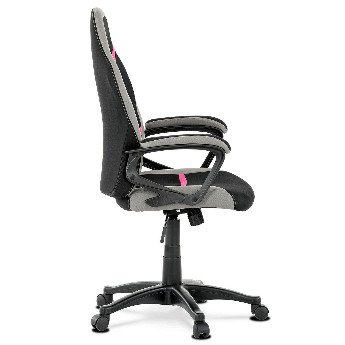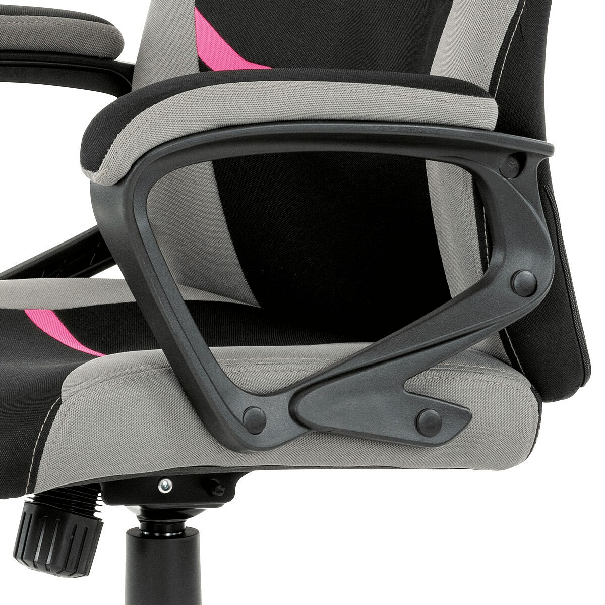 Elegantní kancelářská i herní židle se zaoblenými liniemi, obvodovým prošitím v šedé barvě a výrazným tvarovým prošitím sedáku i opěráku. Potah je kombinací černé a světle šedé látky hladké látky s decentním růžovým detailem na opěráku i sedáku. Polstrování je z kvalitní PU pěny. Židle je vybavena houpacím mechanismem s nastavením protiváhy a aretací v základní poloze. Tuhost protiváhy lze regulovat velkým plastovým šroubem, umístěným pod sedákem. Výška sezení se upravuje páčkou na pravé straně přes kvalitní plynový píst. Znavené ruce si velice pohodlně položíte na plastové područky, na ložné ploše polstrované černou a šedou látkou. Šíře područek je úžasných 7,5 cm, ložná plocha 31 cm a výška 3 cm. Opěrák je vyšší, částečně prodyšný a s integrovanou statickou opěrkou hlavy. Zvýšené okraje sedáku i opěráku podporují správné držení těla i páteře a slouží jako výborná opora. Kříž je černý plastový o průměru je 65 cm, což zajišťuje výbornou stabilitu i u fyzicky náročnějších her. Kolečka jsou plastová pr. 5 cm. Nosnost židle je až 120 kg.